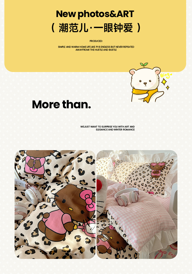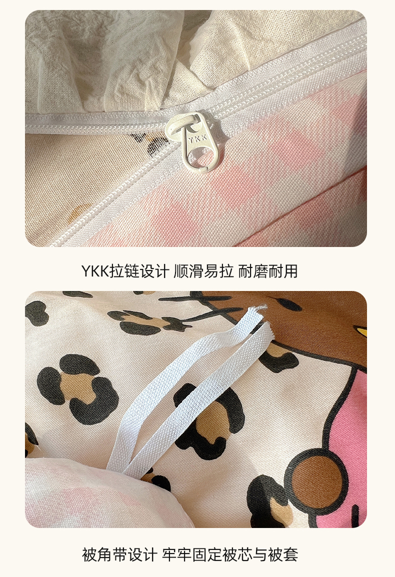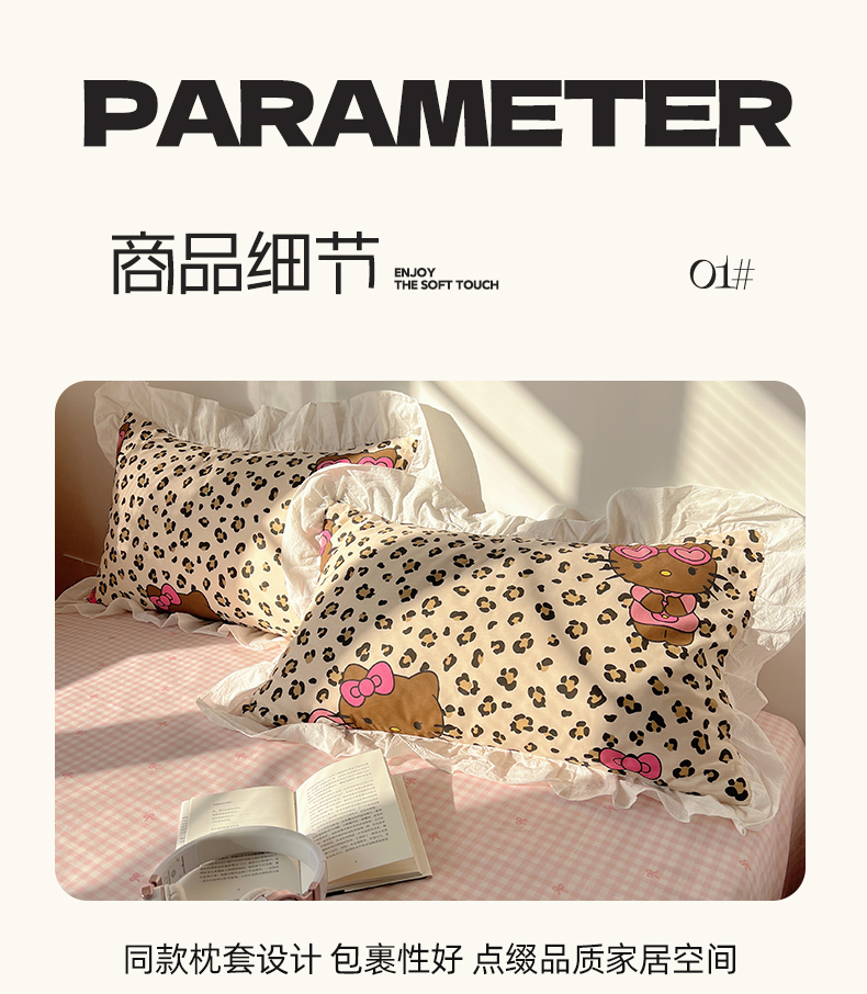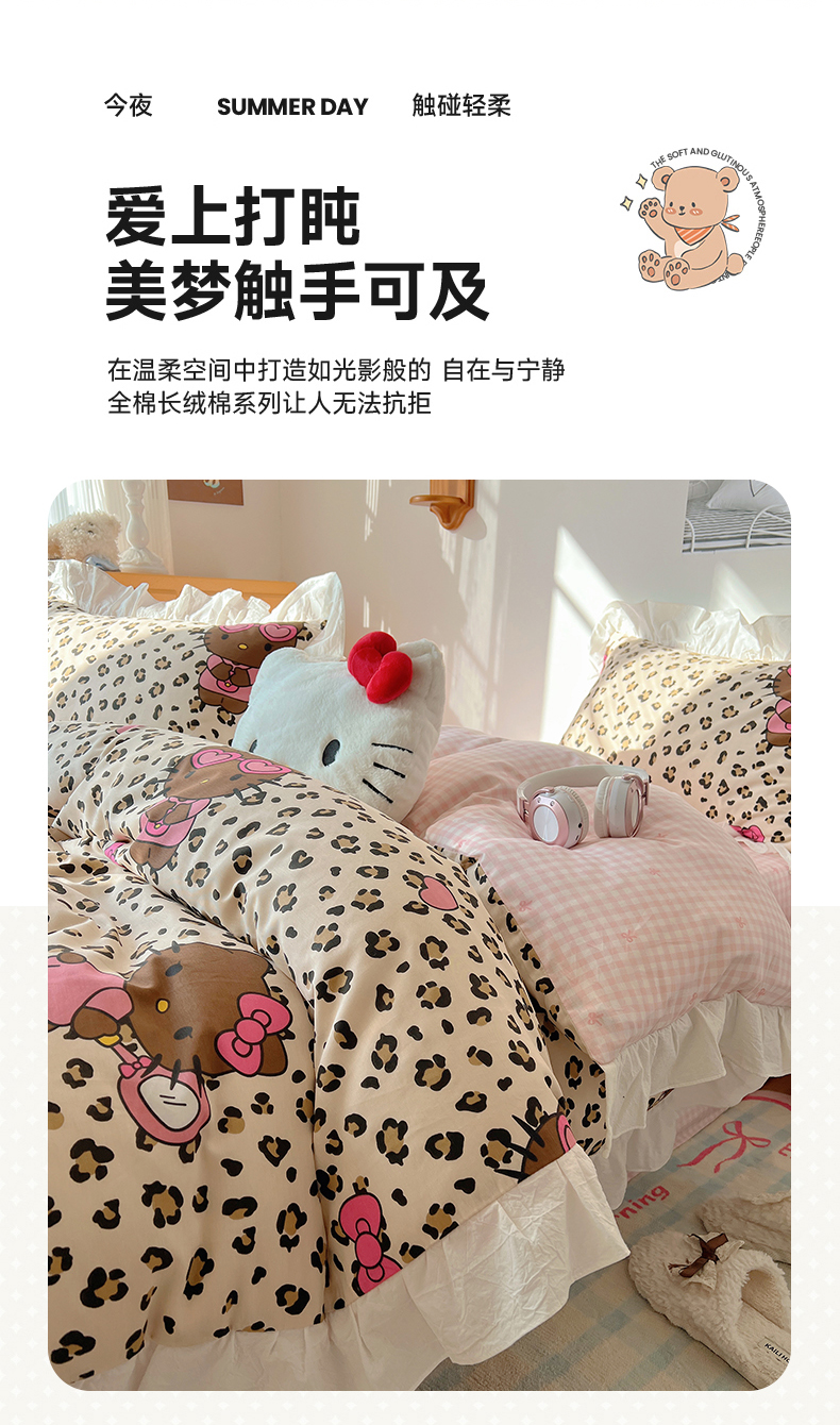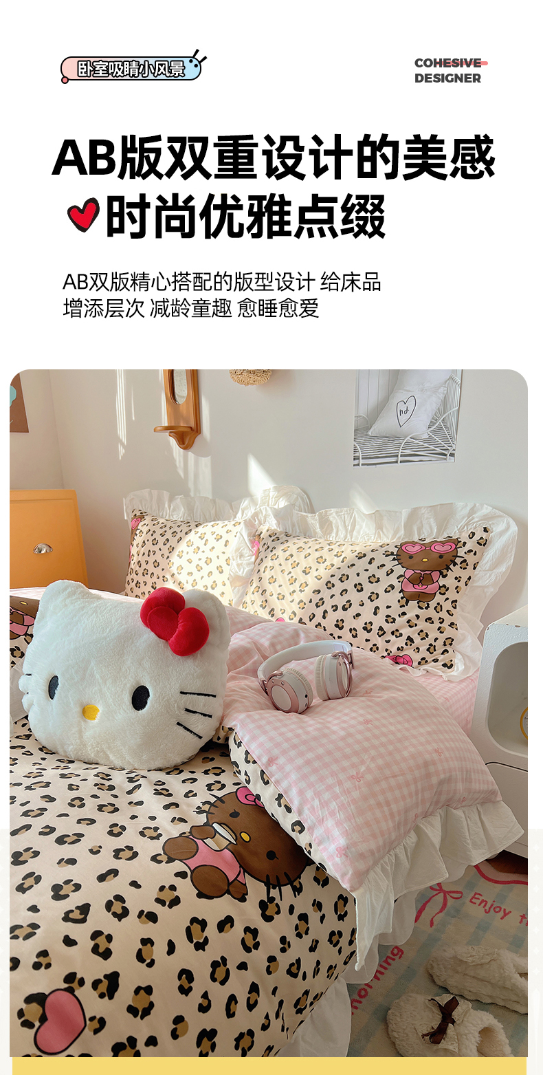 商品名称:六巷胡同 2026春夏新款韩系可爱风花边款卡通全棉四件套(第一系列) 花边豹纹黑皮猫