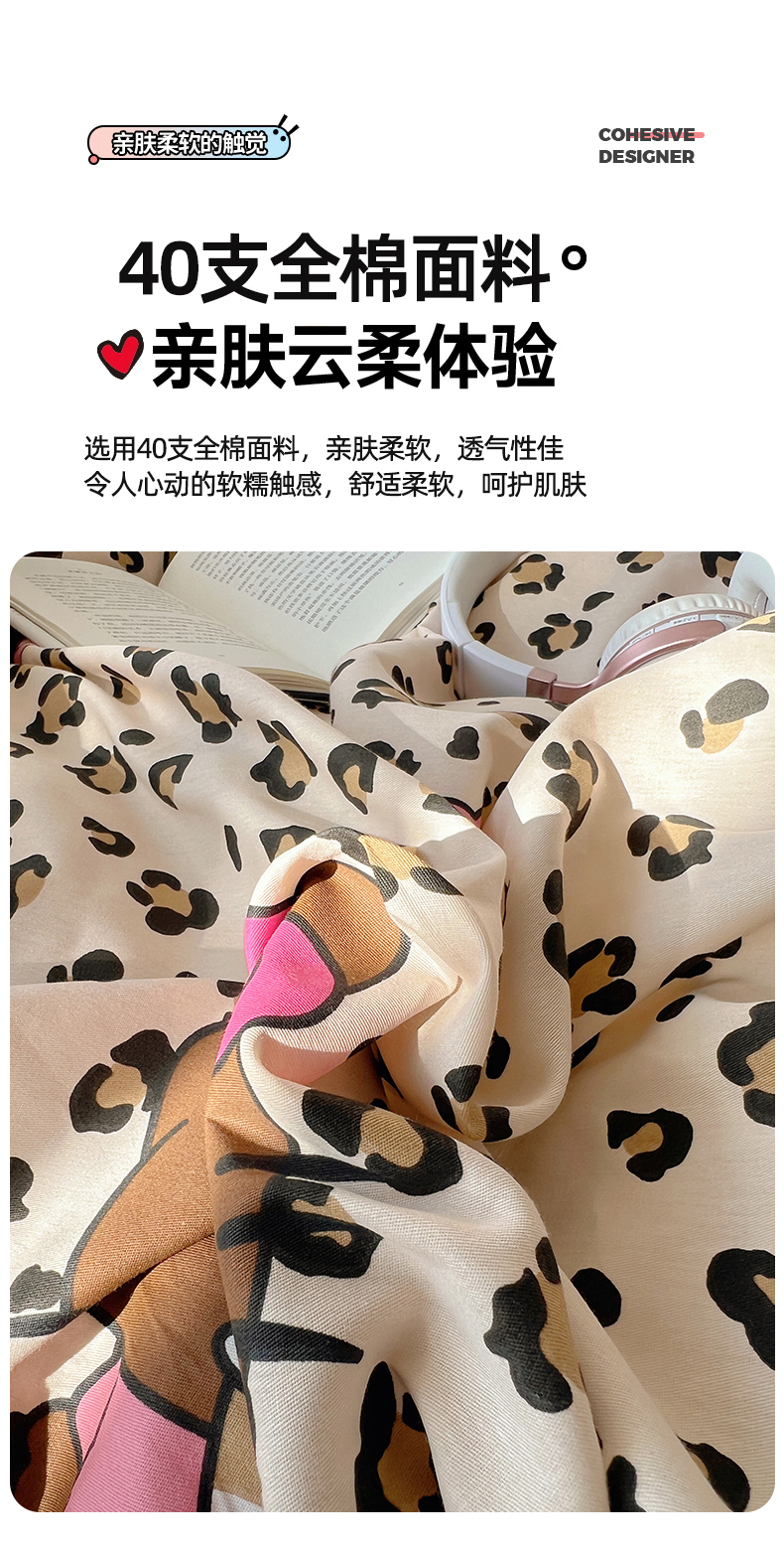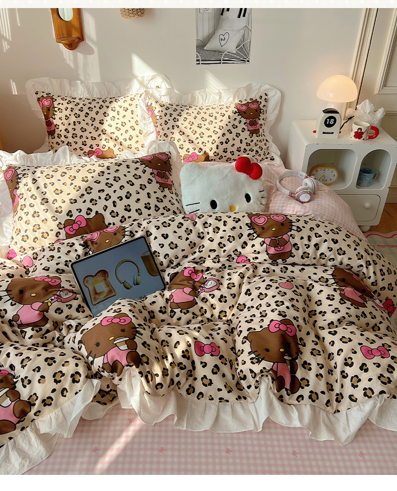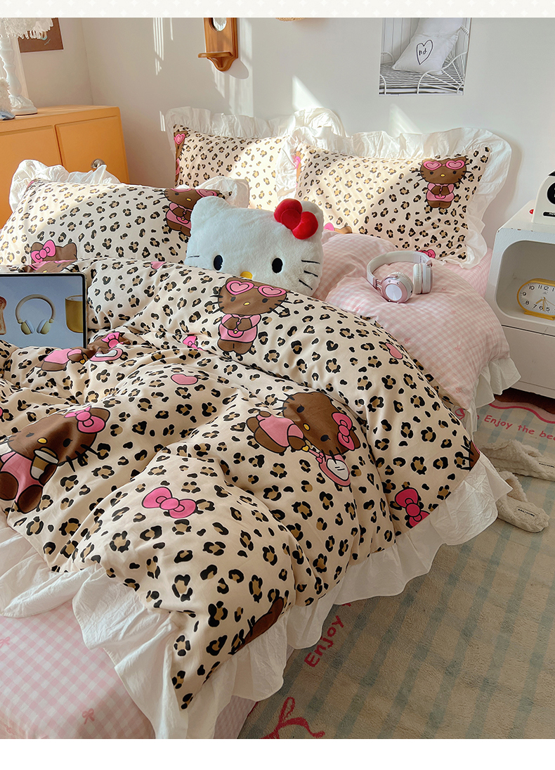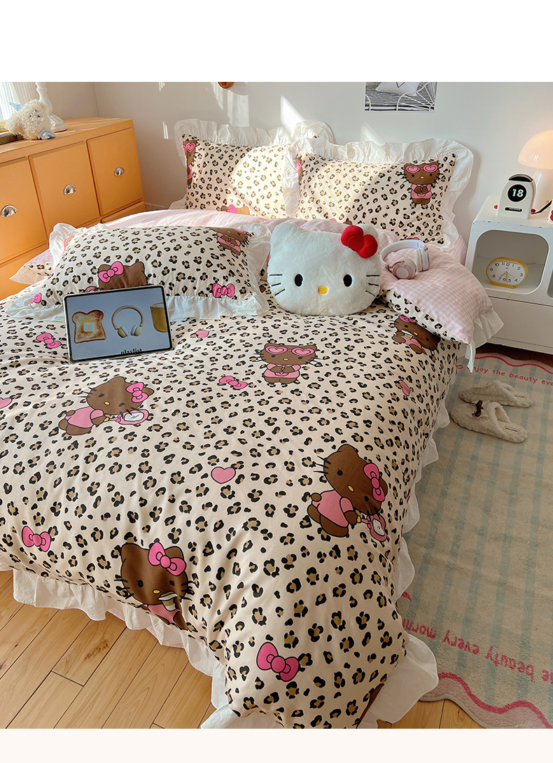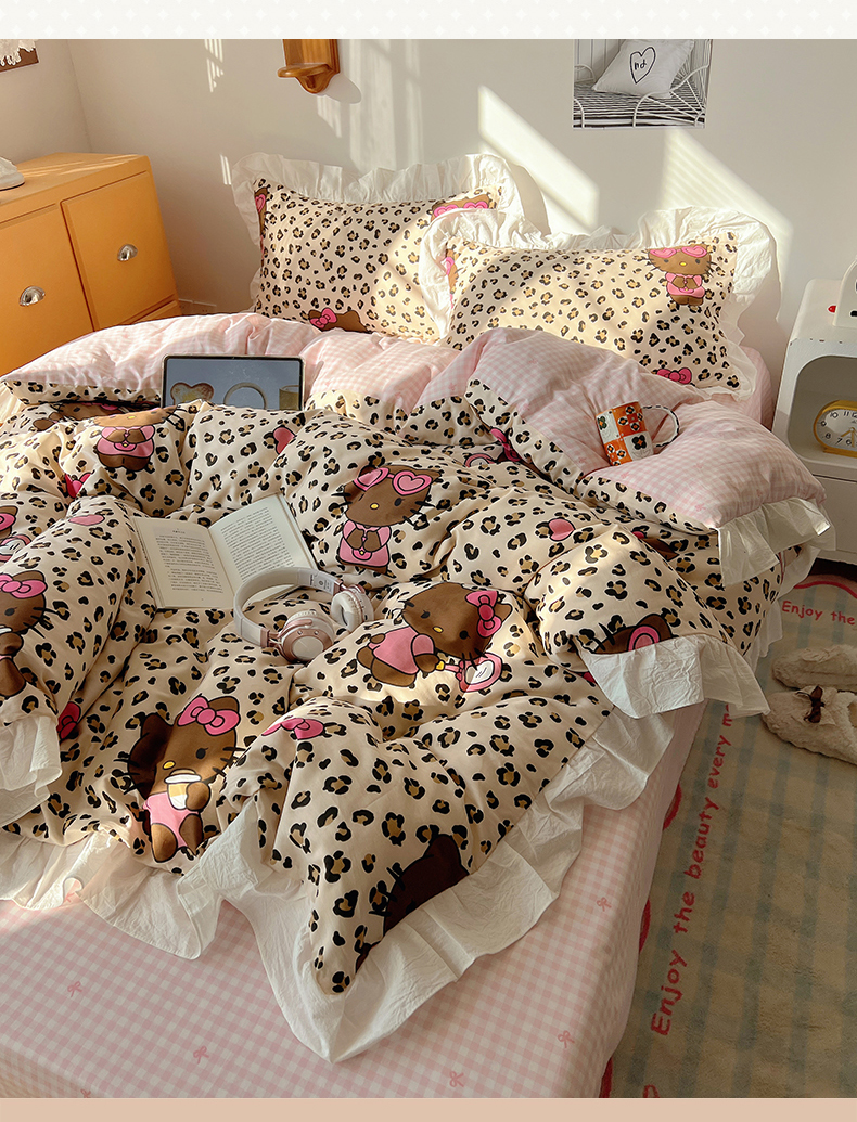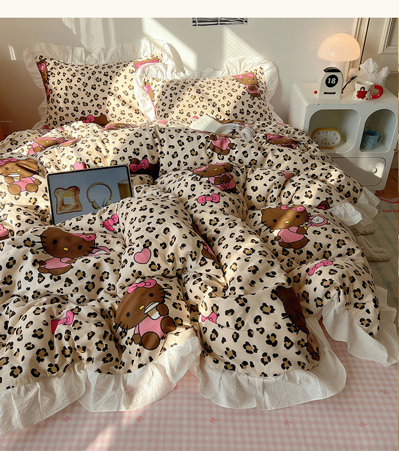 六巷胡同 2026春夏新款韩系可爱风花边款卡通全棉四件套(第一系列) 花边豹纹黑皮猫