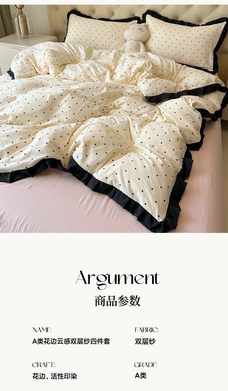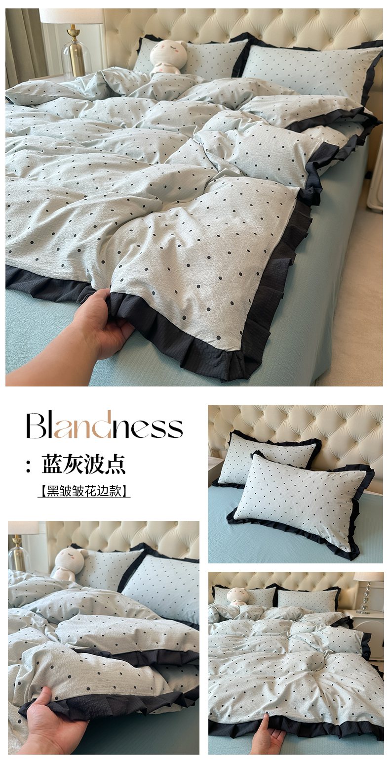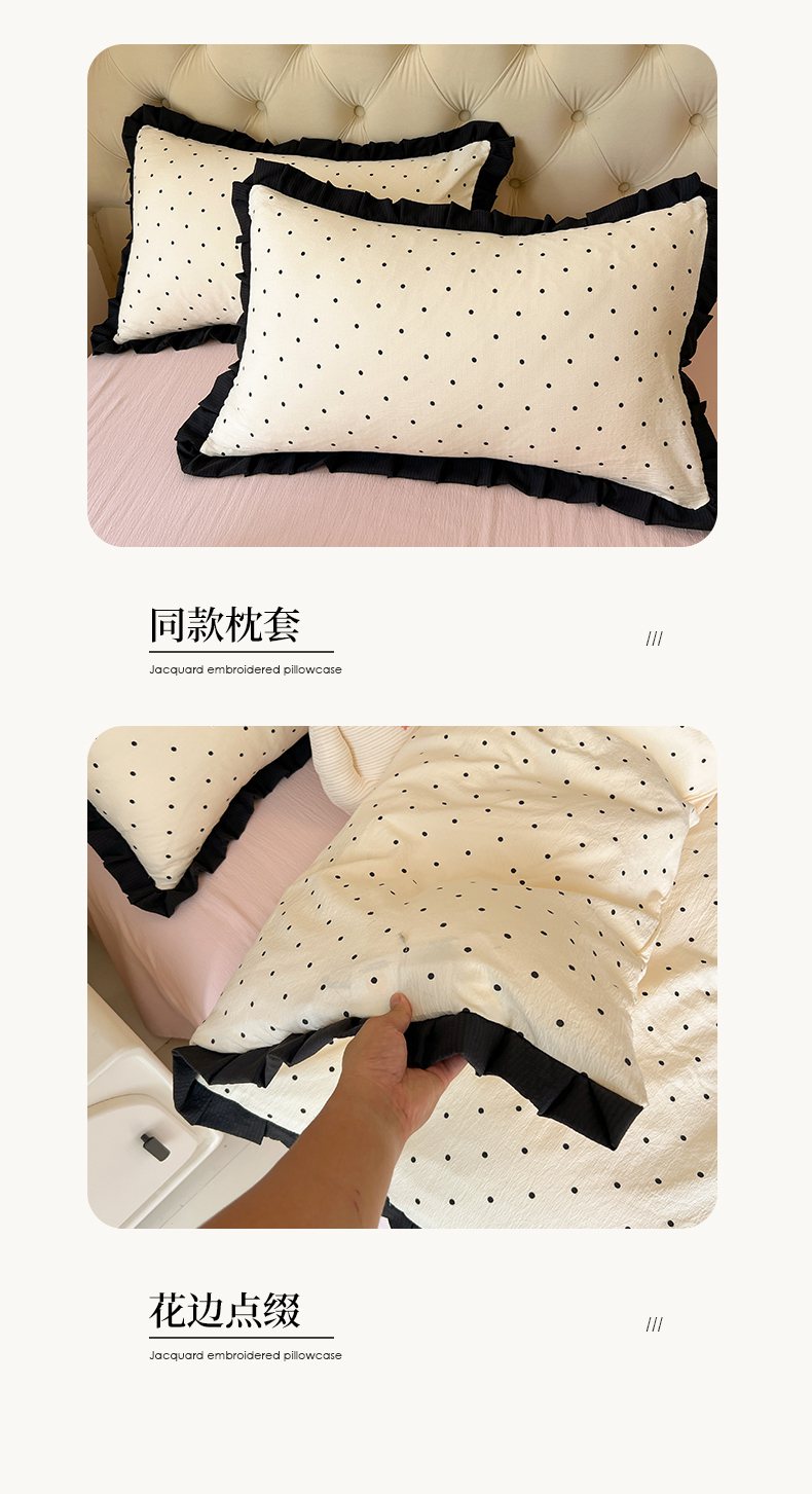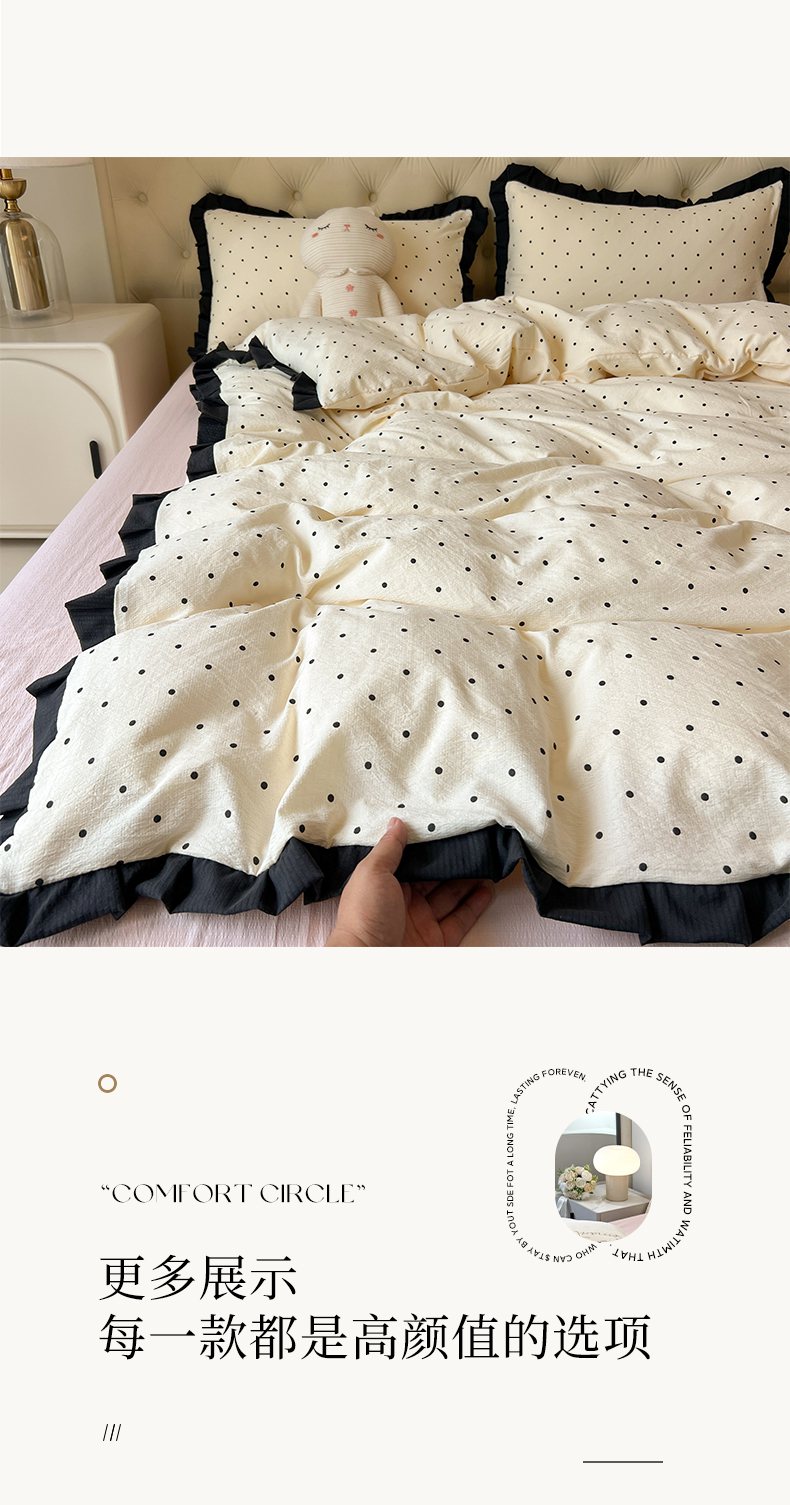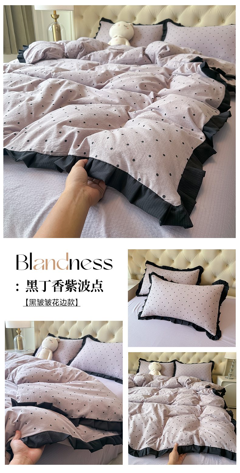 当前位置: 91家纺网 > 商品网购 > 床品套件 > 四件套 > 其它四件套 > 韩巢家纺 2026新款黑色花边款四件套 米黄波点【黑皱皱花边款】