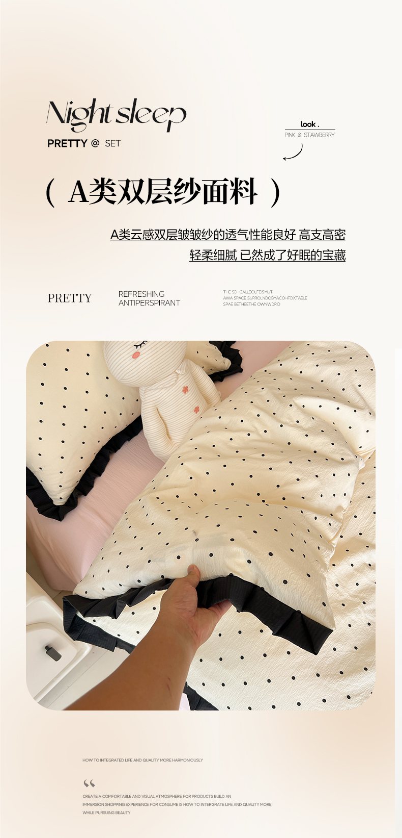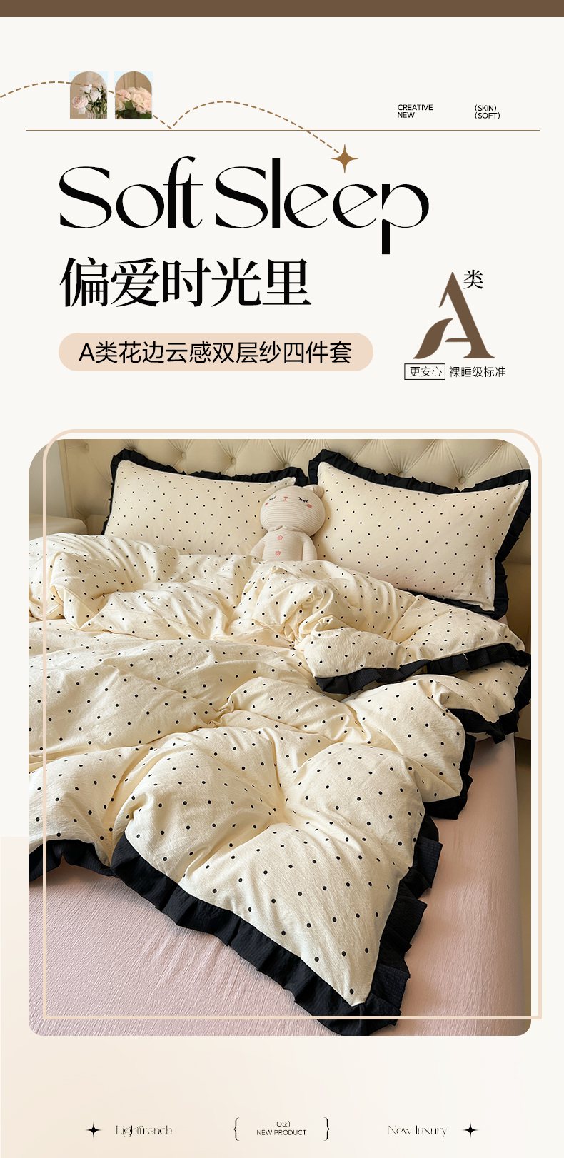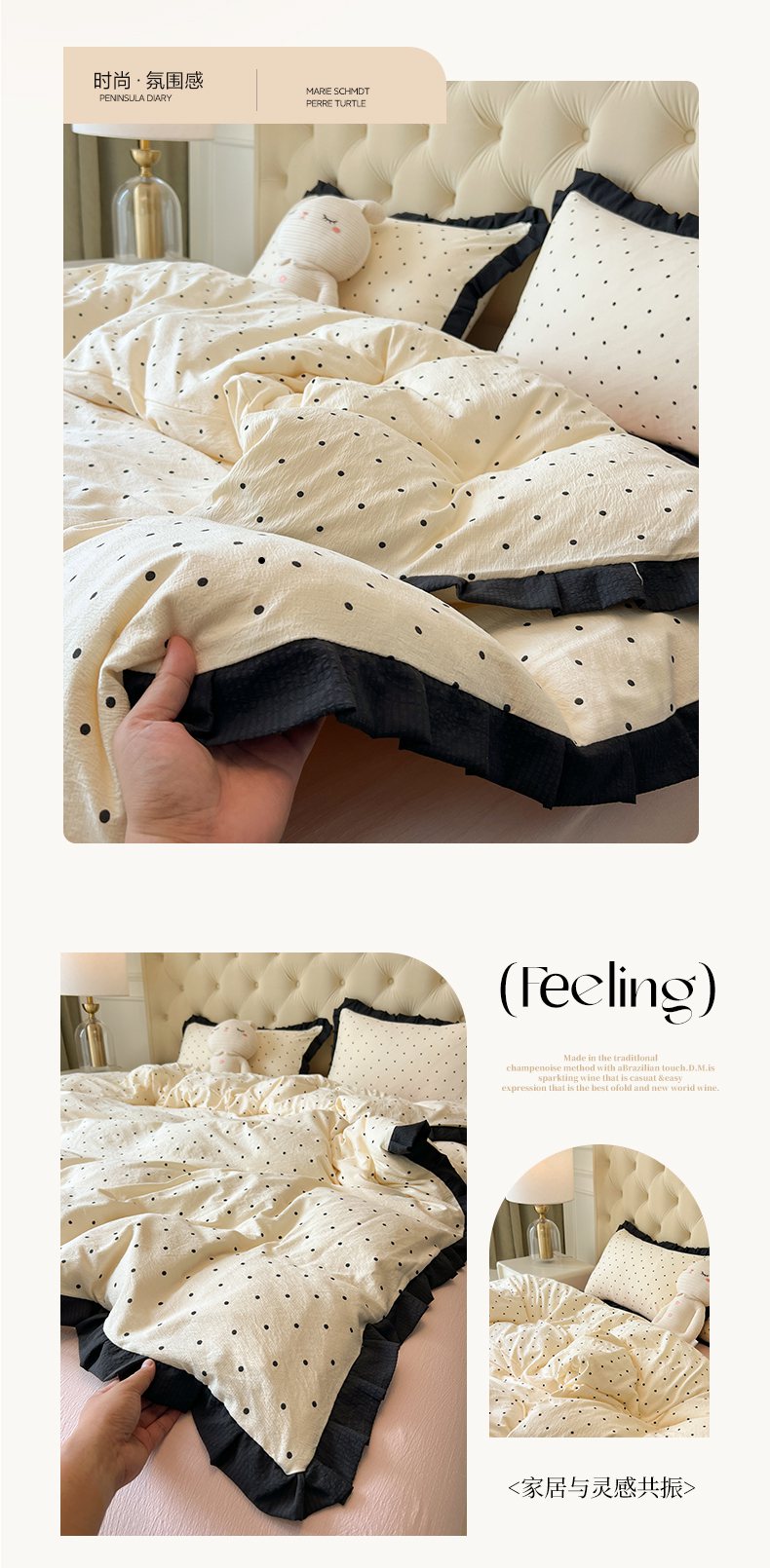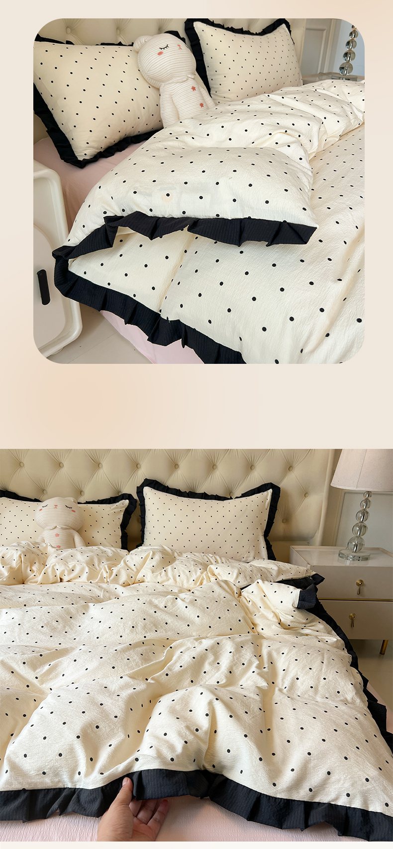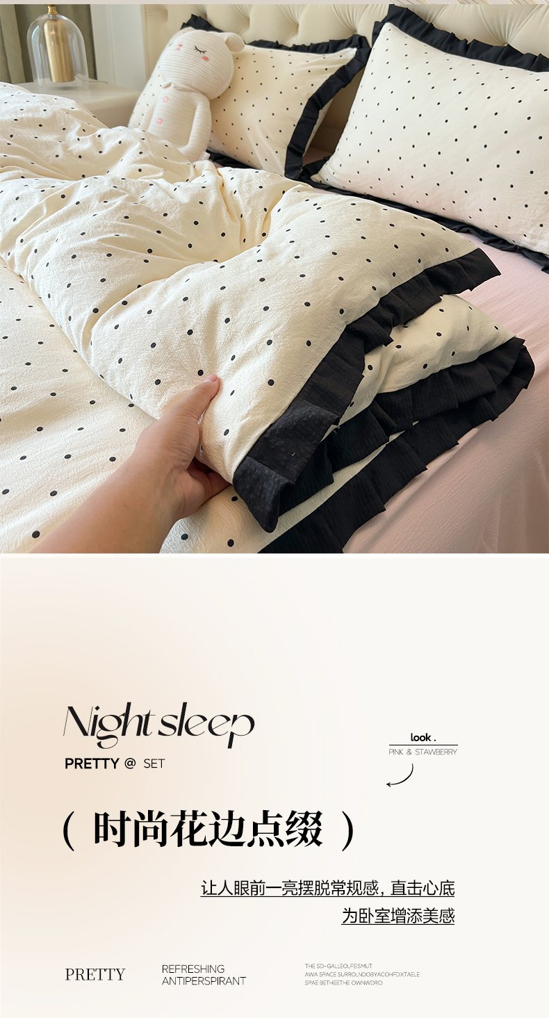 当前位置: 91家纺网 > 商品网购 > 床品套件 > 四件套 > 其它四件套 > 韩巢家纺 2026新款黑色花边款四件套 米黄波点【黑皱皱花边款】
