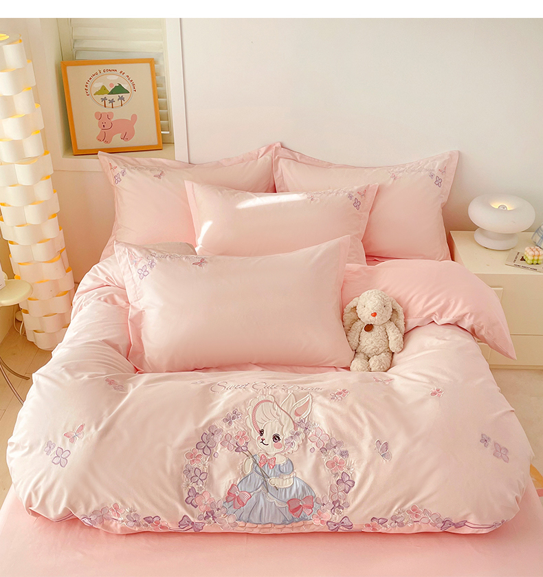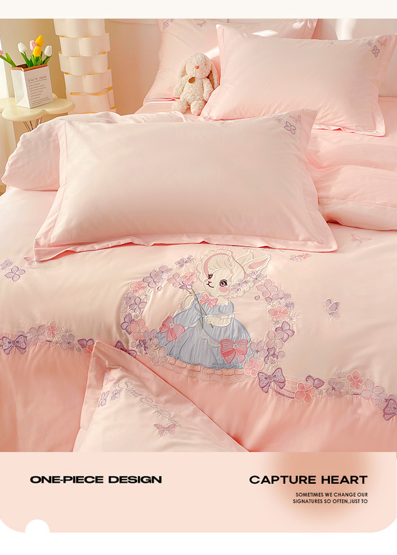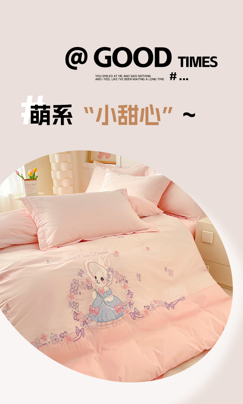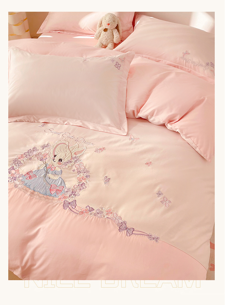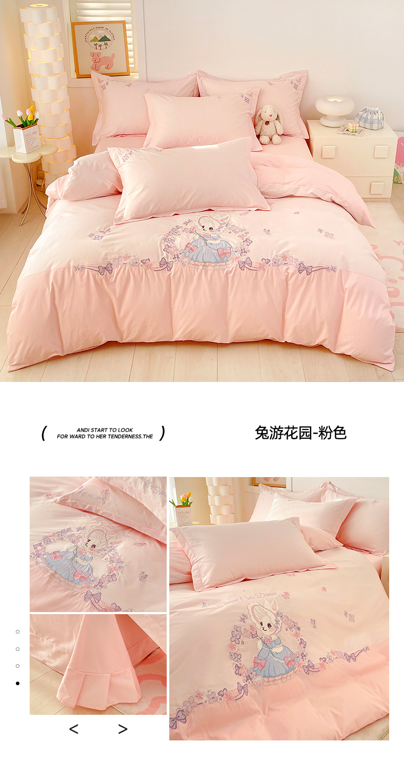 (总)金绣美居 2025新款全棉小清新韩版印花+绣花双面可用床盖四件套-花丛兔,花丛兔-浅绿,花丛兔-粉色,花丛兔-紫色