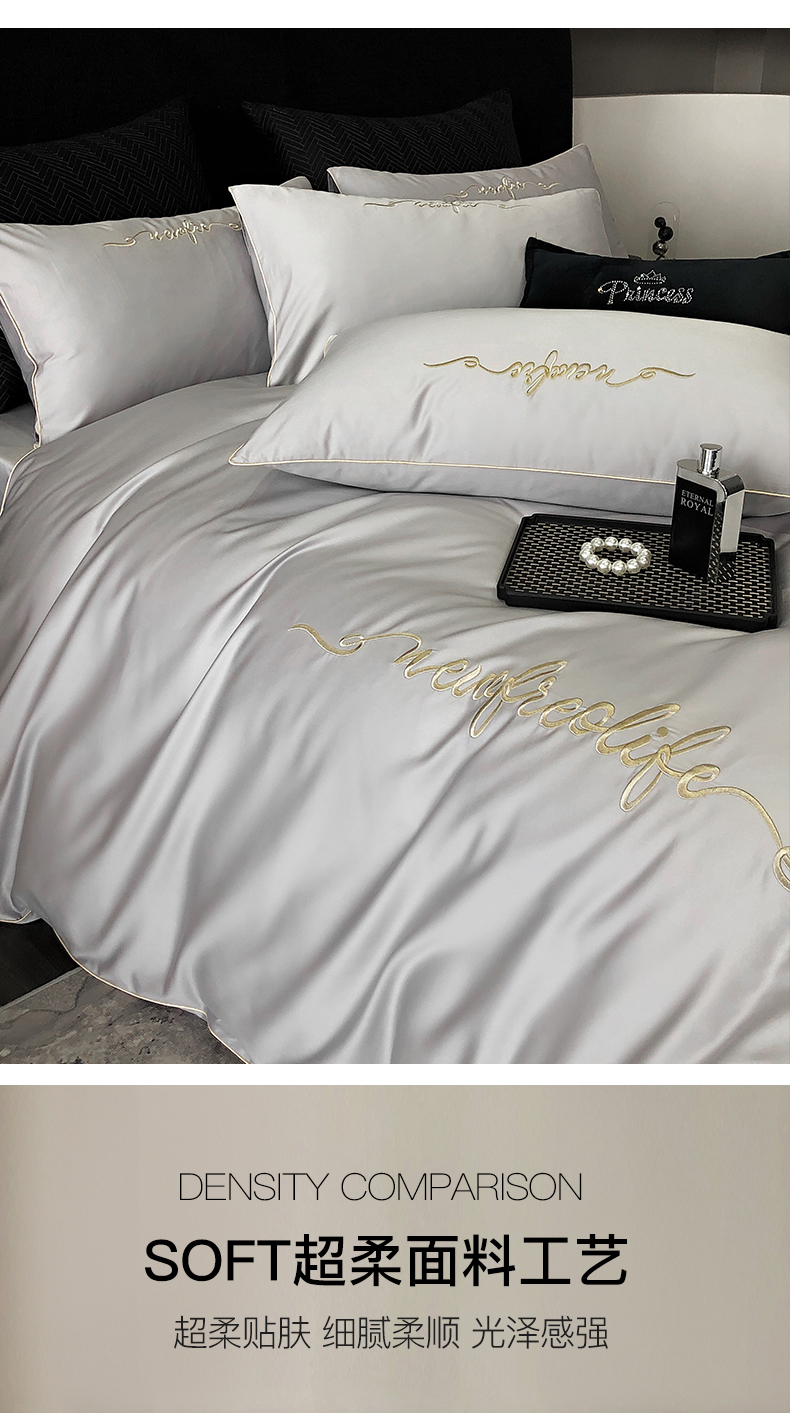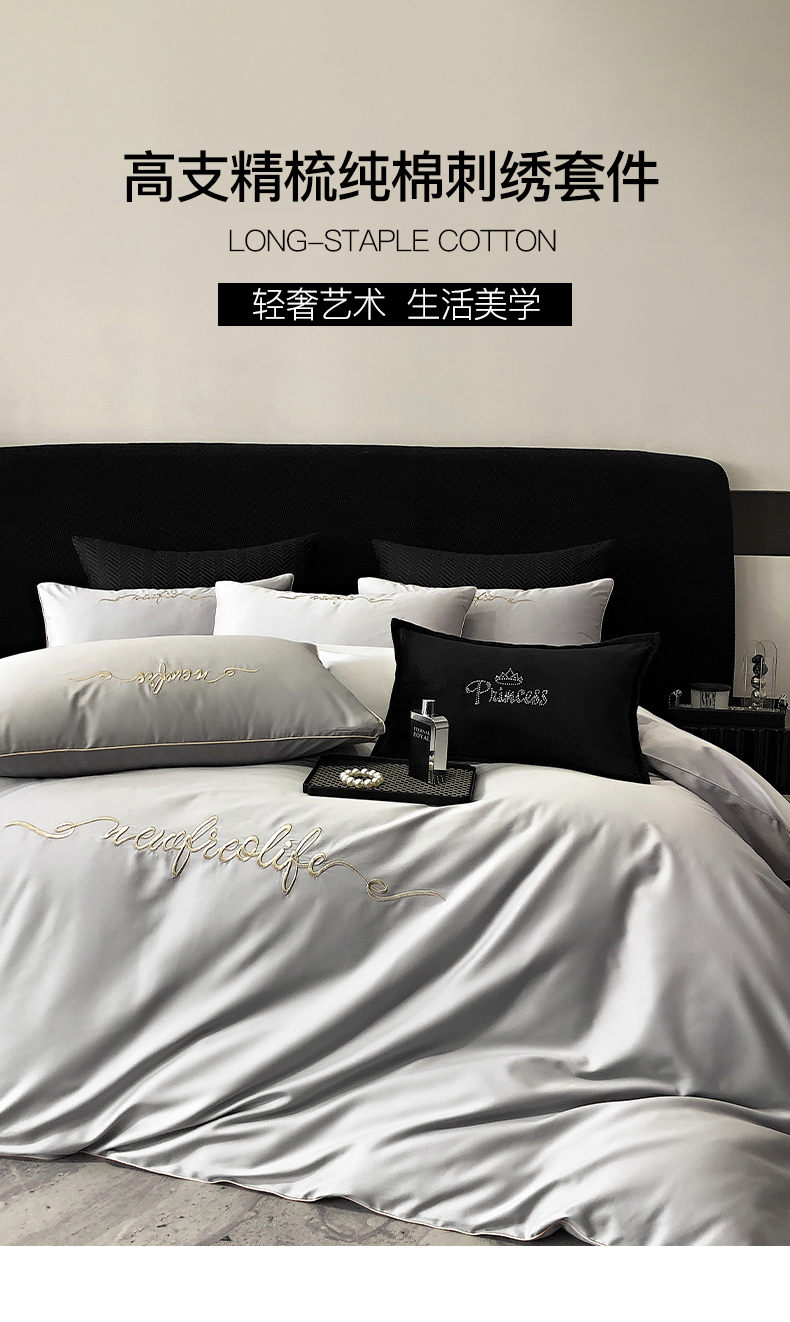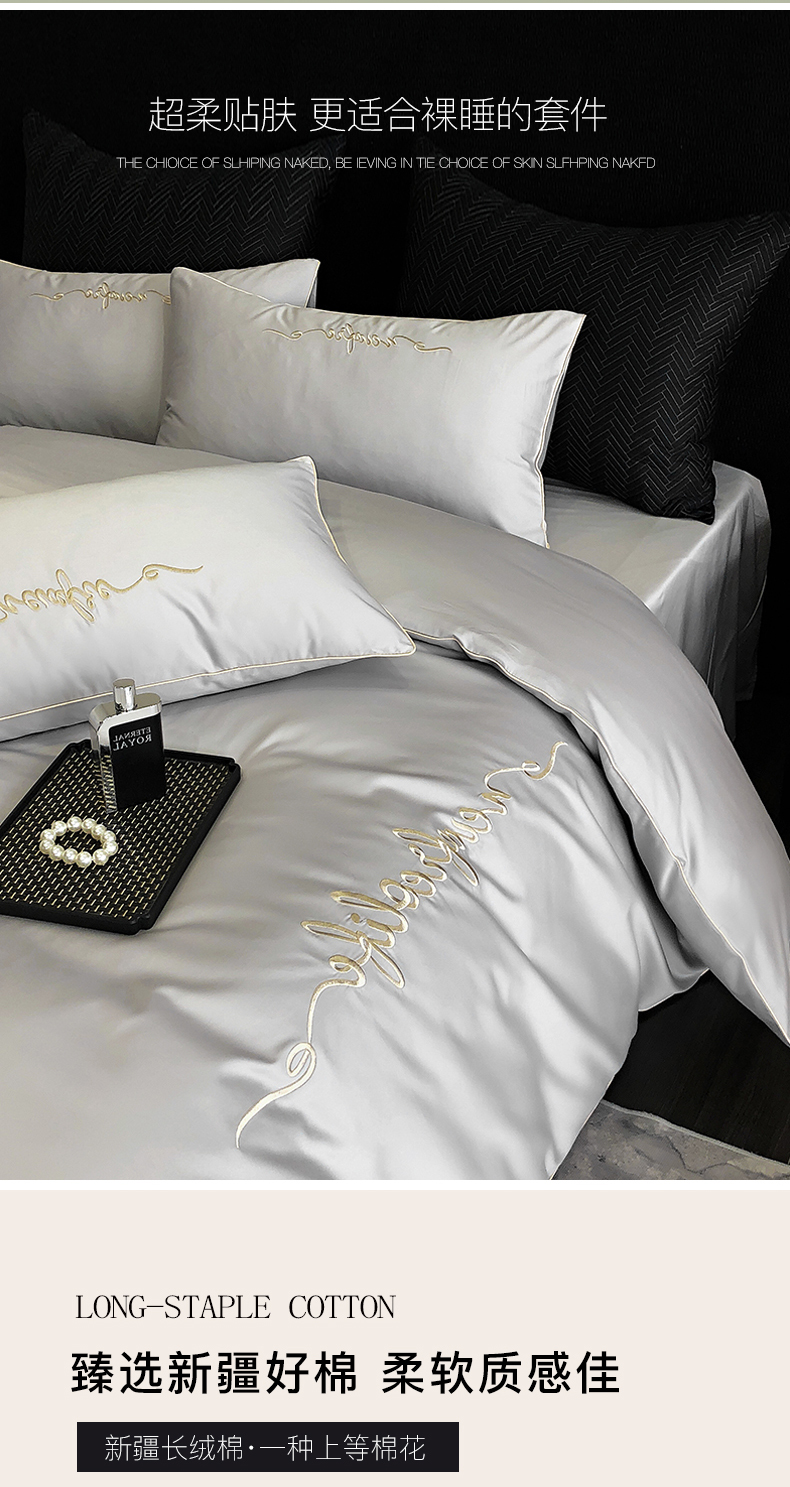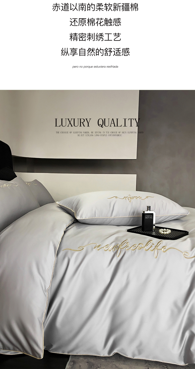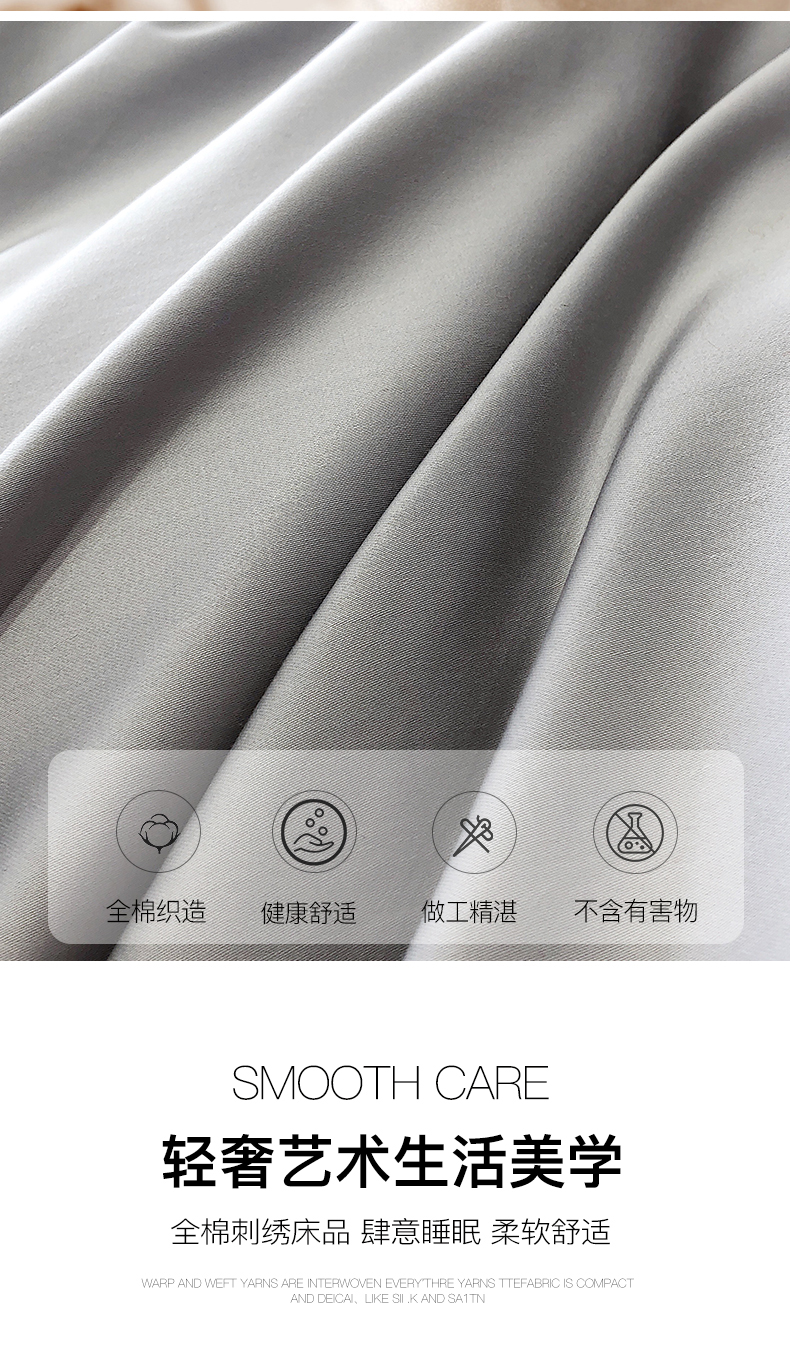 商品名称:禧澜庭 2026新款高支纯棉全棉斜纹四件套刺绣绣花款轻奢三件套--卡罗系列 月光灰