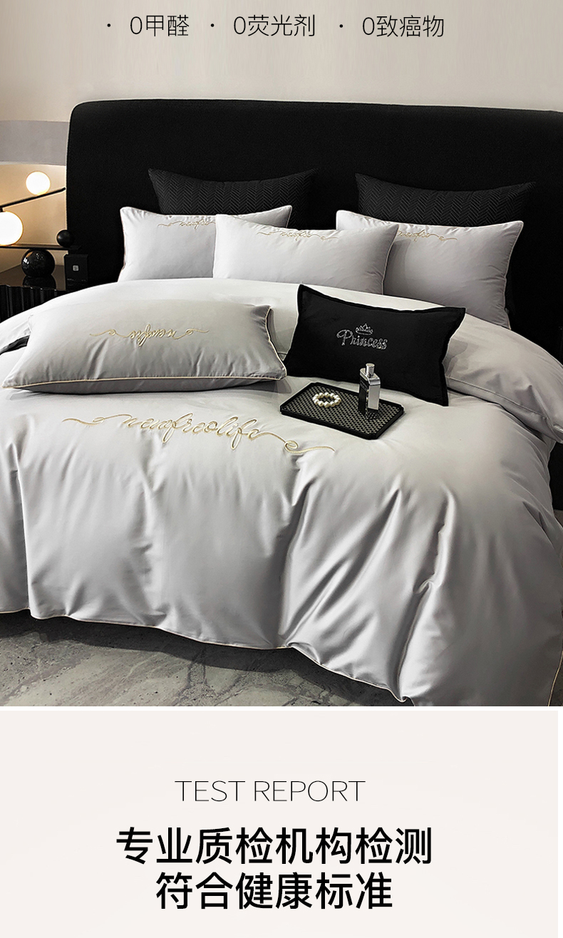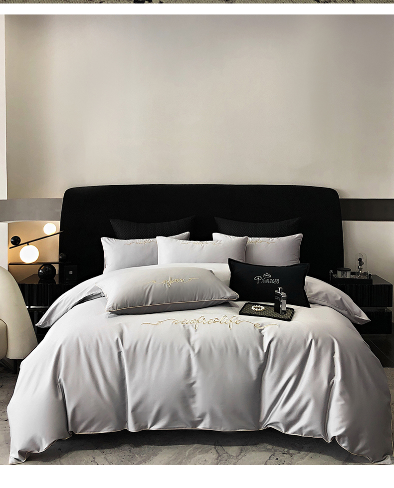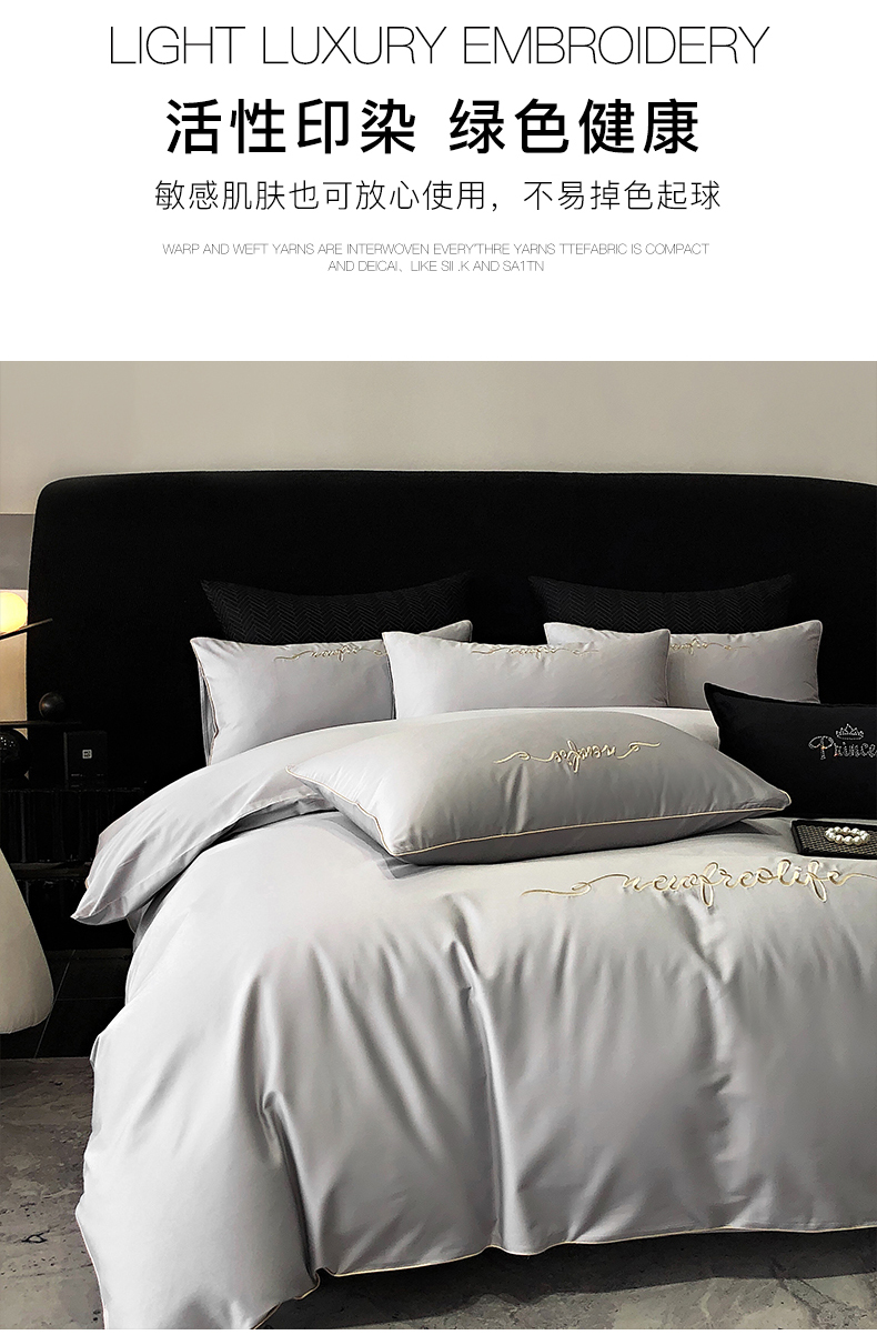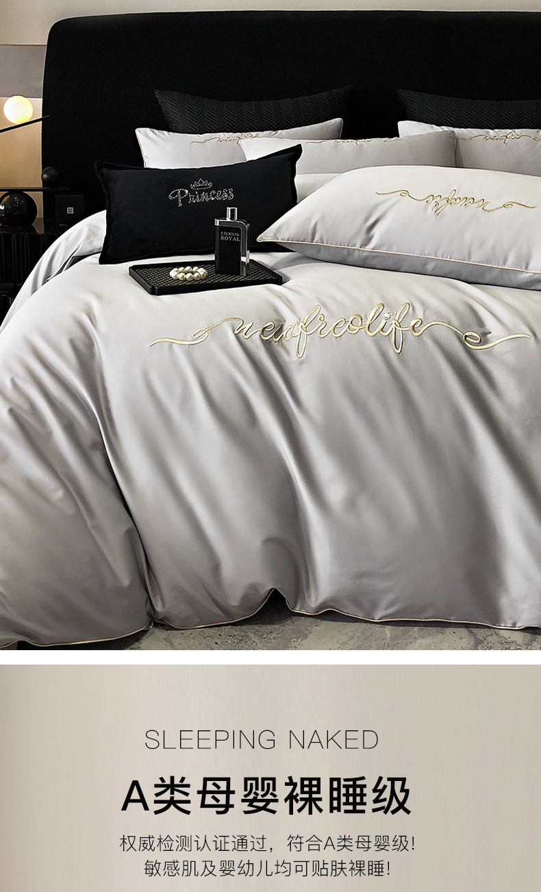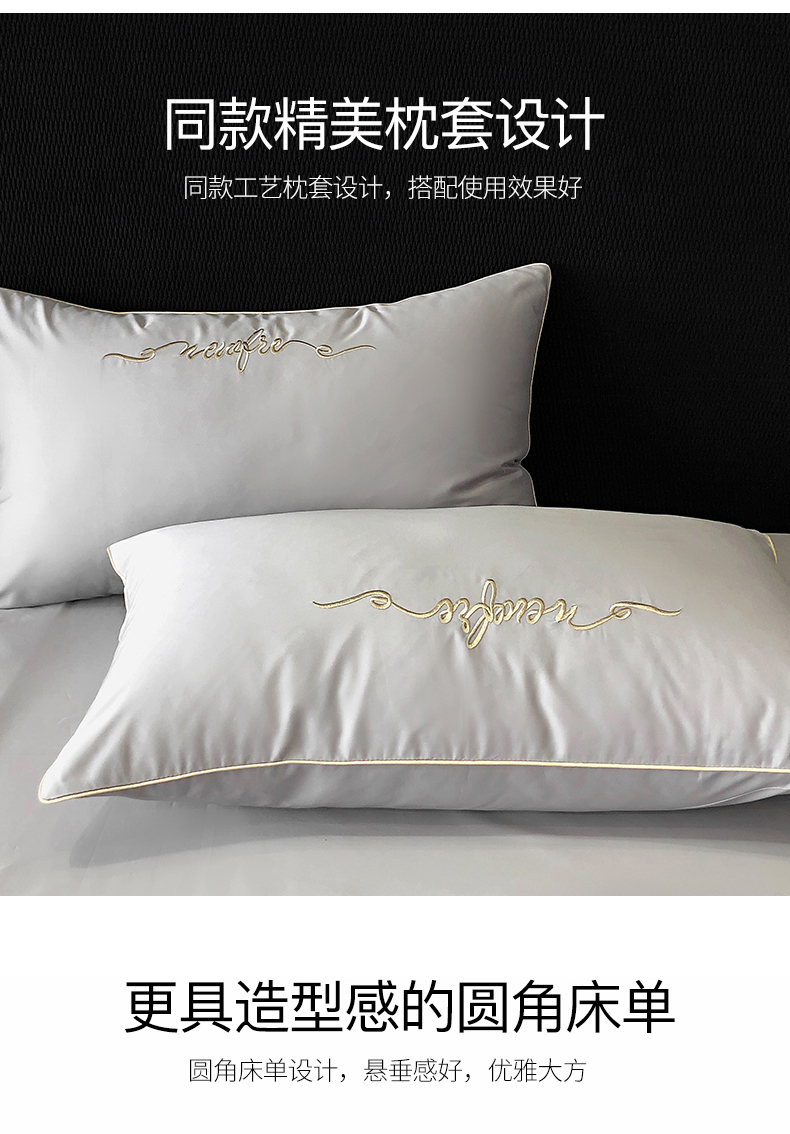 商品名称:禧澜庭 2026新款高支纯棉全棉斜纹四件套刺绣绣花款轻奢三件套--卡罗系列 月光灰