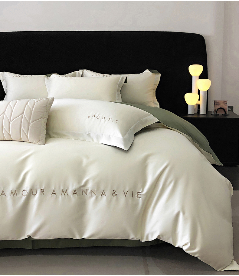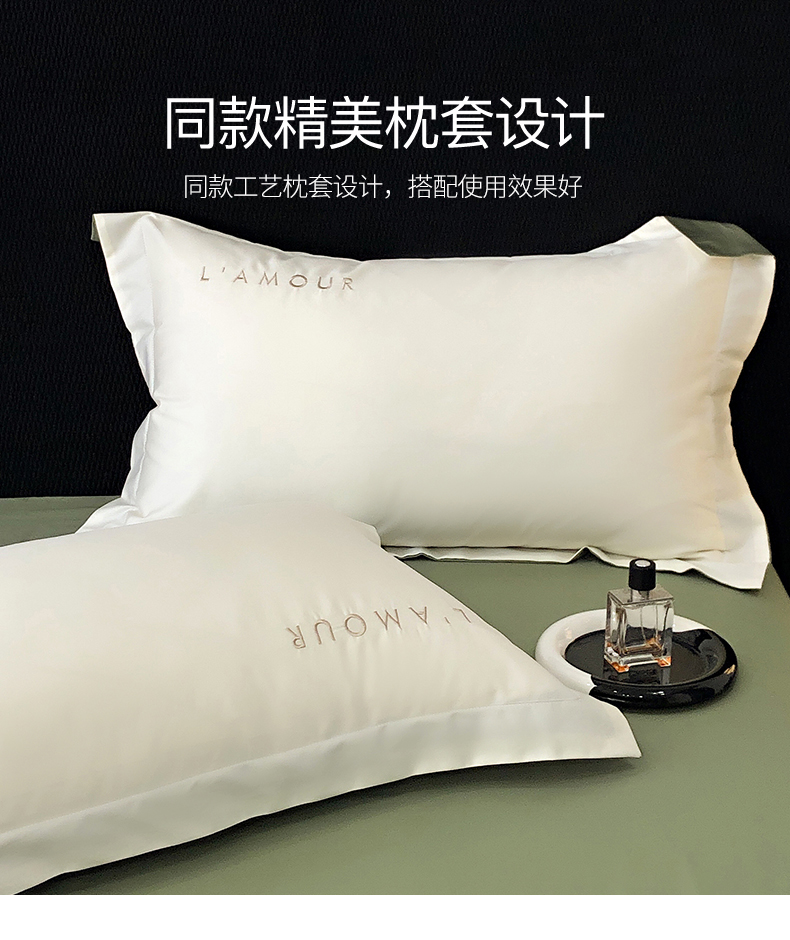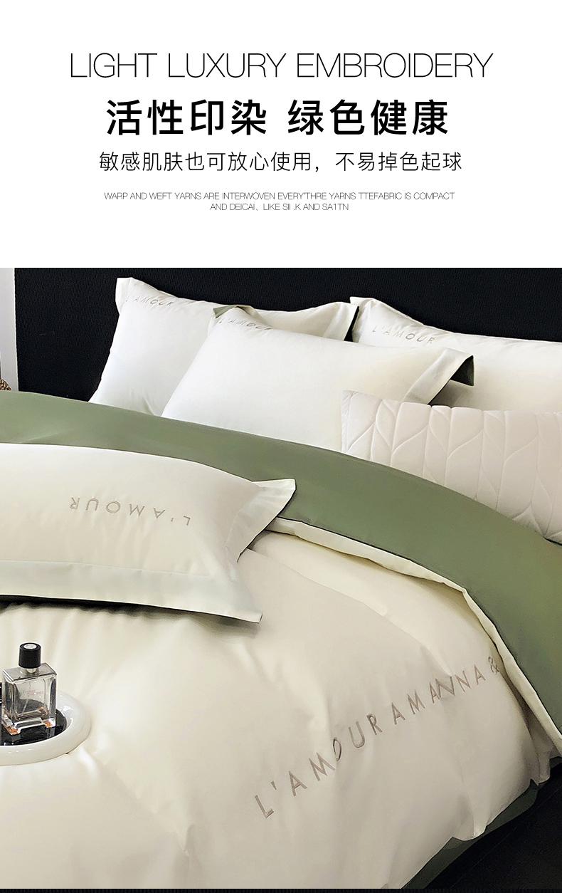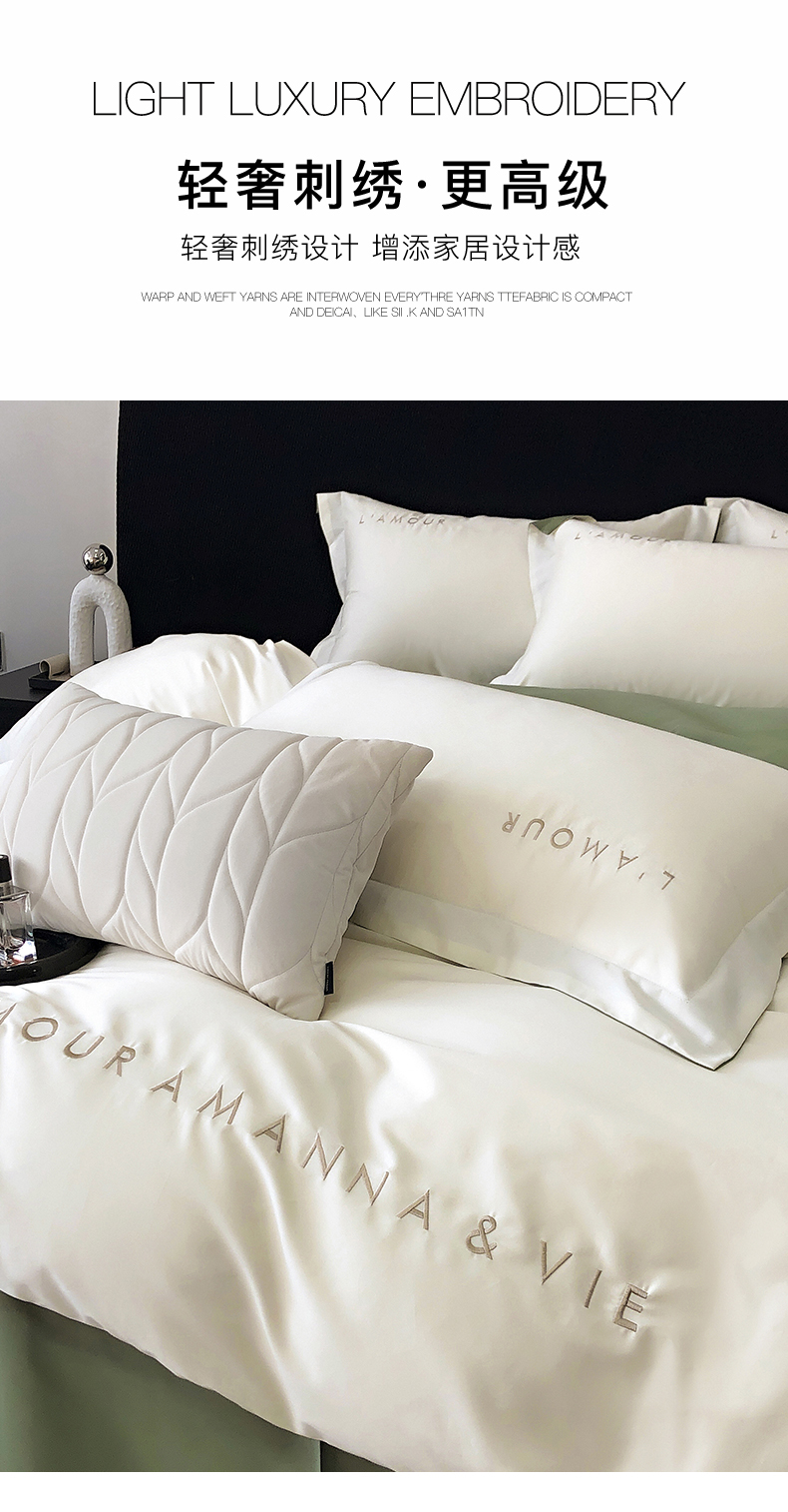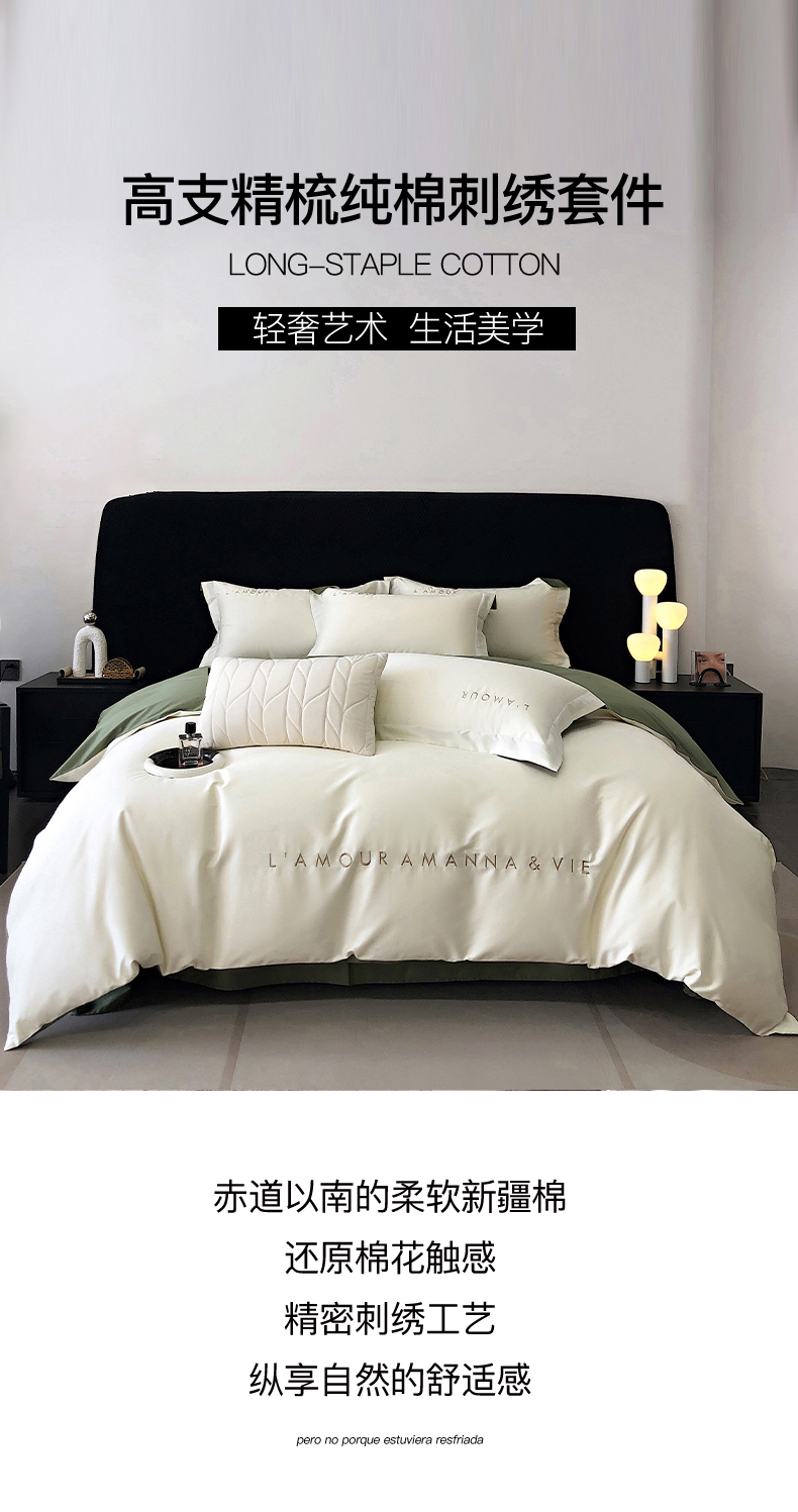 商品名称:禧澜庭 2026新款高支纯棉全棉斜纹四件套刺绣绣花款轻奢三件套--简爱系列 贵族白+绿色