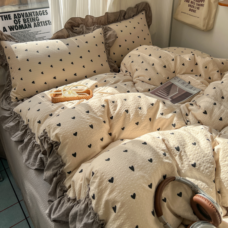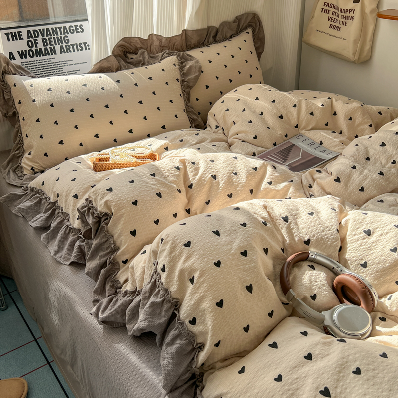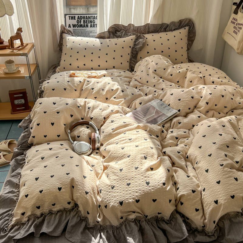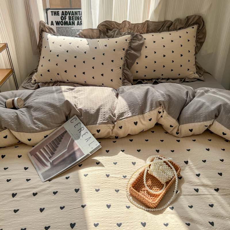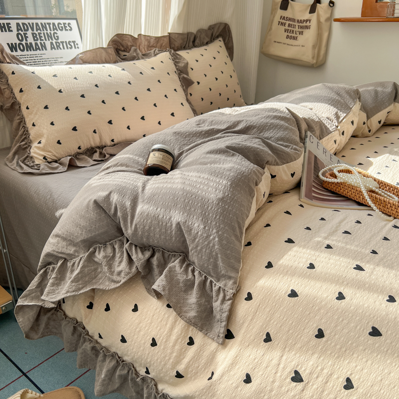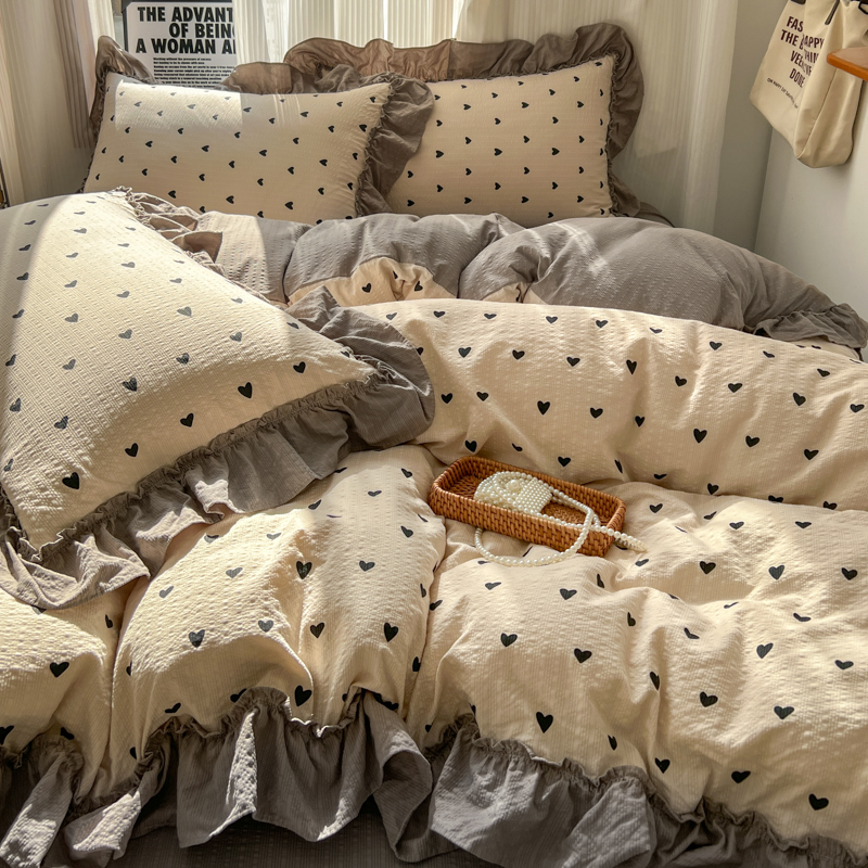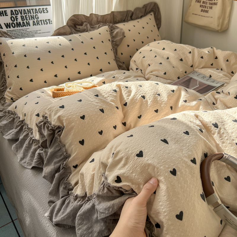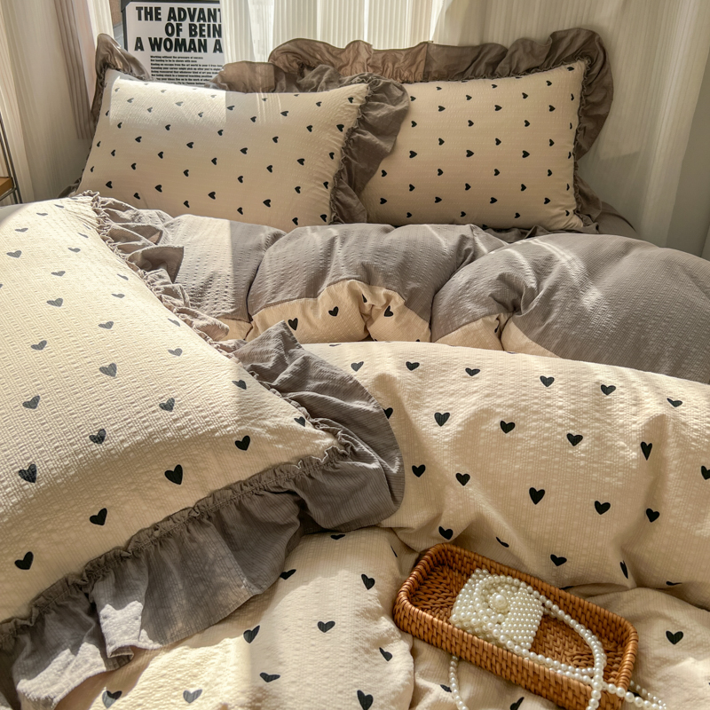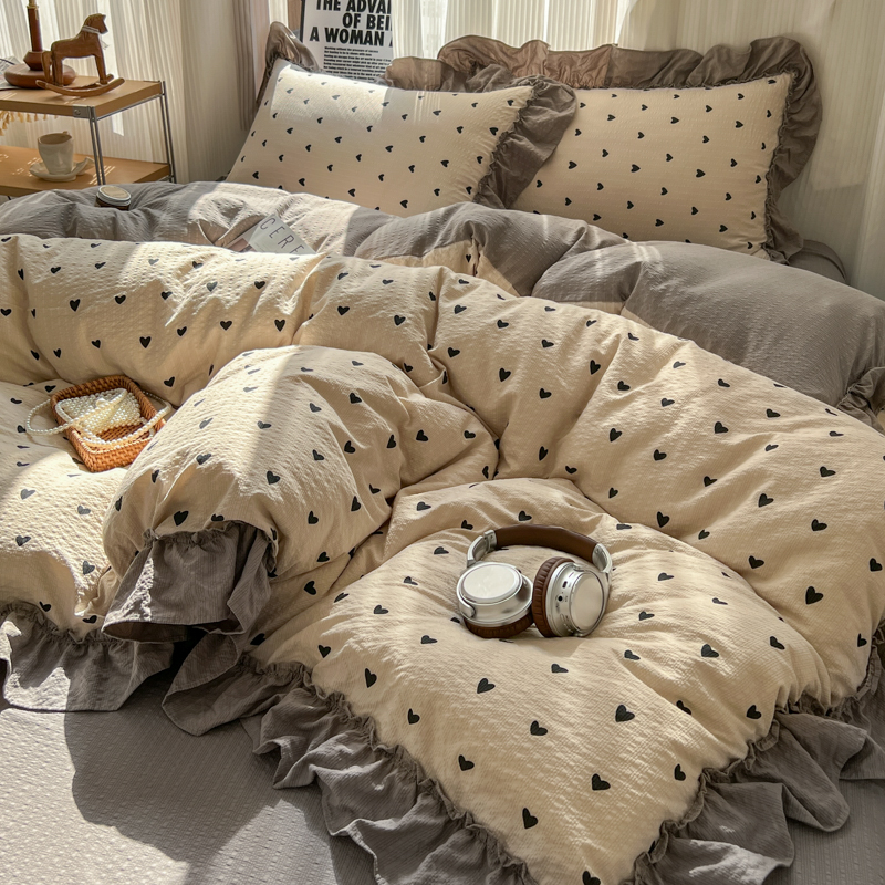 当前位置: 91家纺网 > 商品网购 > 床品套件 > 四件套 > 化纤活性四件套 > 2026新款泡芙纱花边四件套 咖爱心