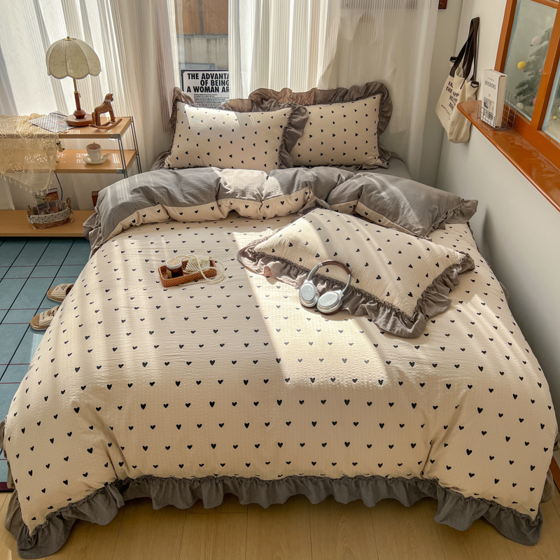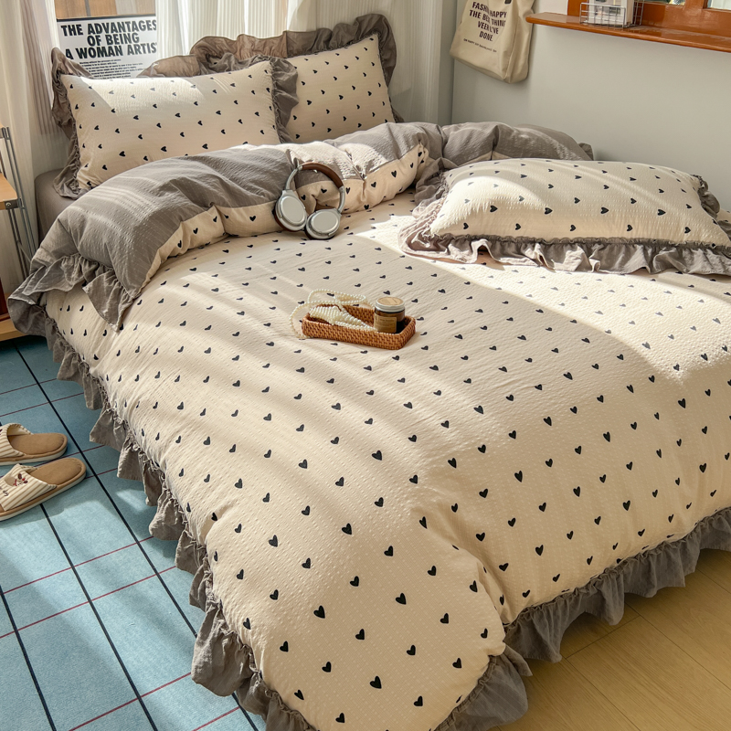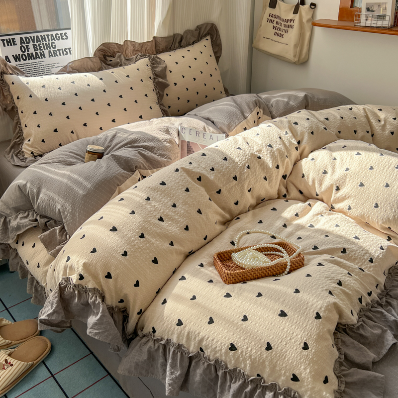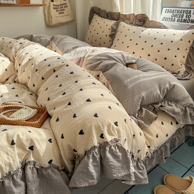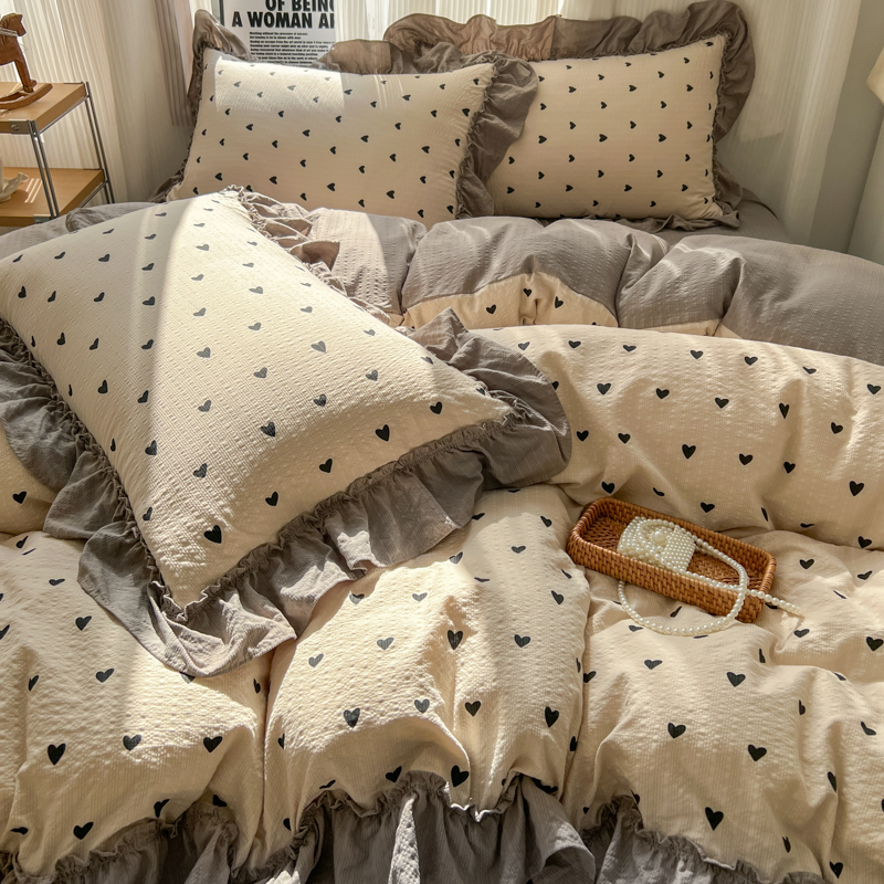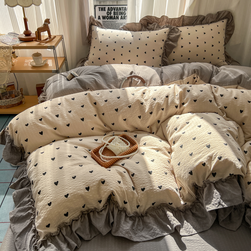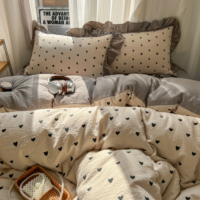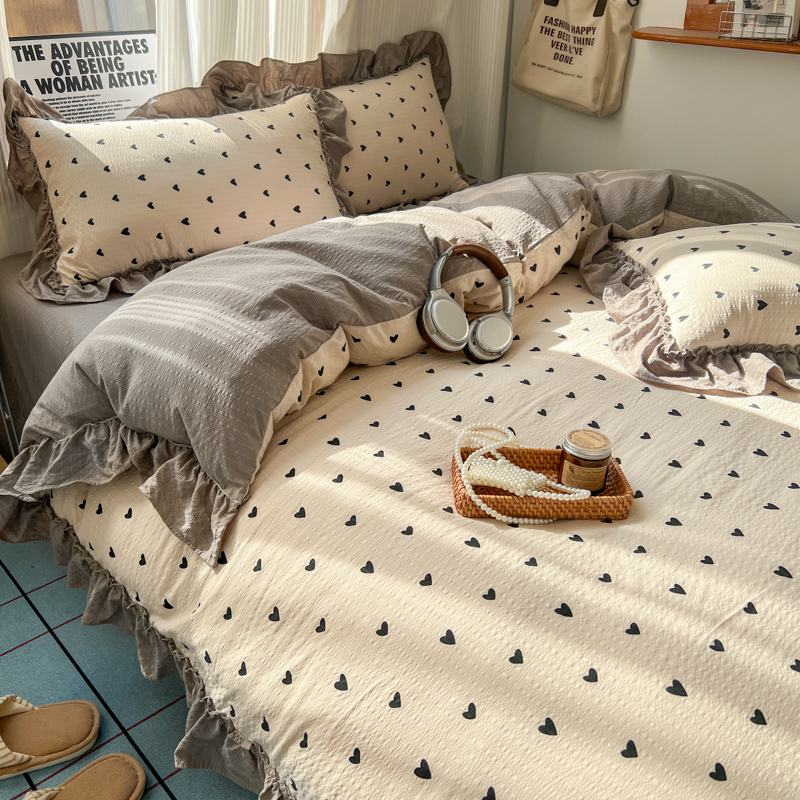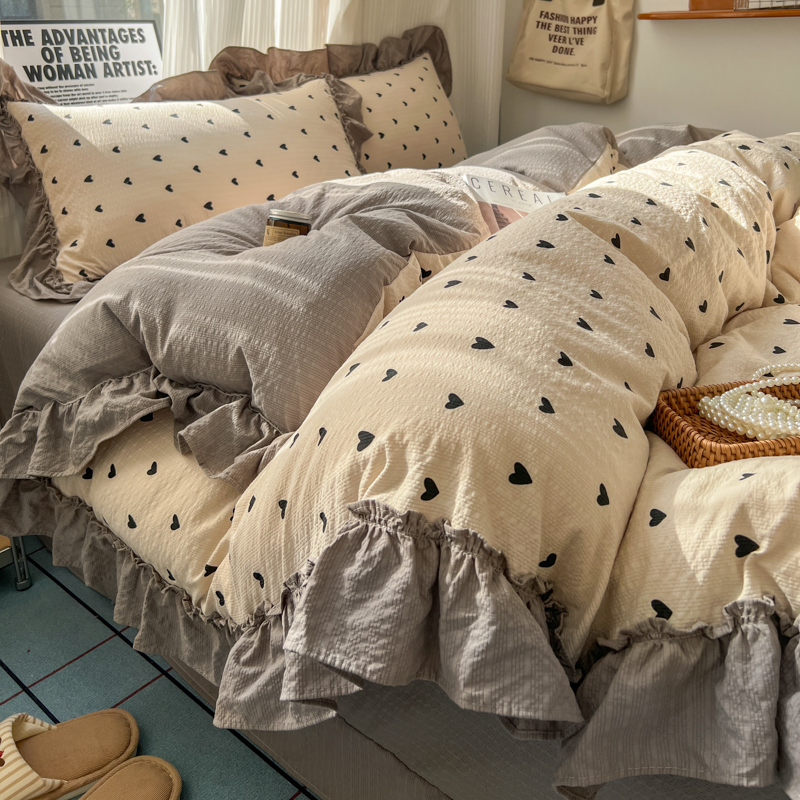 当前位置: 91家纺网 > 商品网购 > 床品套件 > 四件套 > 化纤活性四件套 > 2026新款泡芙纱花边四件套 咖爱心