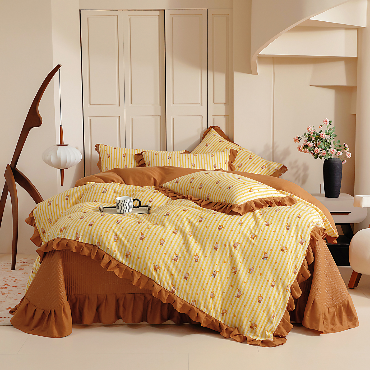 (总)情煊家纺 2026新款全棉双层纱单品床盖,焦糖,奶油黄,深咖,仙霞,胭脂红