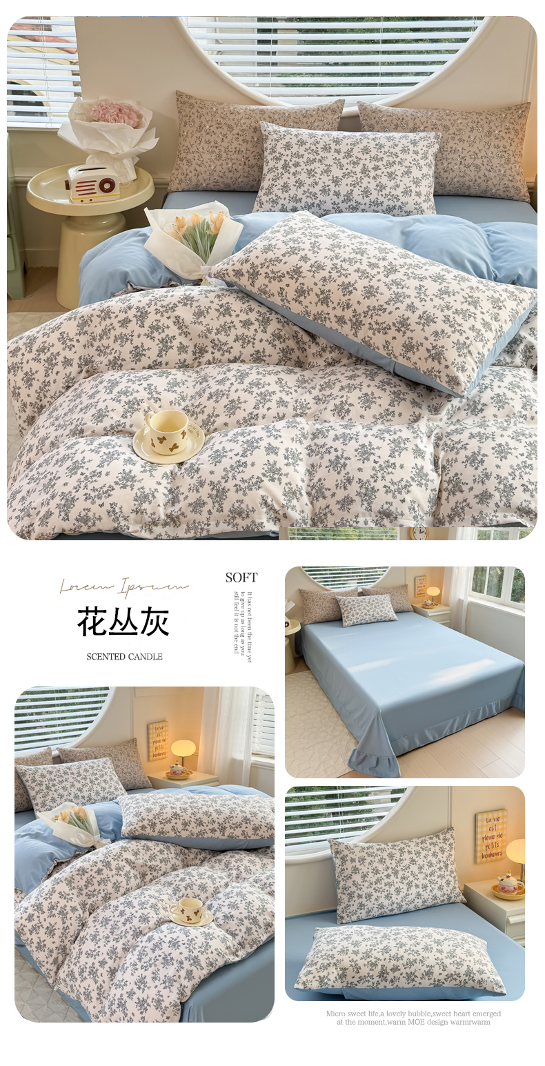 • 91家纺网 家纺一手货源 找家纺 (总)爱多多家居 2026新款双层纱针织棉印花四件套,格子熊,爱心灰,初夏,花丛灰,花丛咖,欢乐颂,玫瑰花园,南瓜派,小豹纹,熊猫绿,郁金香