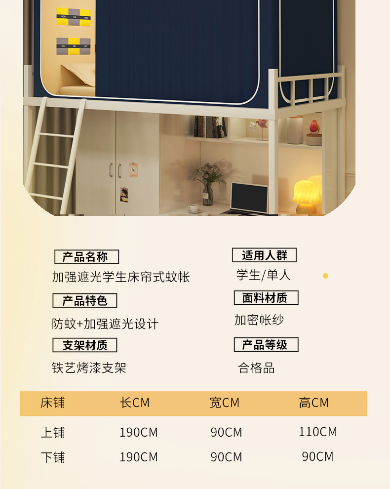 90上下铺通用(带靠墙帘):90宽x190长x90-120高(高度伸缩) | ¥105.00 |