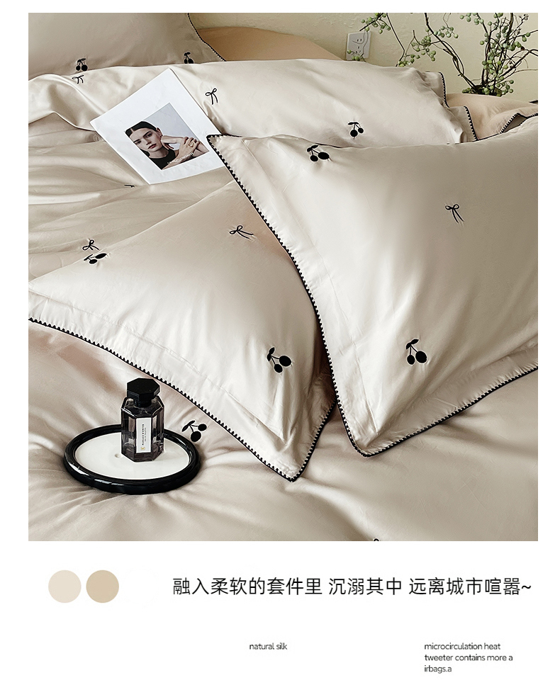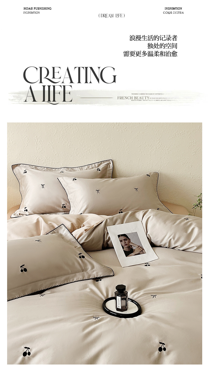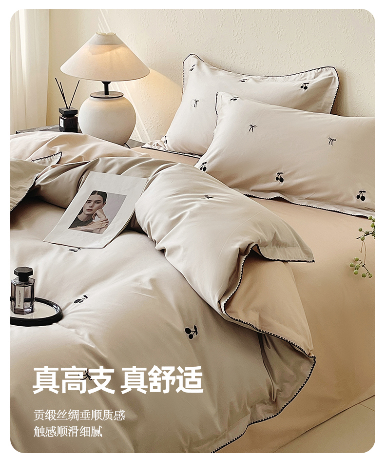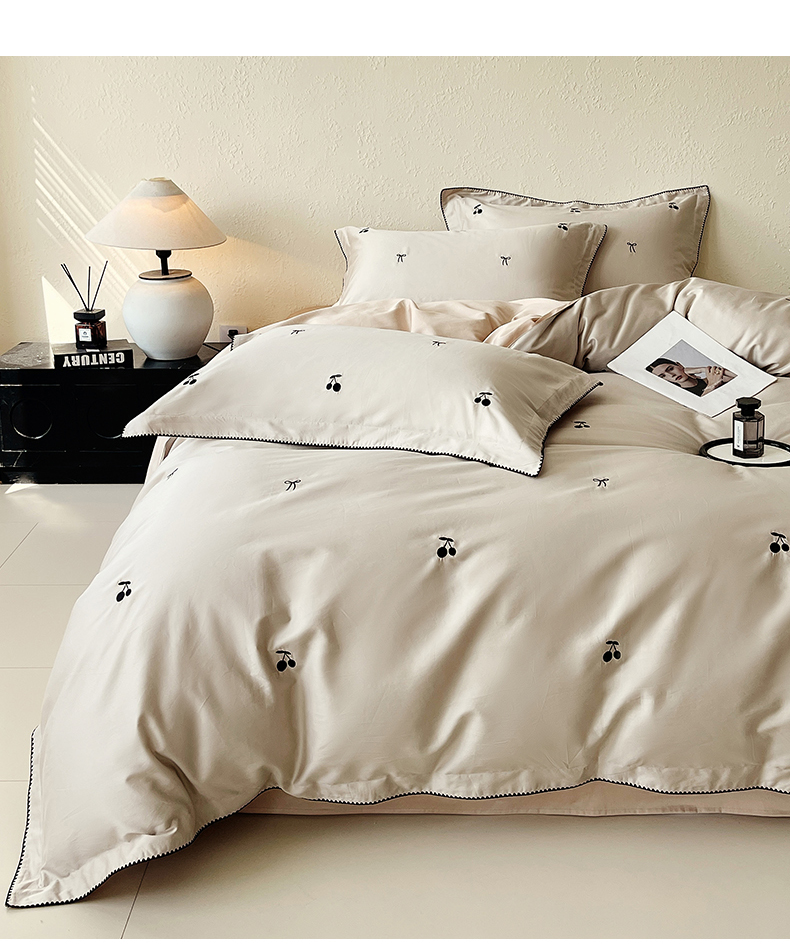 当前位置: 91家纺网 > 商品网购 > 床品套件 > 四件套 > 全棉普通四件套 > 琪格格纺织 2026新款100s纯棉贡缎纯色长绒棉纯棉樱桃刺绣床上用品四件套 黑樱小甜-香槟