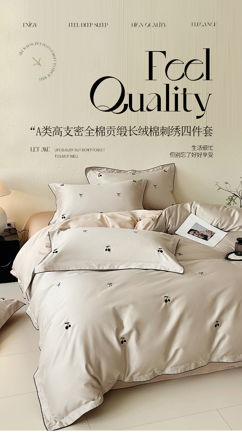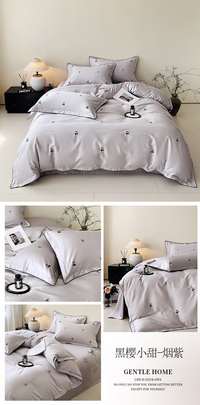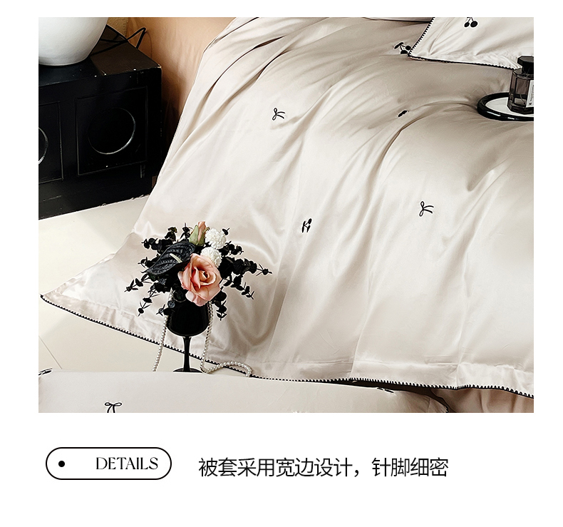 当前位置: 91家纺网 > 商品网购 > 床品套件 > 四件套 > 全棉普通四件套 > 琪格格纺织 2026新款100s纯棉贡缎纯色长绒棉纯棉樱桃刺绣床上用品四件套 黑樱小甜-香槟