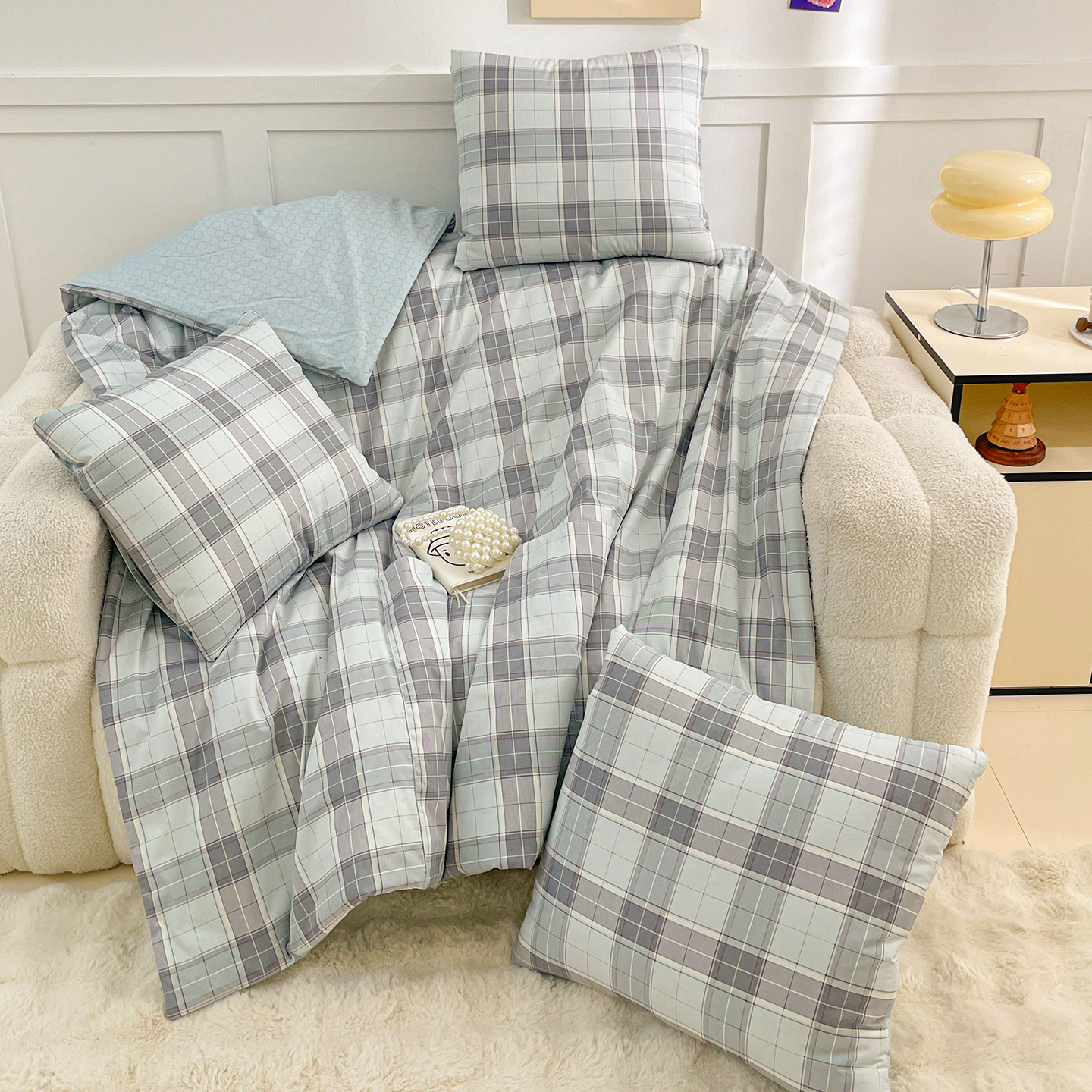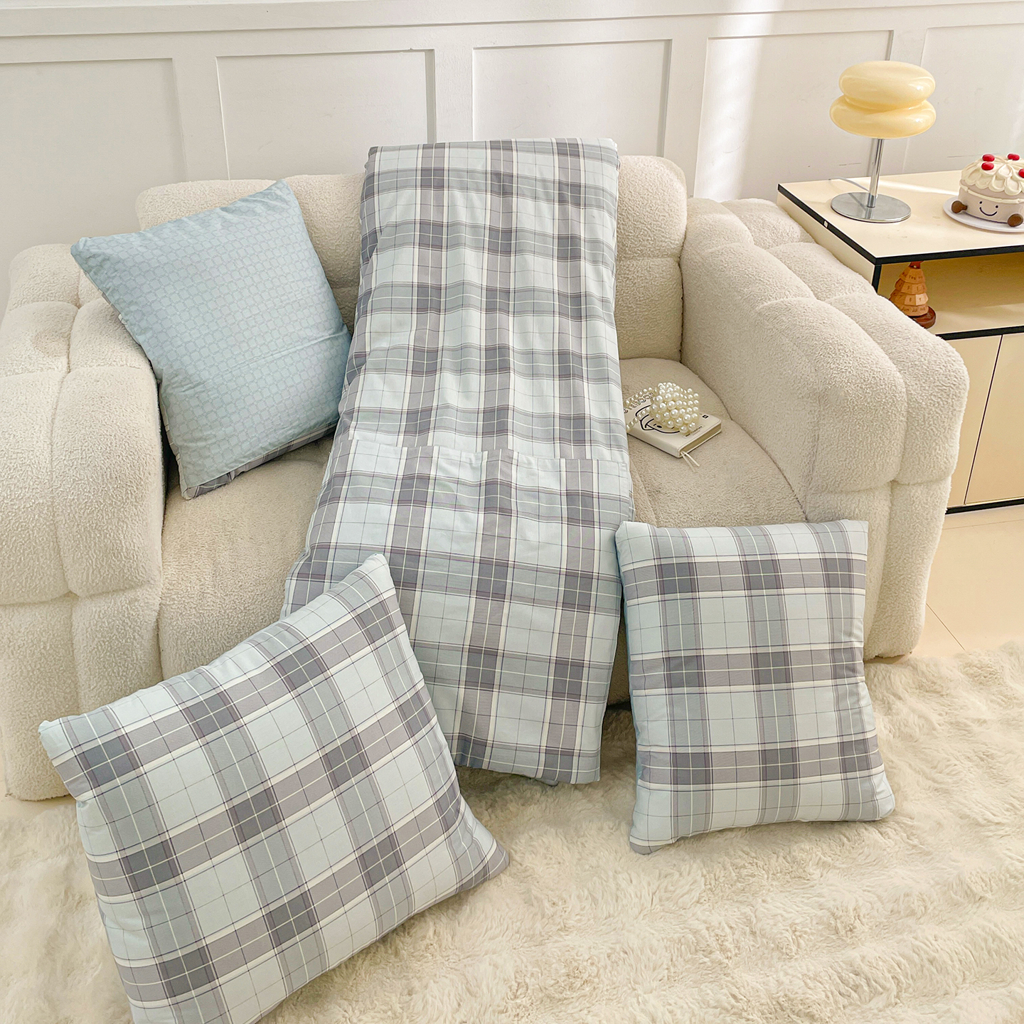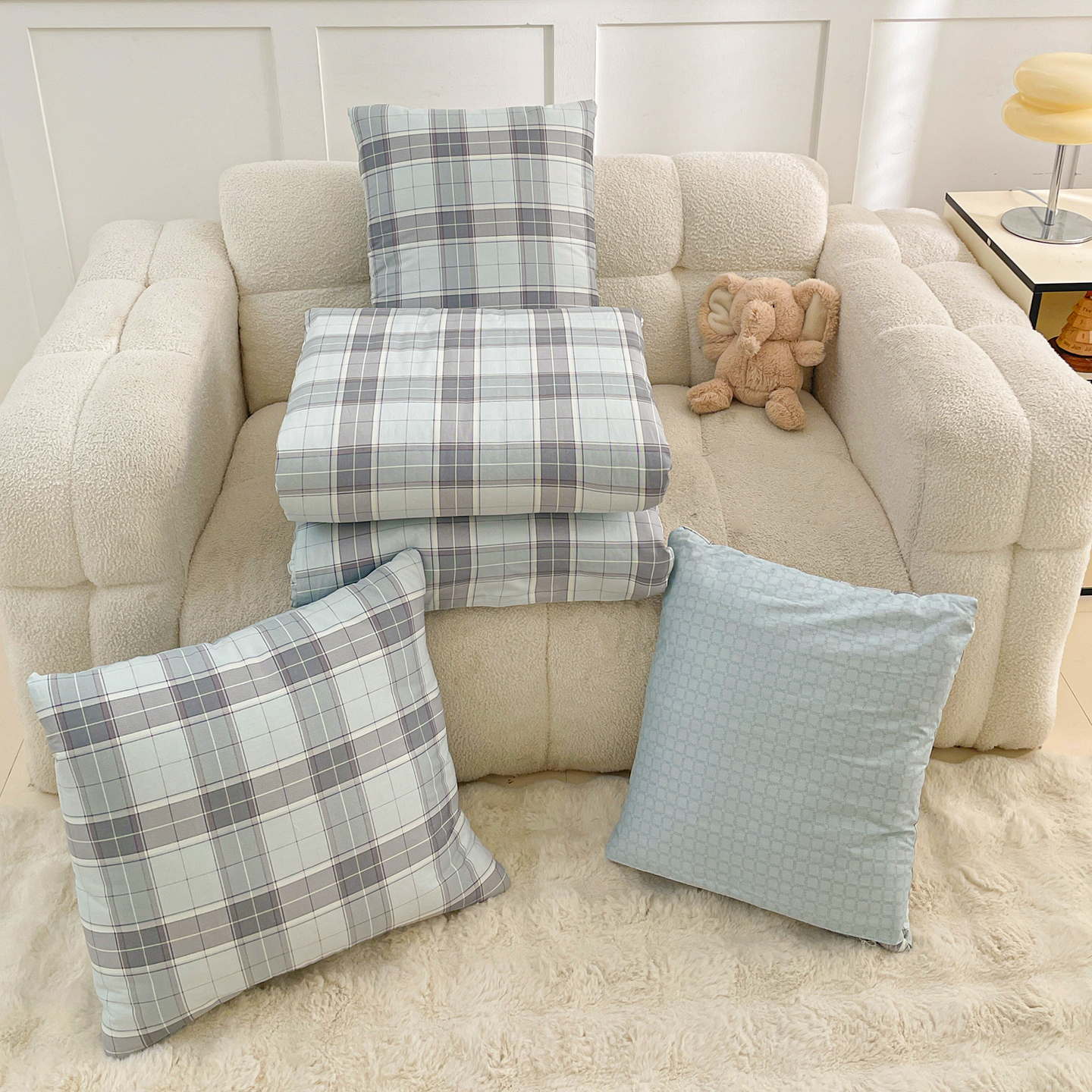 商品名称:多米家居 2025新款全棉口袋印花抱枕被 格韵-蓝