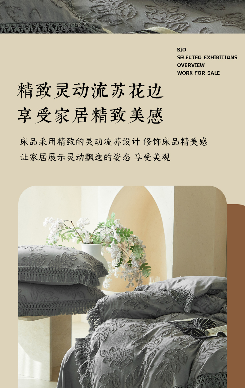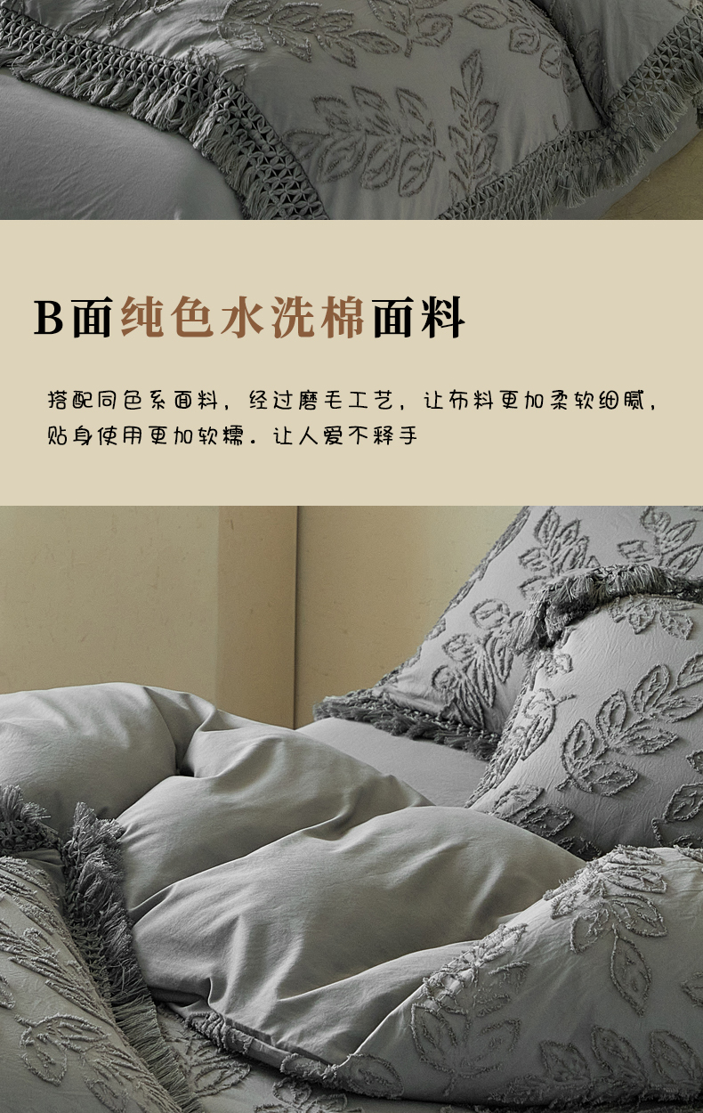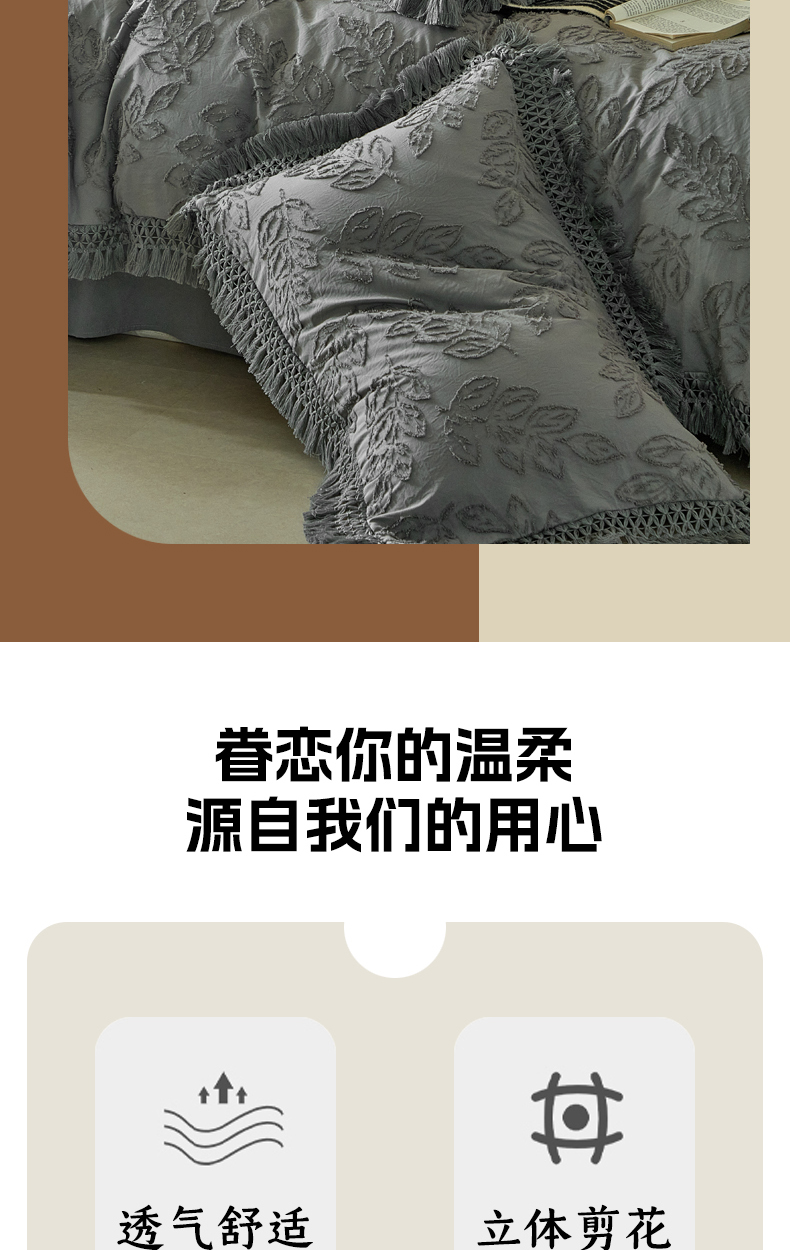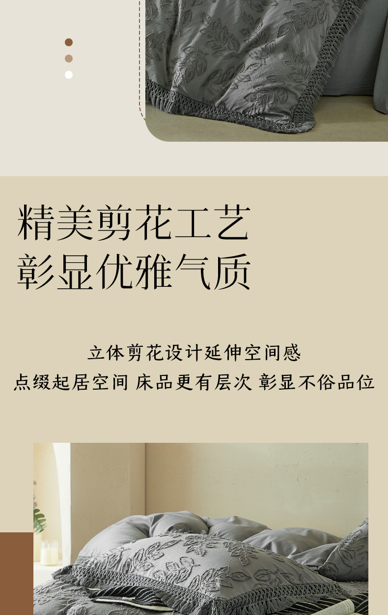 当前位置: 91家纺网 > 商品网购 > 床品套件 > 四件套 > 其它四件套 > 缘生活 2026春夏新款民宿立体剪花蝴蝶结流苏四件套 剪花落叶流苏深灰