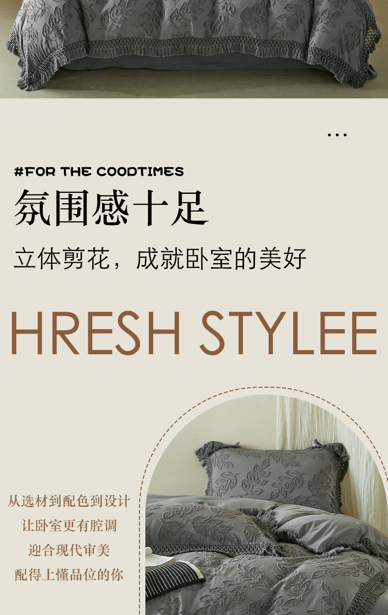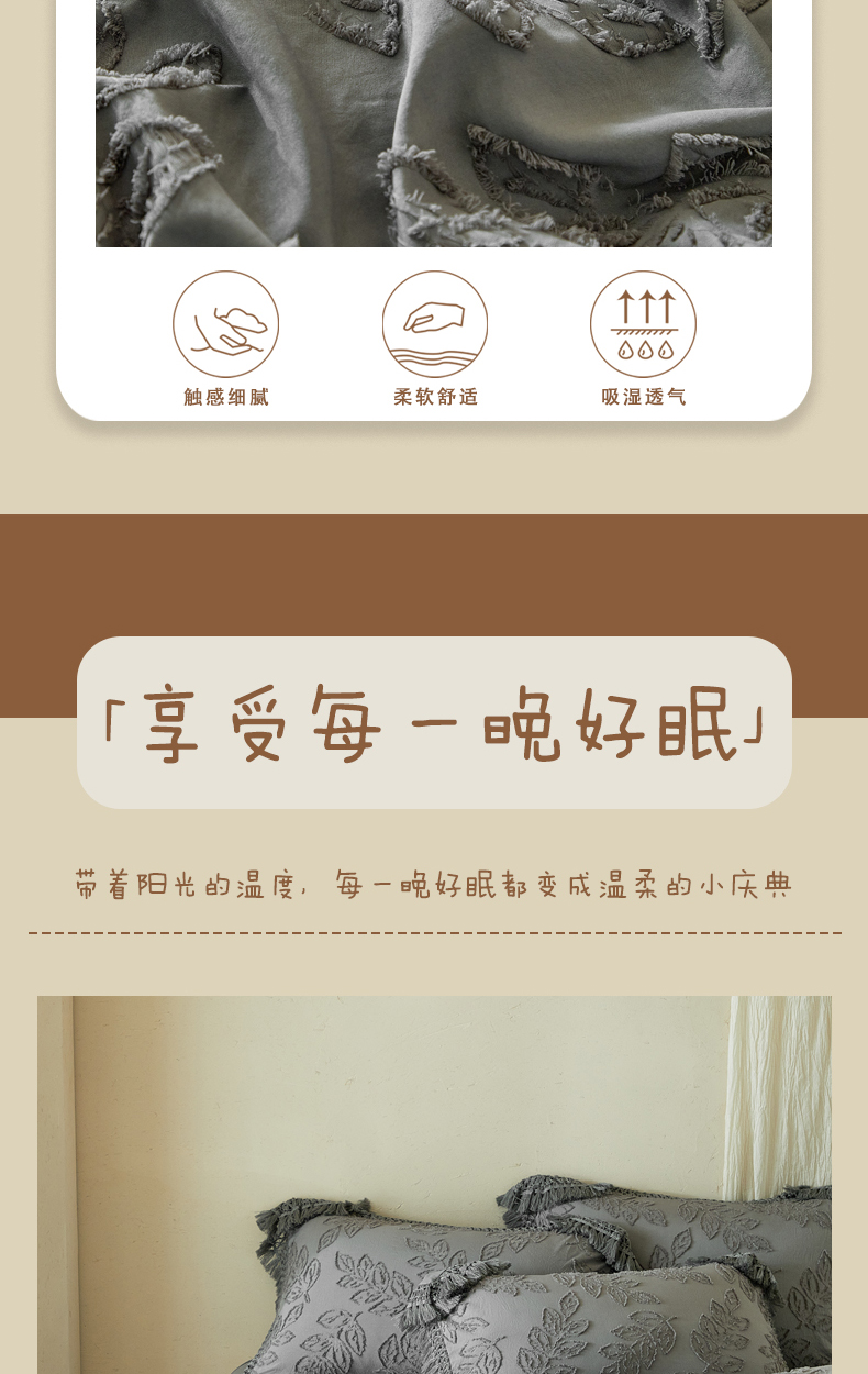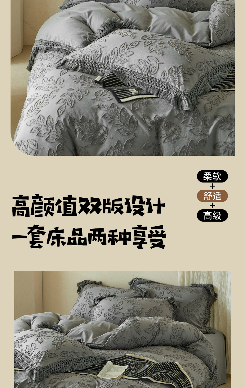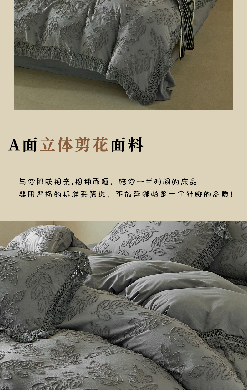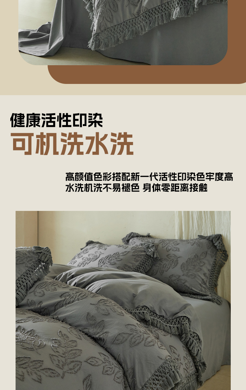 当前位置: 91家纺网 > 商品网购 > 床品套件 > 四件套 > 其它四件套 > 缘生活 2026春夏新款民宿立体剪花蝴蝶结流苏四件套 剪花落叶流苏深灰