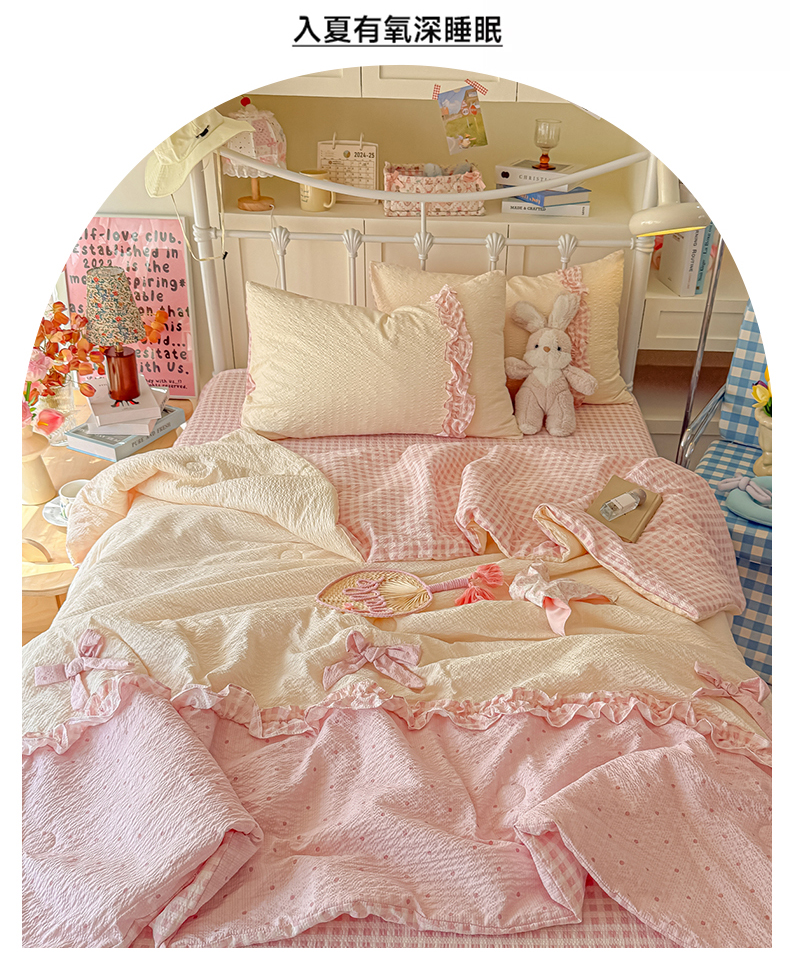 (总)瑞禾家纺(原阿亮) 2026新款提花泡芙棉拼角蝴蝶结软乎乎的撸猫感单夏被夏被四件套-甜莓气泡,甜莓气泡-海盐蓝波点,甜莓气泡-奶粉波点,甜莓气泡-奶红波点,甜莓气泡-奶灰波点,组合图(仅供展示不可下单)