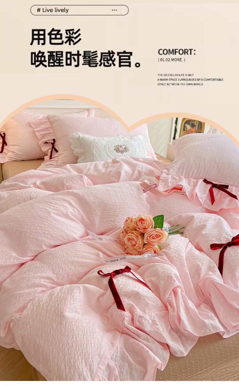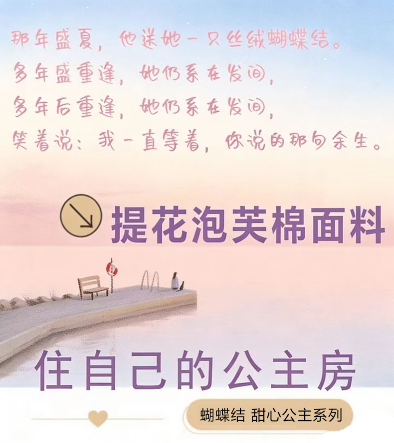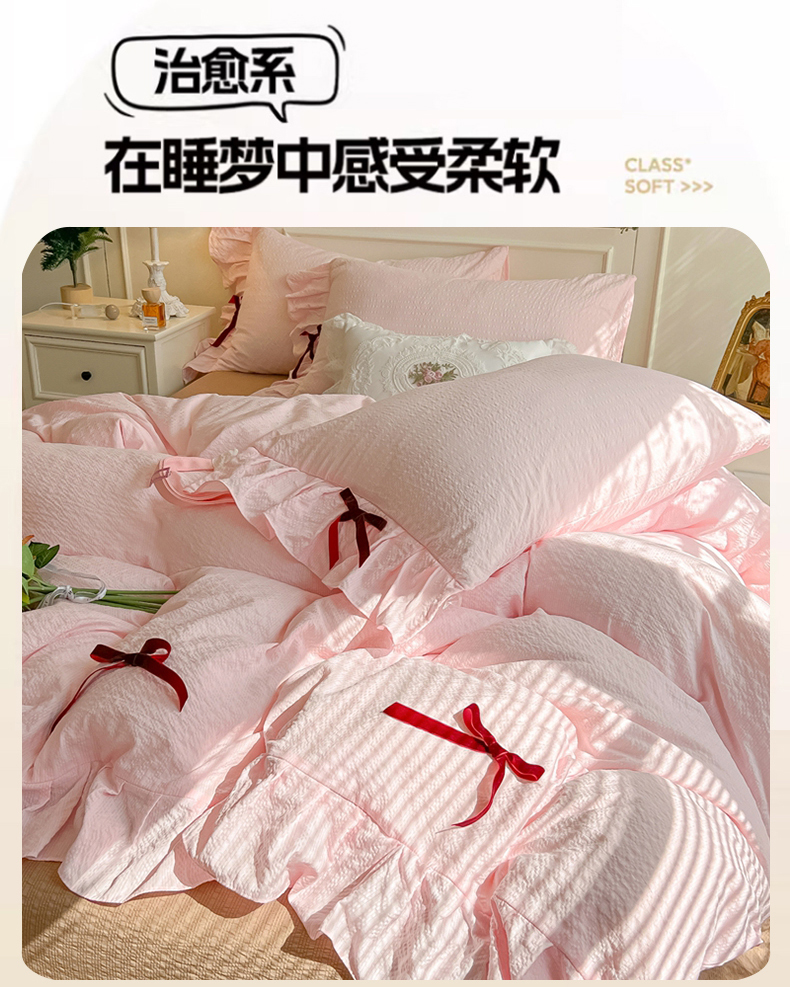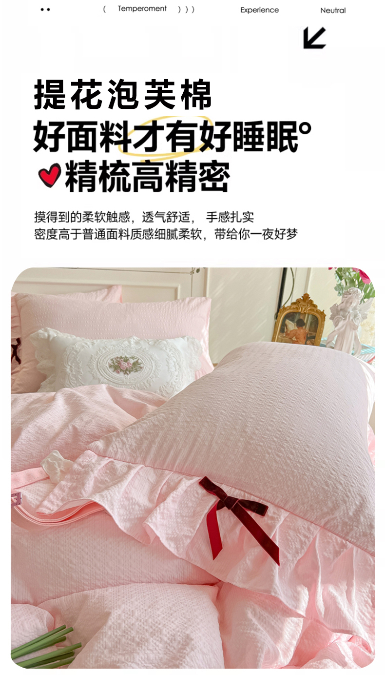 当前位置: 91家纺网 > 商品网购 > 床品套件 > 四件套 > 其它四件套 > 瑞禾家纺(原阿亮) 2026春夏新款提花泡芙棉花边蝴蝶结床单床笠四件套-甜心公主 甜心公主-奶油粉