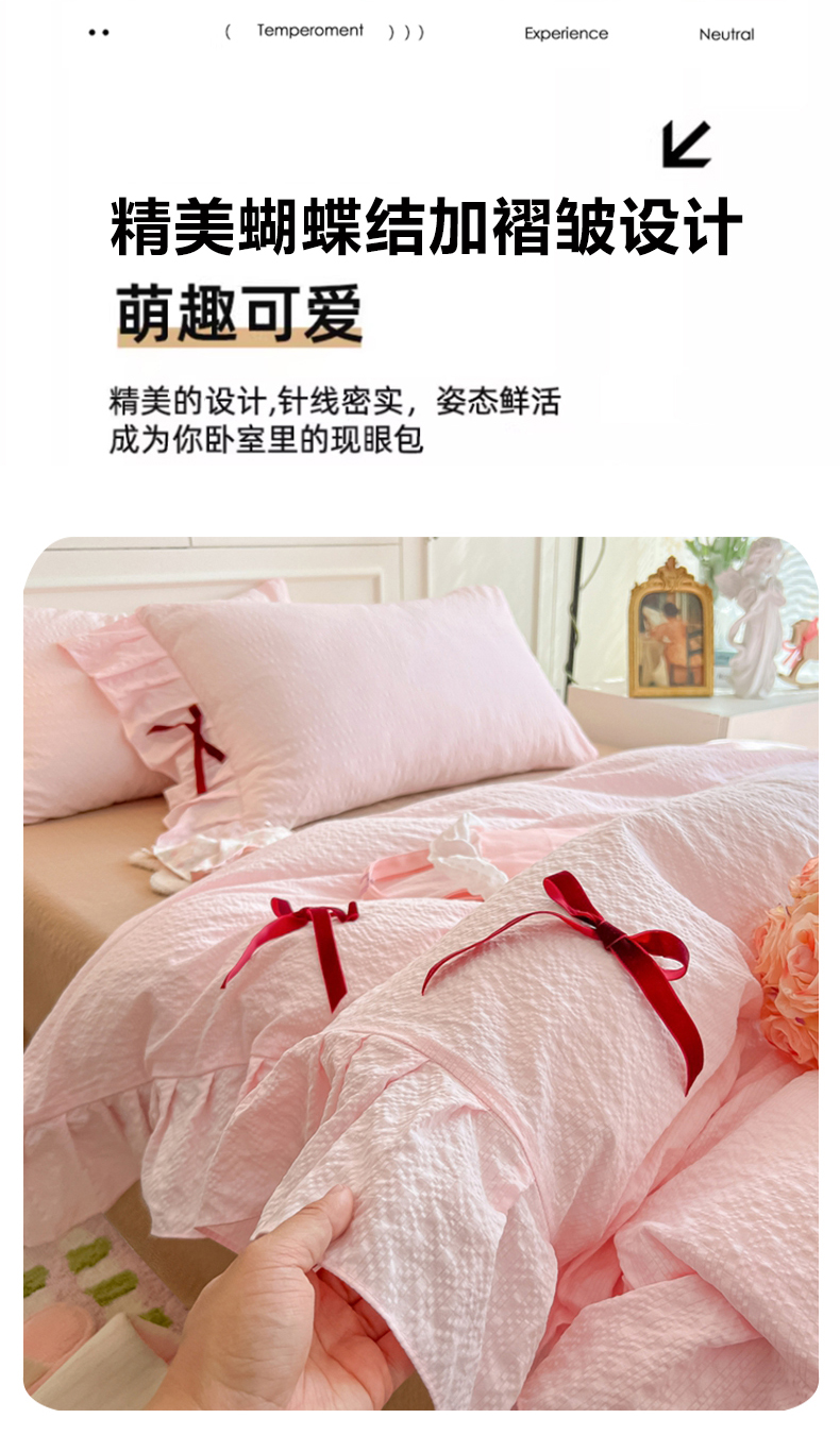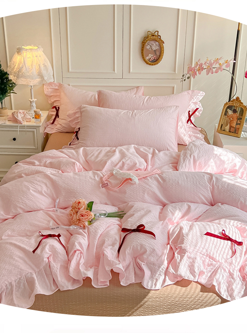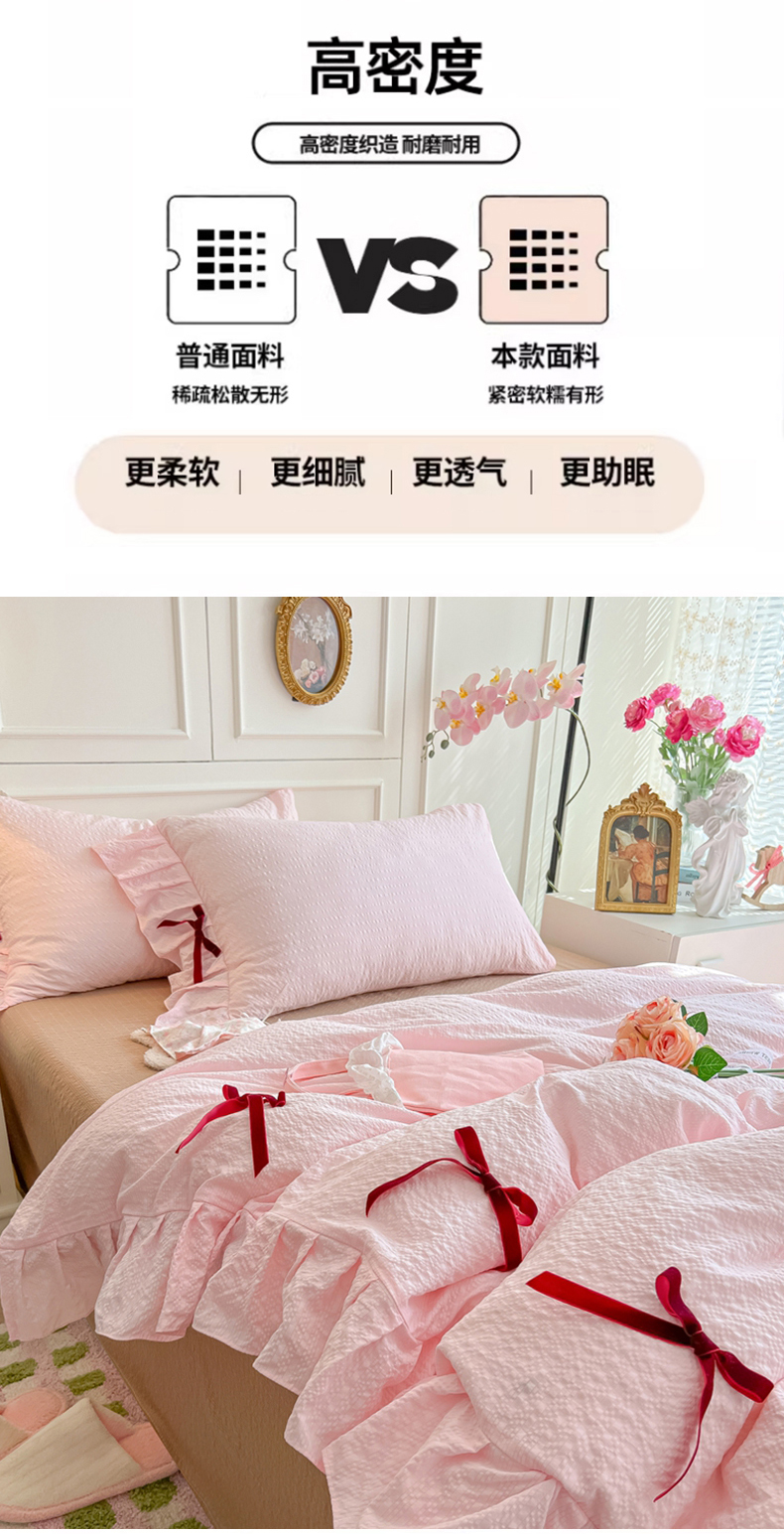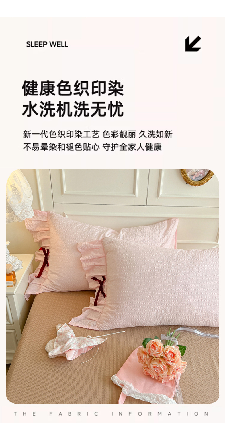 当前位置: 91家纺网 > 商品网购 > 床品套件 > 四件套 > 其它四件套 > 瑞禾家纺(原阿亮) 2026春夏新款提花泡芙棉花边蝴蝶结床单床笠四件套-甜心公主 甜心公主-奶油粉