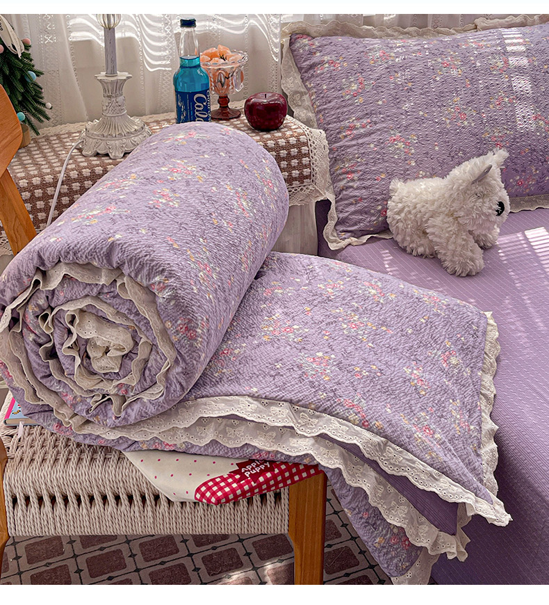 优承佳生活馆 2026新款超柔高克重泡芙纱蝴蝶结全棉花边夏被套件单夏被 紫萱
