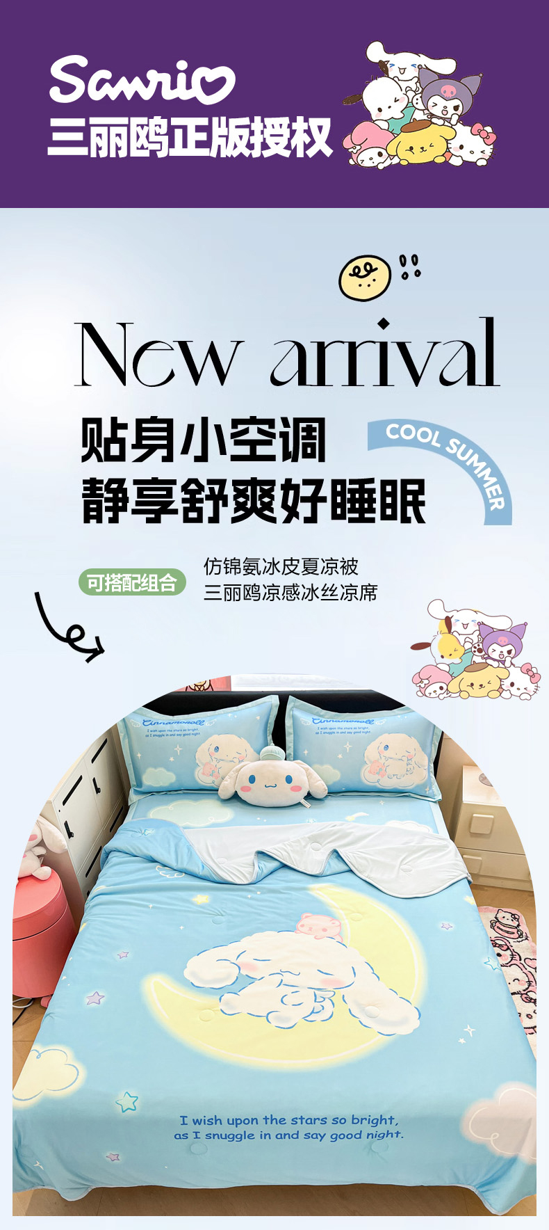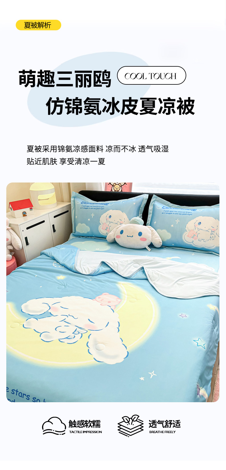 暮思家居 2026新款正版授权A类大版数码印花三丽鸥可组合仿锦氨夏被夏凉被空调被 晚安玉桂狗