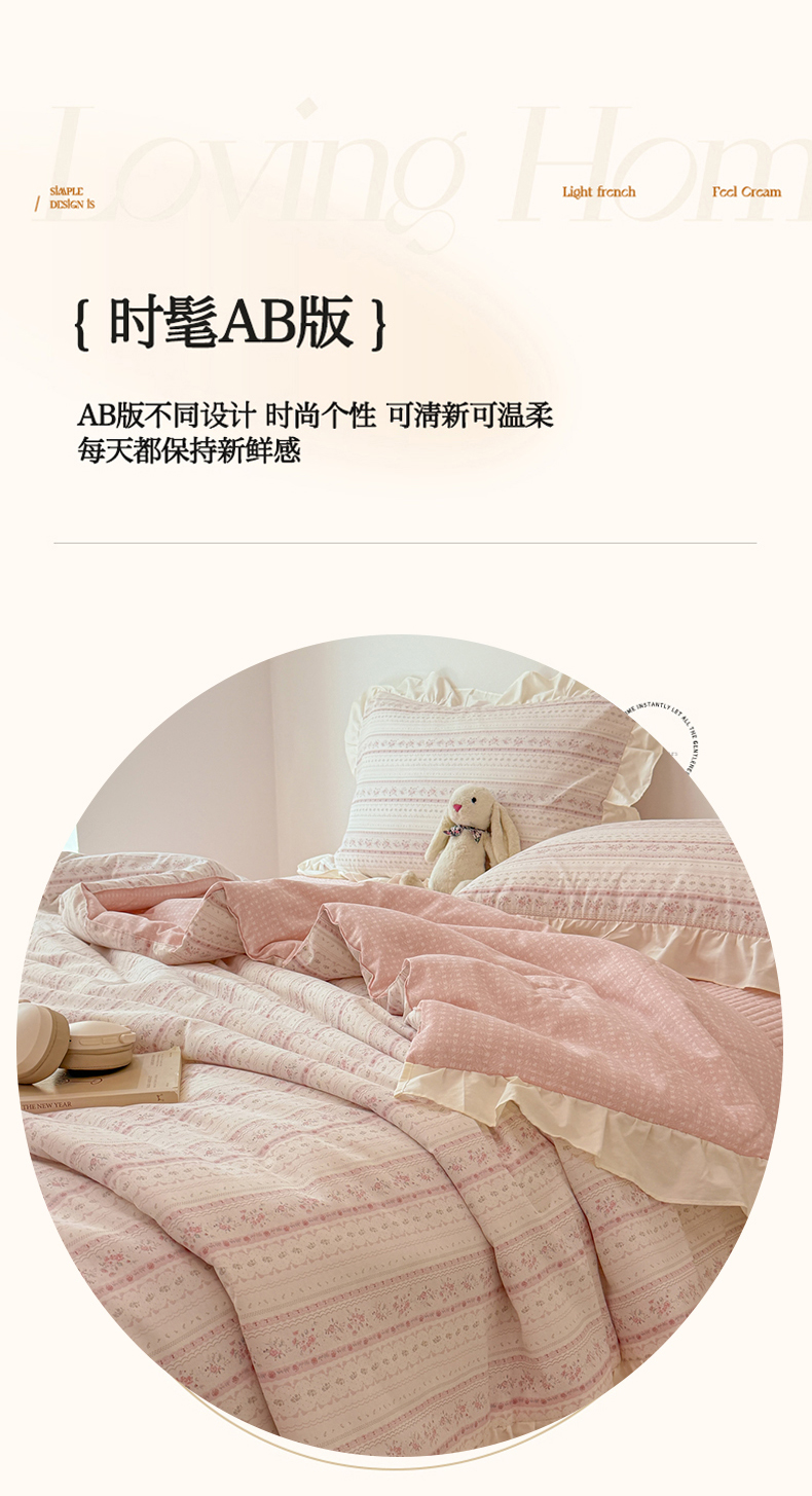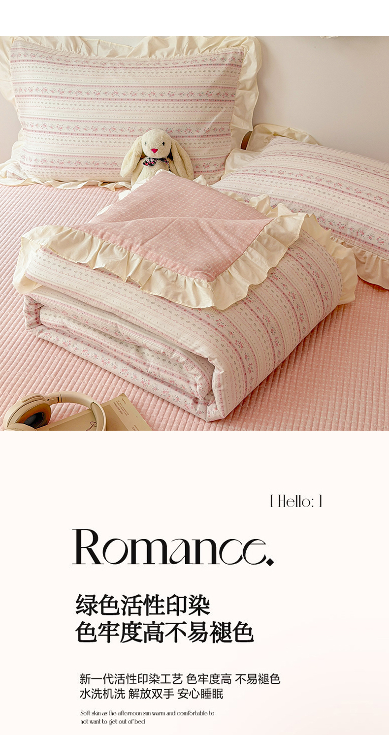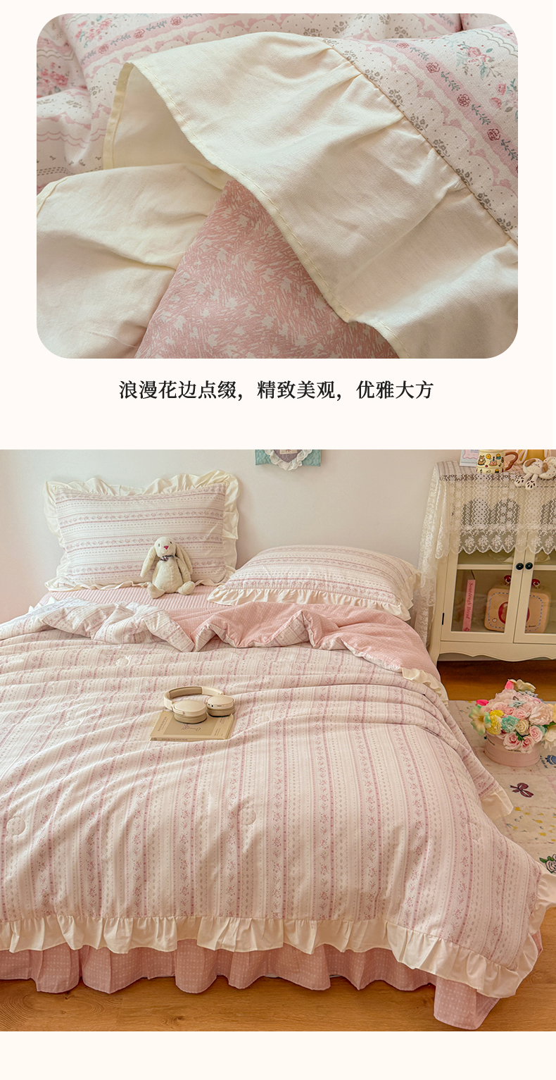 当前位置: 91家纺网 > 商品网购 > 床品套件 > 四件套 > 夏被四件套 > 简宜家居(朝初家纺) 2026新款全棉花边夏被全棉床盖夏被四件套 素条花-粉