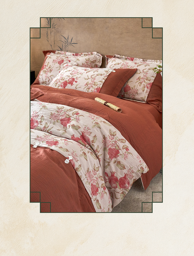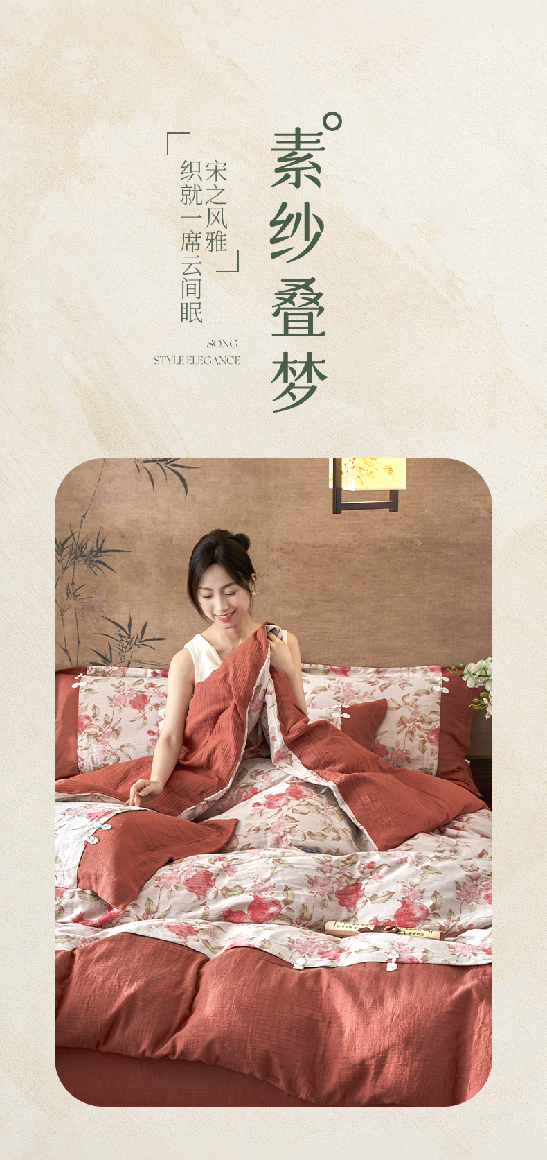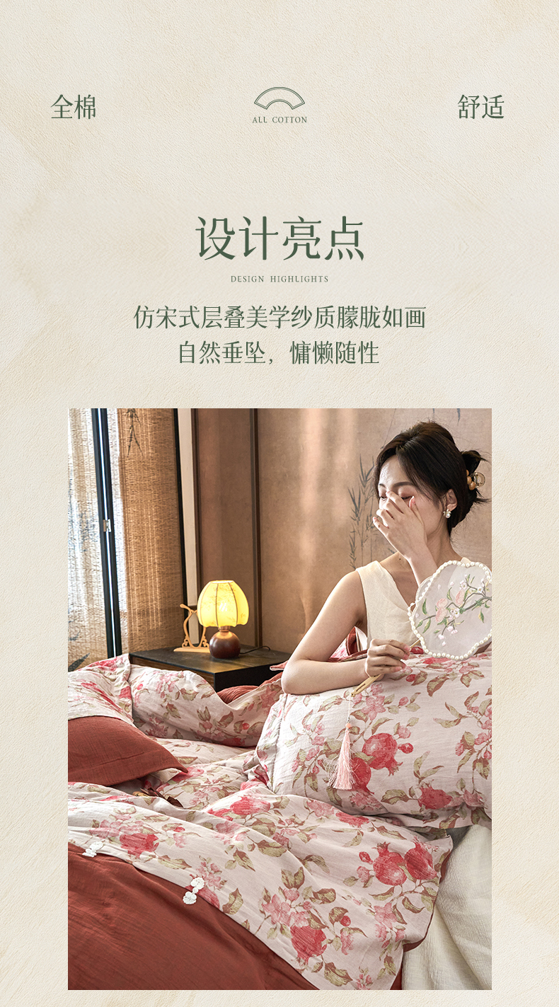 商品名称:春皖家纺 2026新款全棉提花双层纱盘扣四件套-旗袍风系列 多子多福