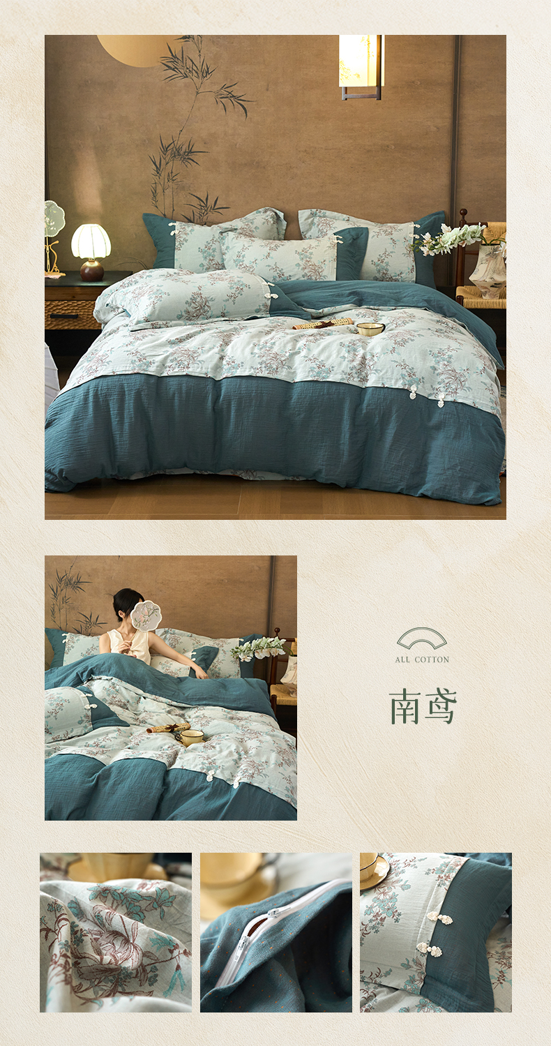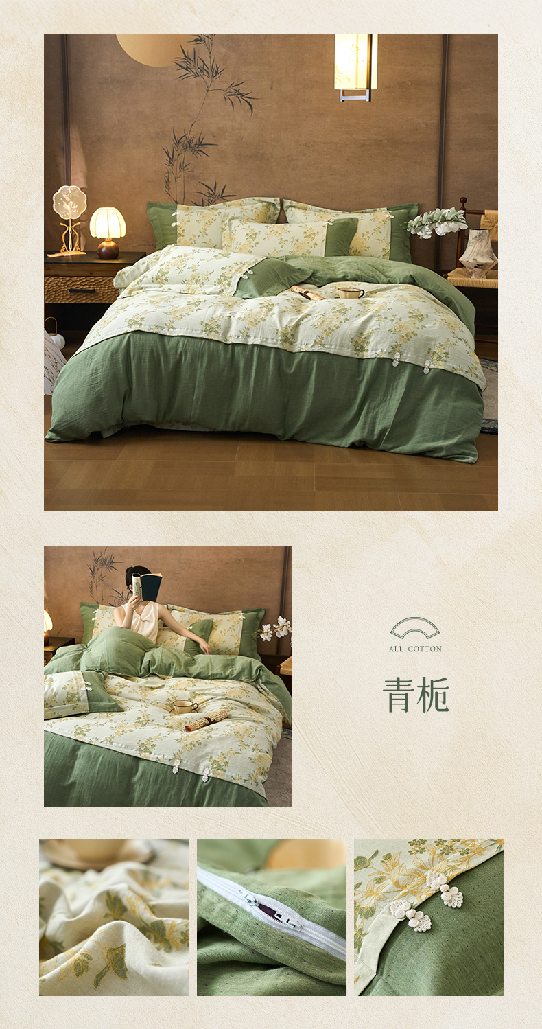 (总)春皖家纺 2026新款全棉提花双层纱盘扣四件套-旗袍风系列,多子多福,红蕊,梦里江南,南鸢,青栀,玉茗,紫气东来,组合图