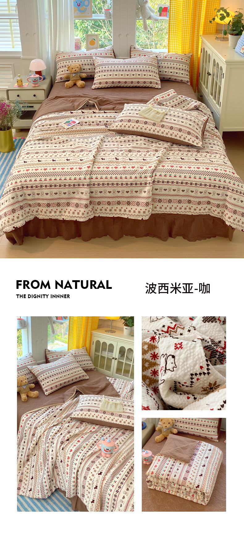 (总)莱米家纺 2026新款云感泡泡纱双层纱床盖四件套,海底星星,费尔岛红,费尔岛咖,费尔岛紫,卡其波点,绿花枝叶,绿樱桃,兔兔之家,星星人,紫色爱心,棕蝴蝶结