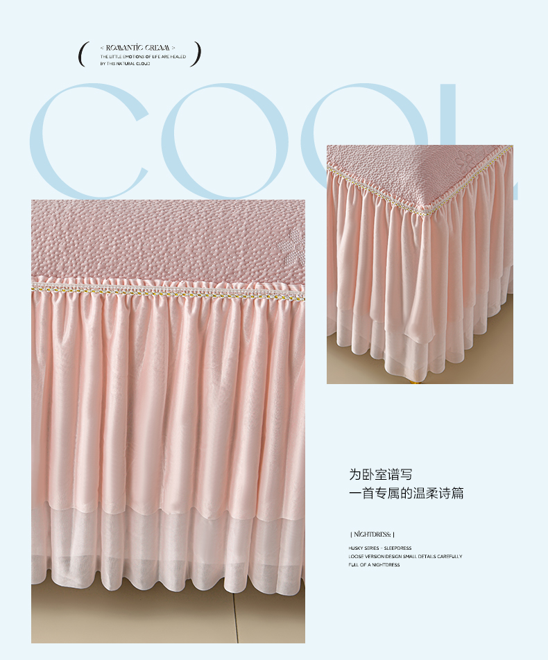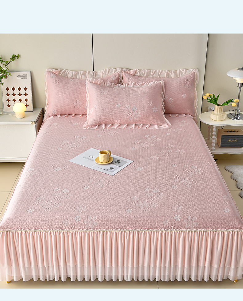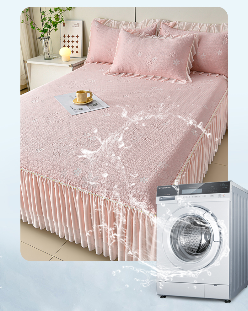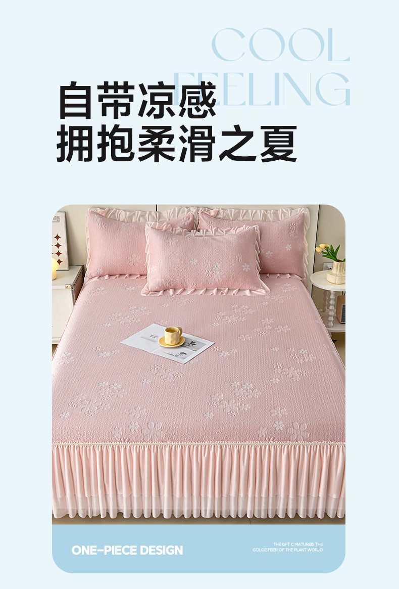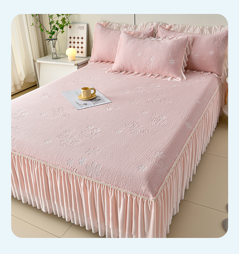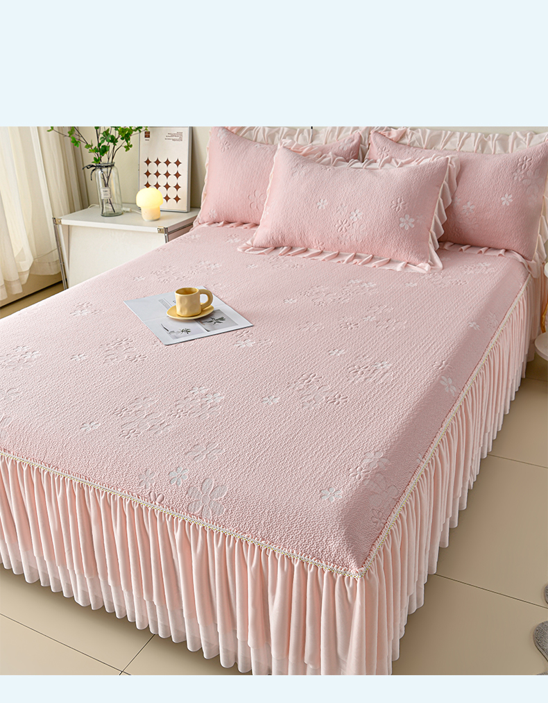 (总)畅畅家纺 2026新款锦氨夏被PE凉感豆豆凉席绣花三明治复合床裙三件套四件套,格韵-粉-床裙款,格韵-灰-床裙款,格韵-蓝-床裙款,格韵-绿-床裙款