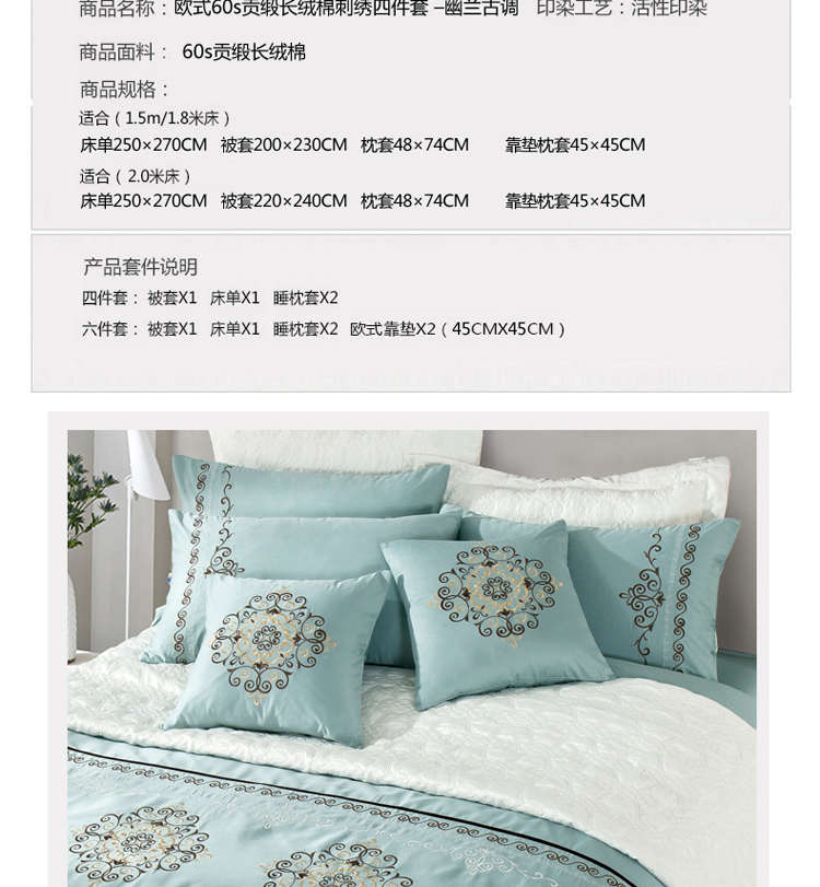 商品名称:兴美佳家纺 欧式60s贡缎长绒棉刺绣四件套幽兰古调-蓝