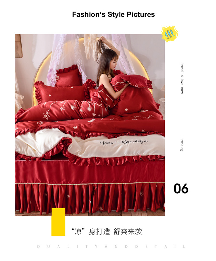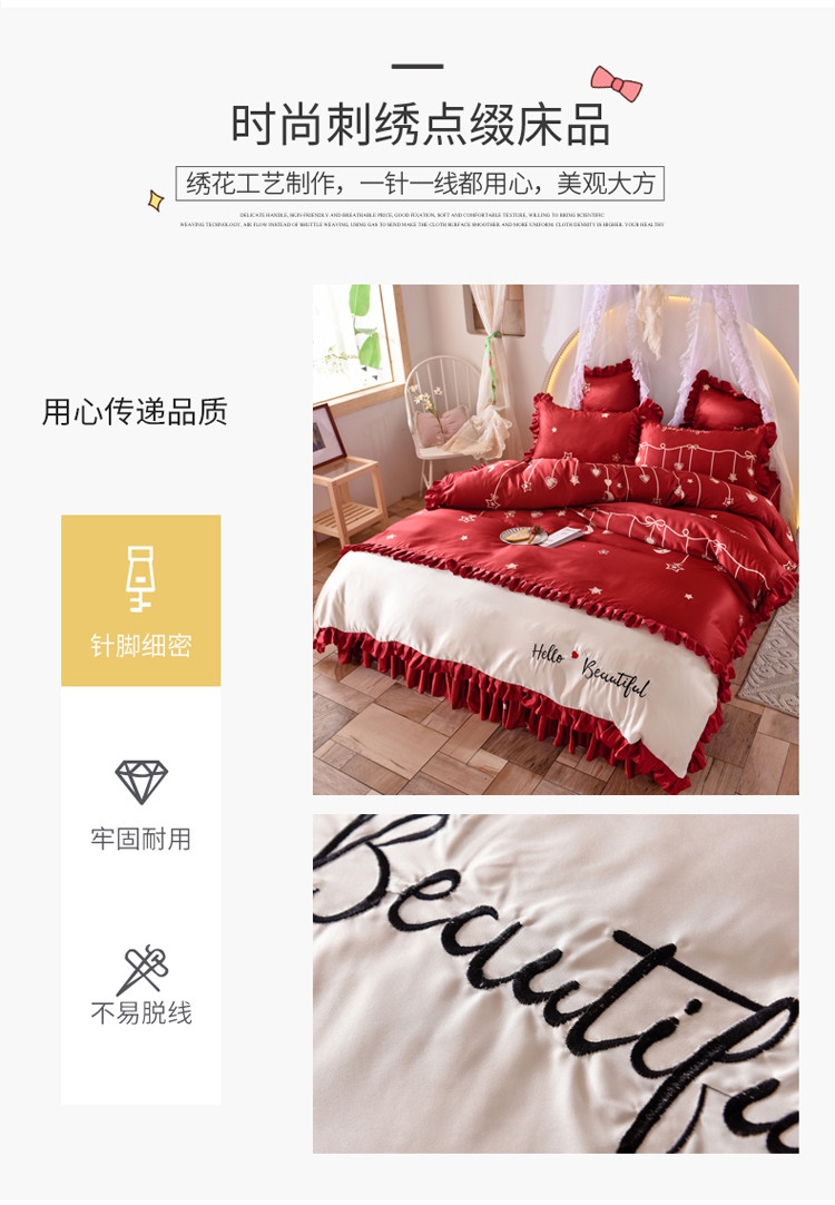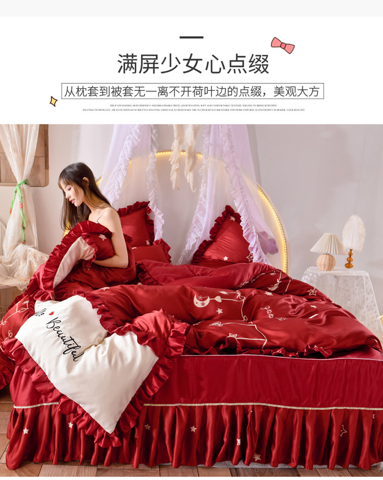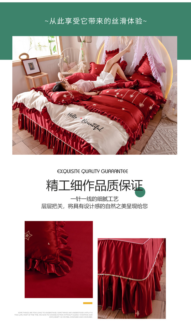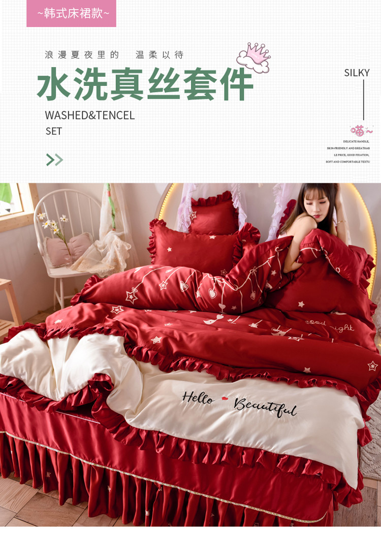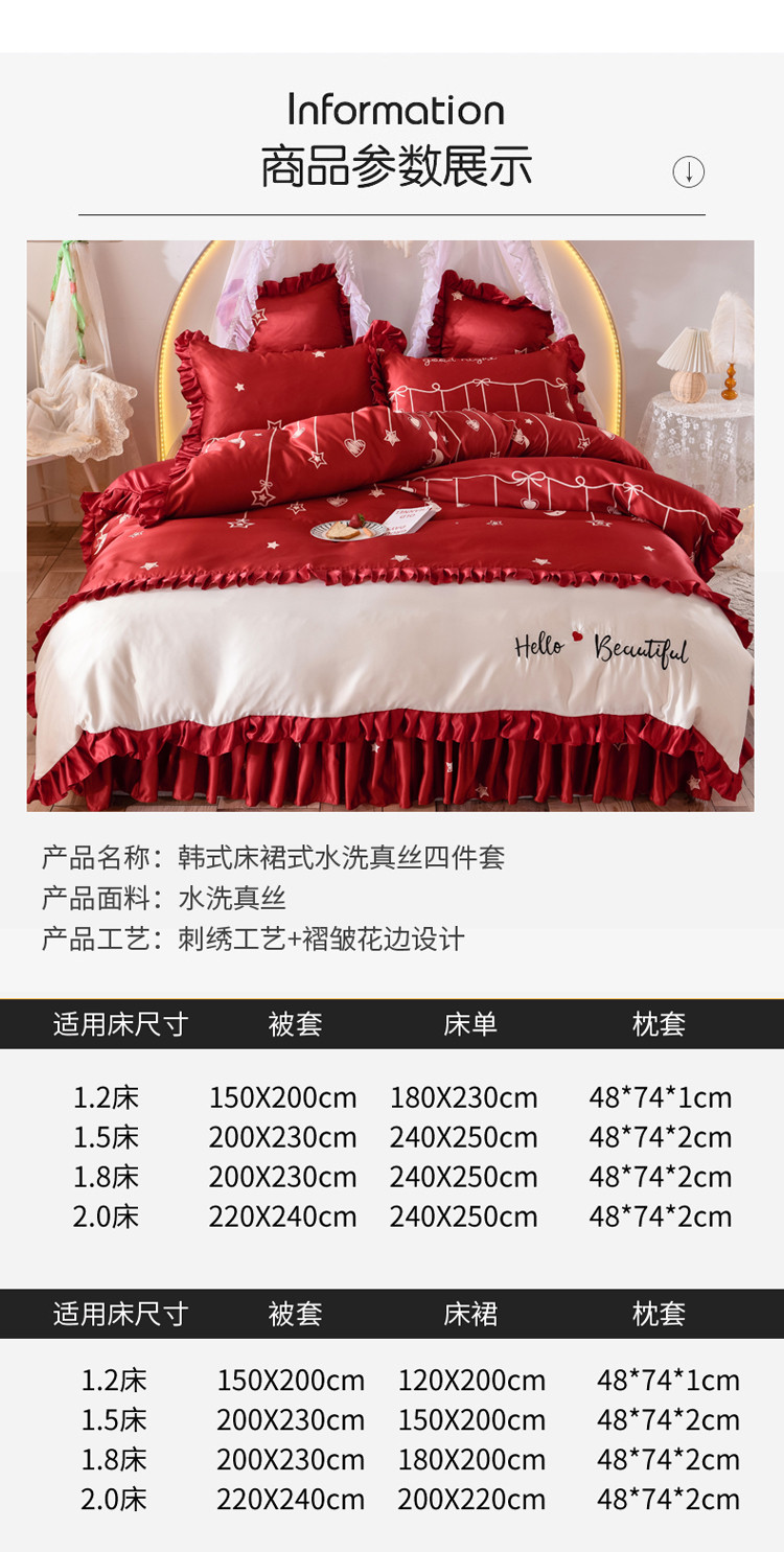 当前位置: 91家纺网 > 商品网购 > 床品套件 > 四件套 > 水洗棉四件套 > 欧冠 2020新款韩式床裙式水洗真丝绣花四件套 心动