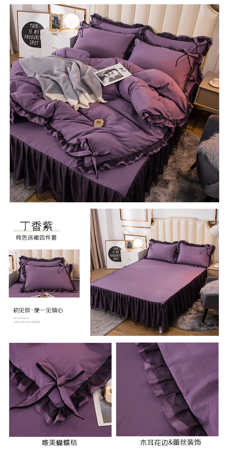 金米诺 新款韩版花边水洗棉泡泡纱四件套公主条四件套 褶皱-浅紫,褶皱-浅紫