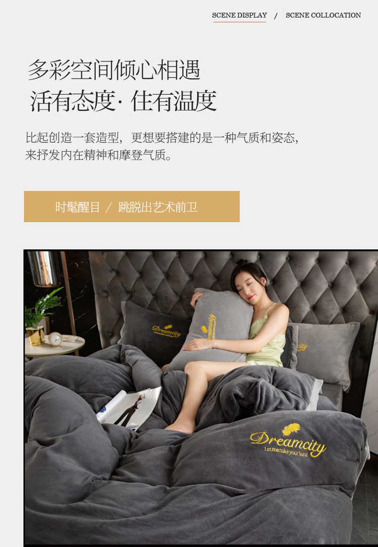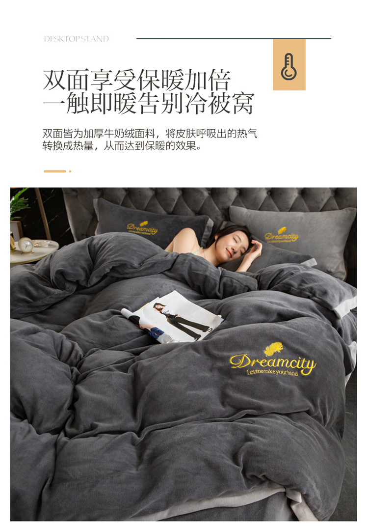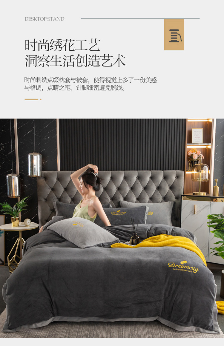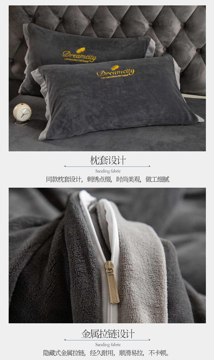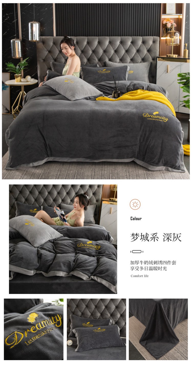 商品名称:莎臣豹 新款高克重牛奶绒拼角包边刺绣绣花四件套 梦城系-深灰