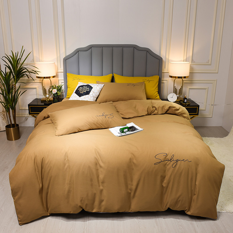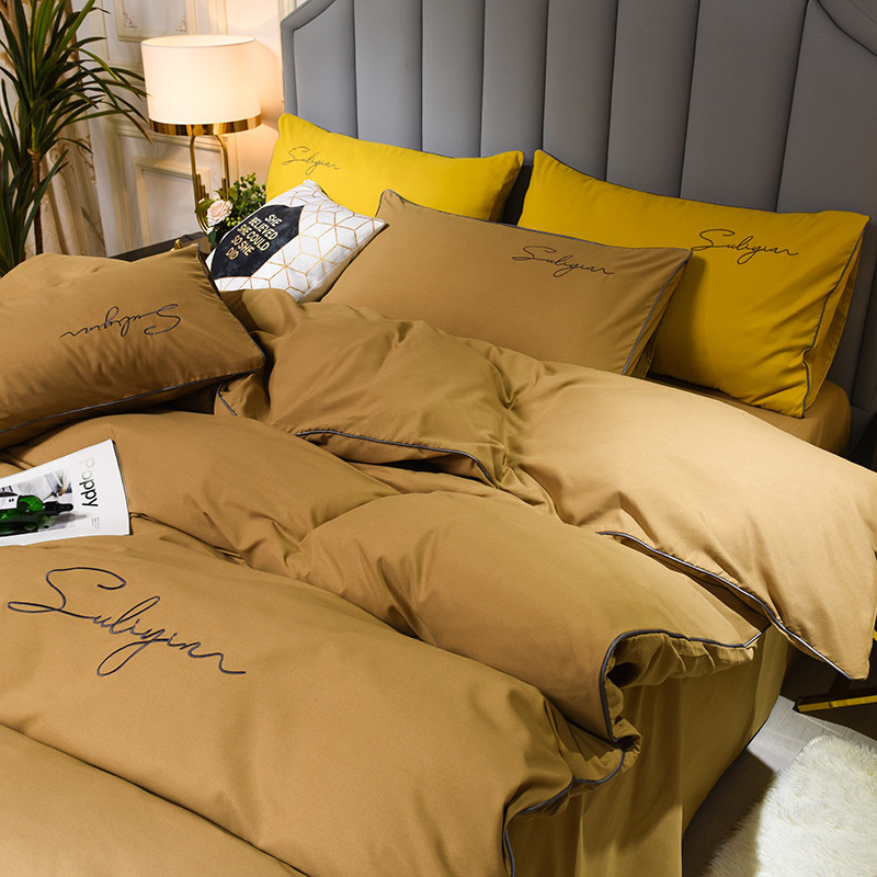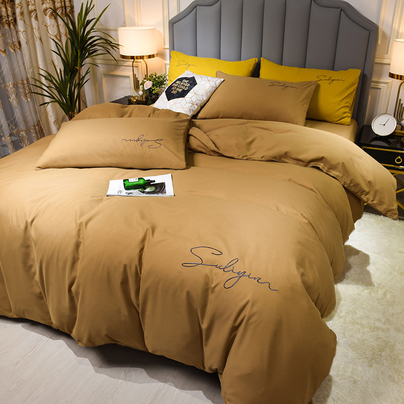孟鑫家纺 2021新款加厚纯色刺绣磨毛四件套 绅士咖