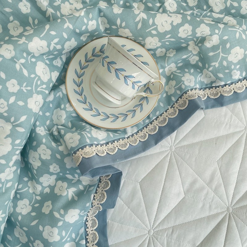 源启生活 2022新镂空花边款双层纱全棉夏凉被纯棉空调被子 初夏蓝