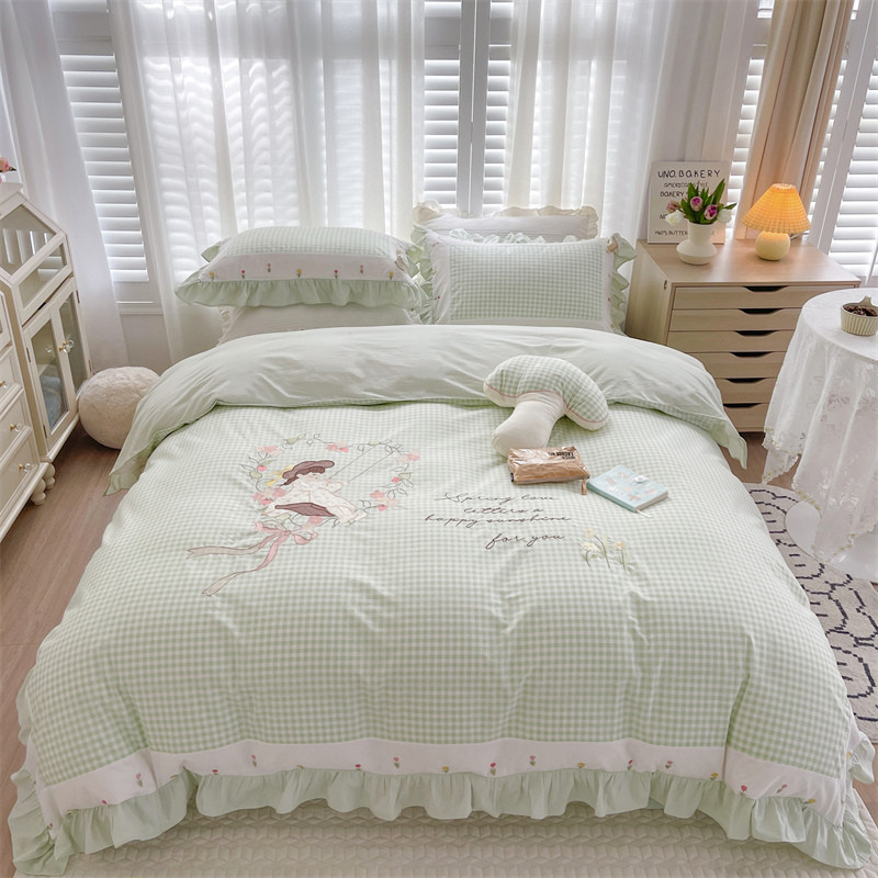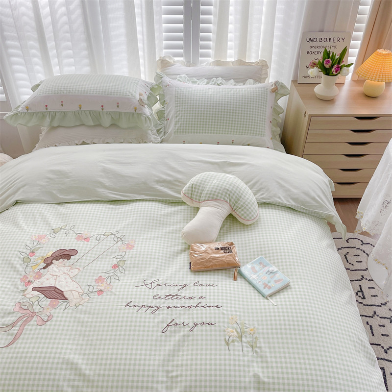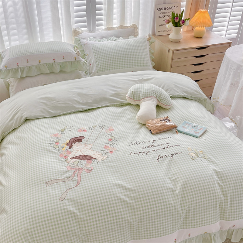 (总)嗨购 2022新款40支水洗棉刺绣花边四件套-春日秋千,春日秋千-粉,春日秋千-绿