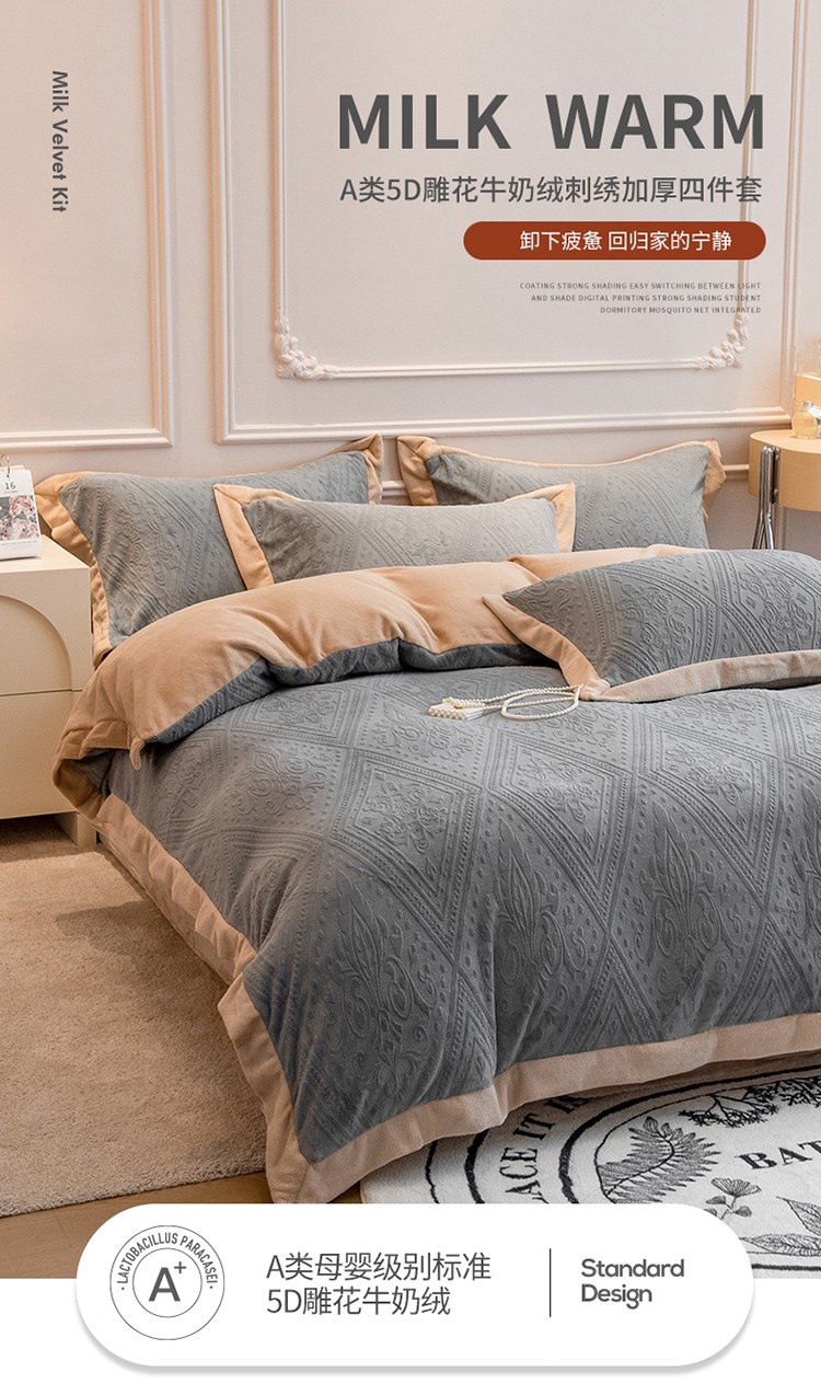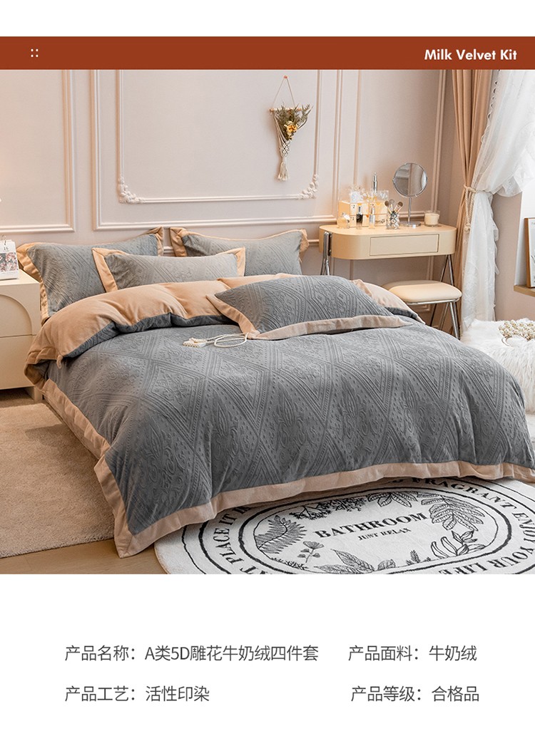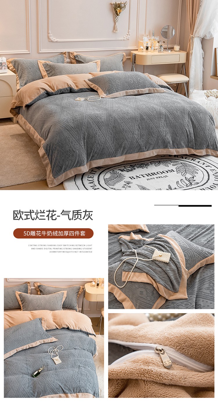 丝幔新款全消光5D雕花牛奶绒四件套 欧式烂花-气质灰