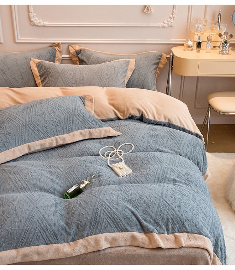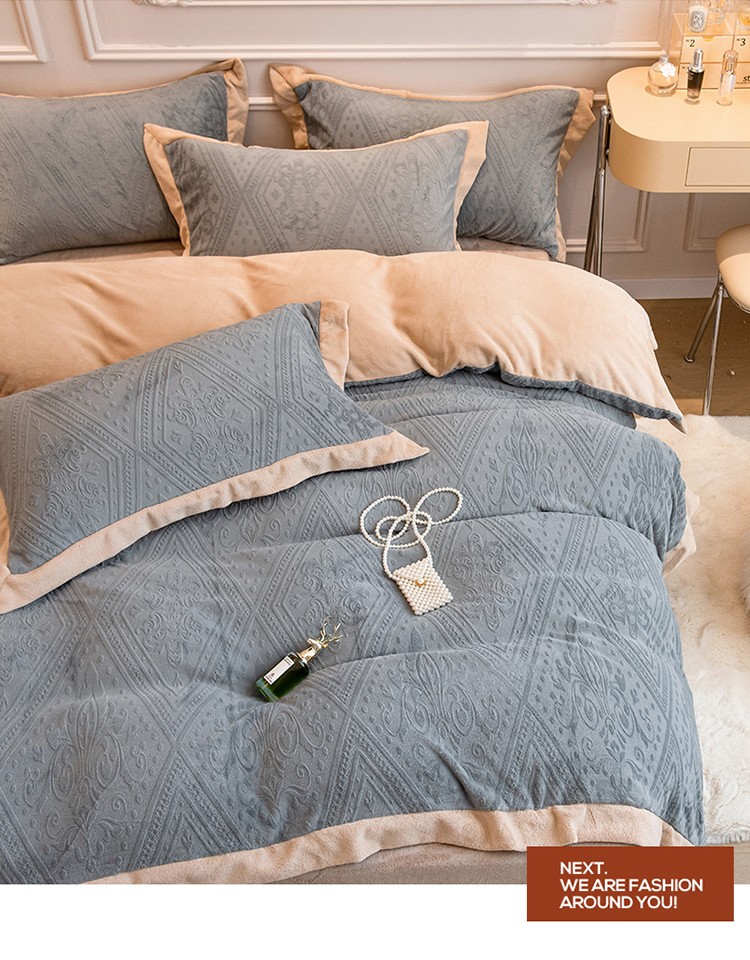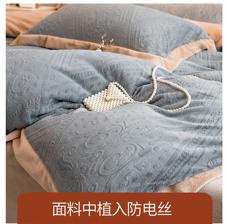 商品名称:丝幔新款全消光5D雕花牛奶绒四件套 欧式烂花-气质灰
