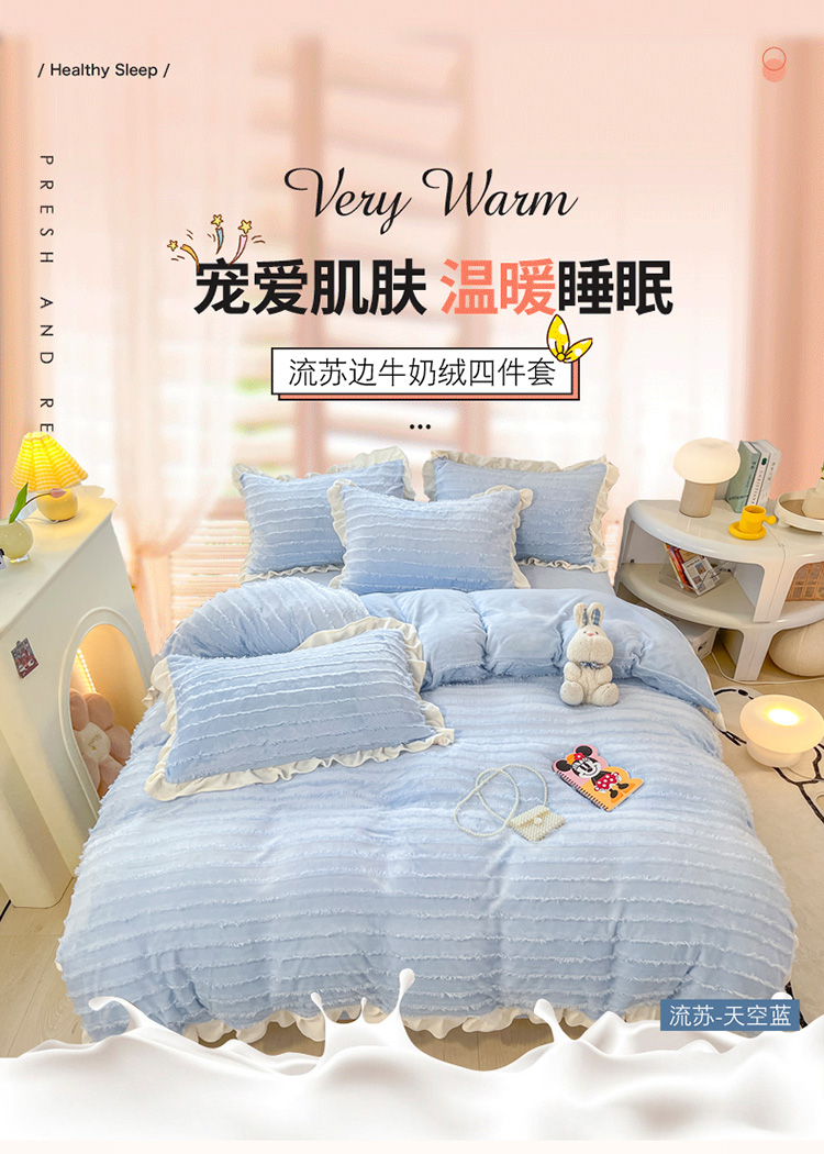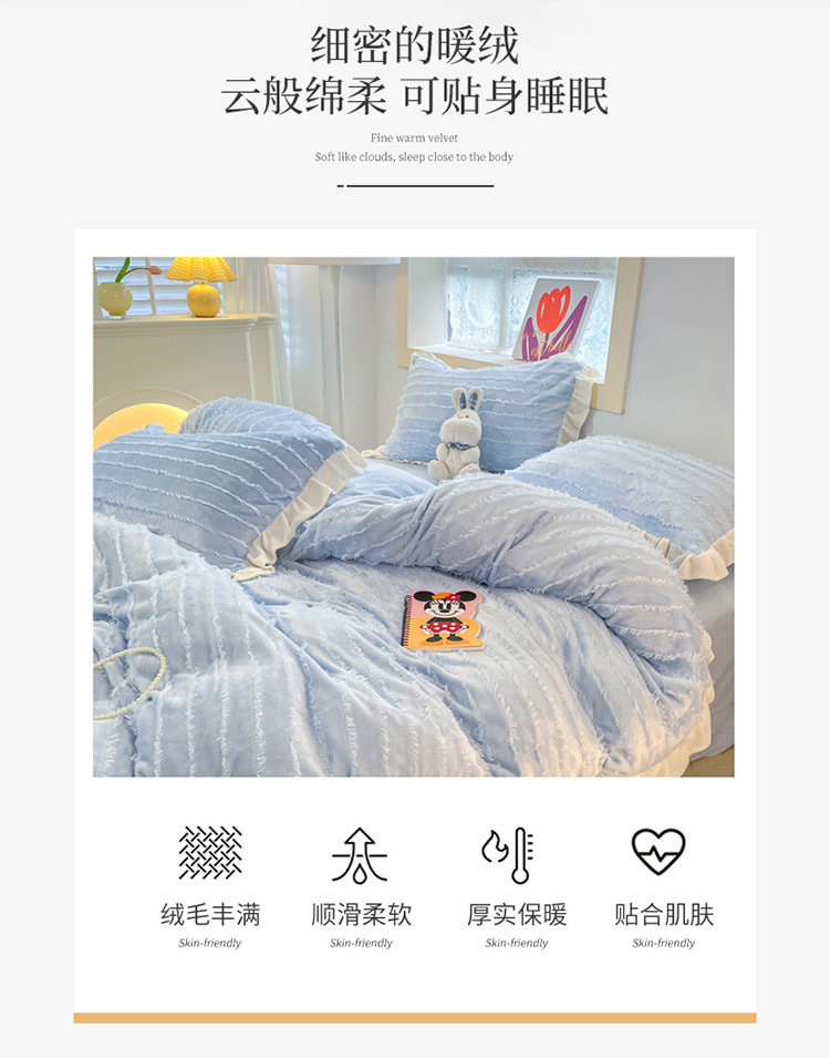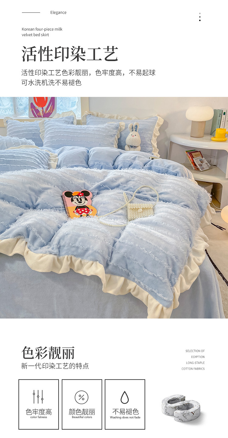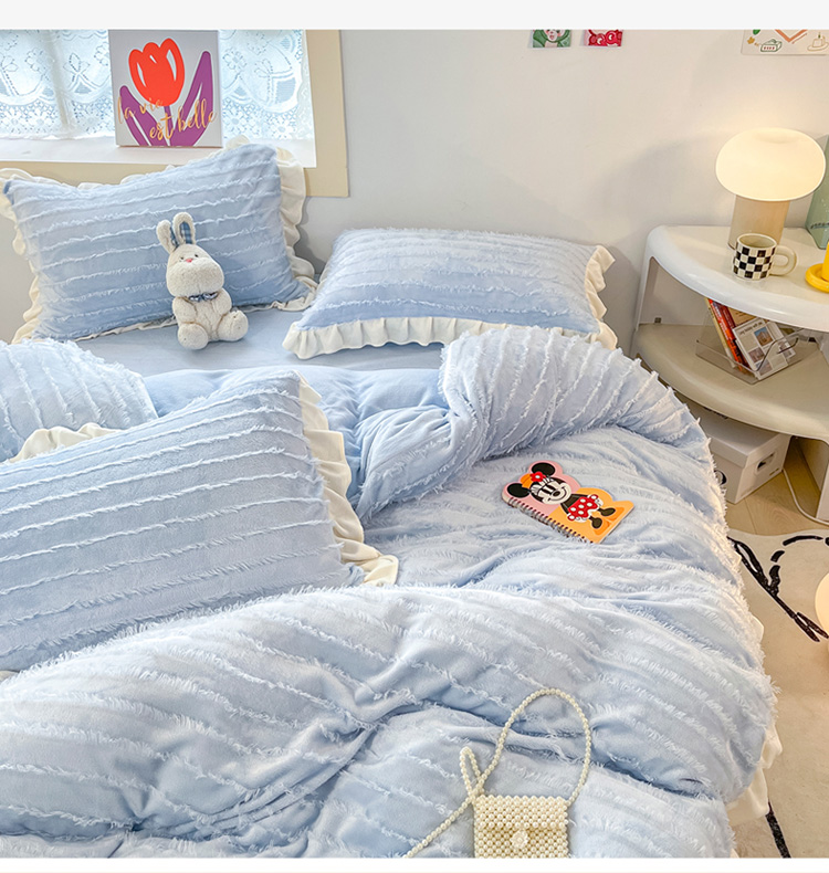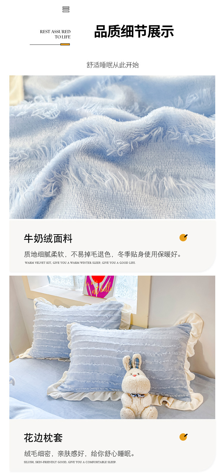 金爱家 2023新款流苏牛奶绒四件套 流苏-天空蓝