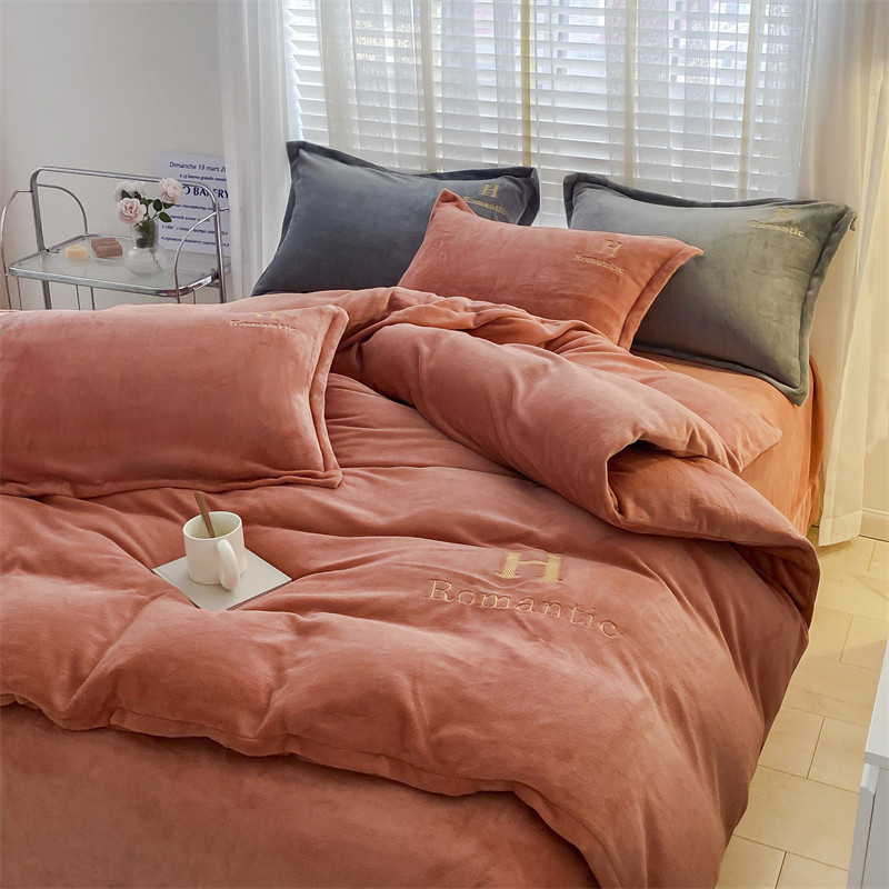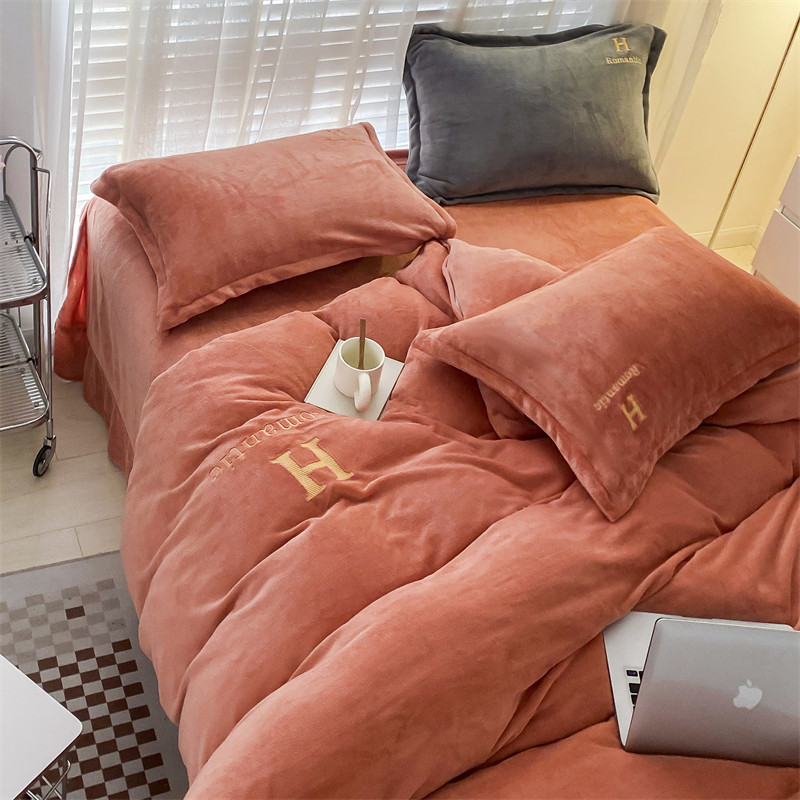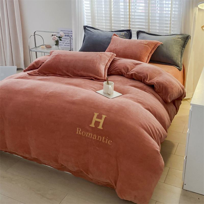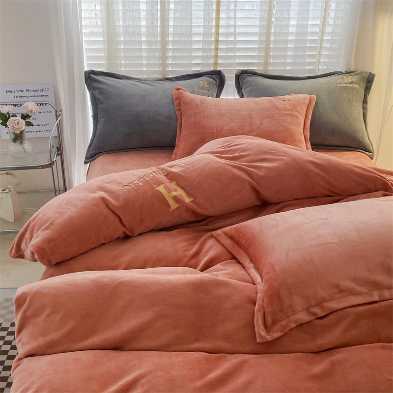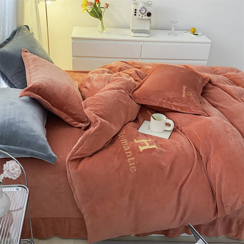 爱洛 2022新款200克7.5斤纯色刺绣花牛奶绒四件套 牛奶绒-活力橙