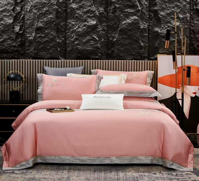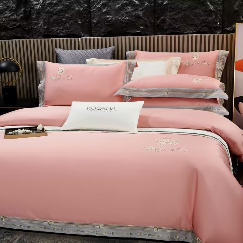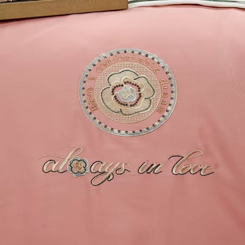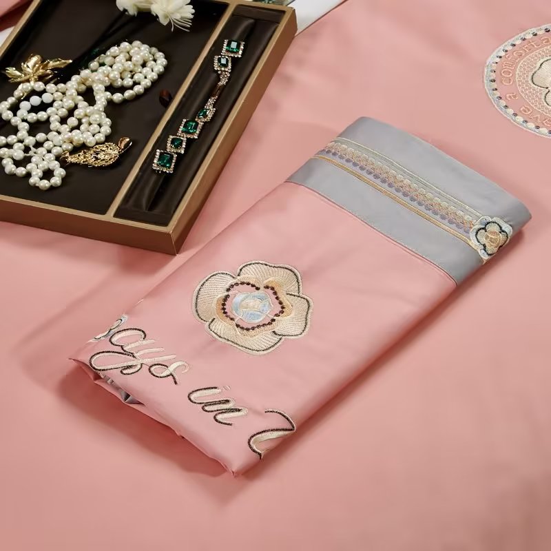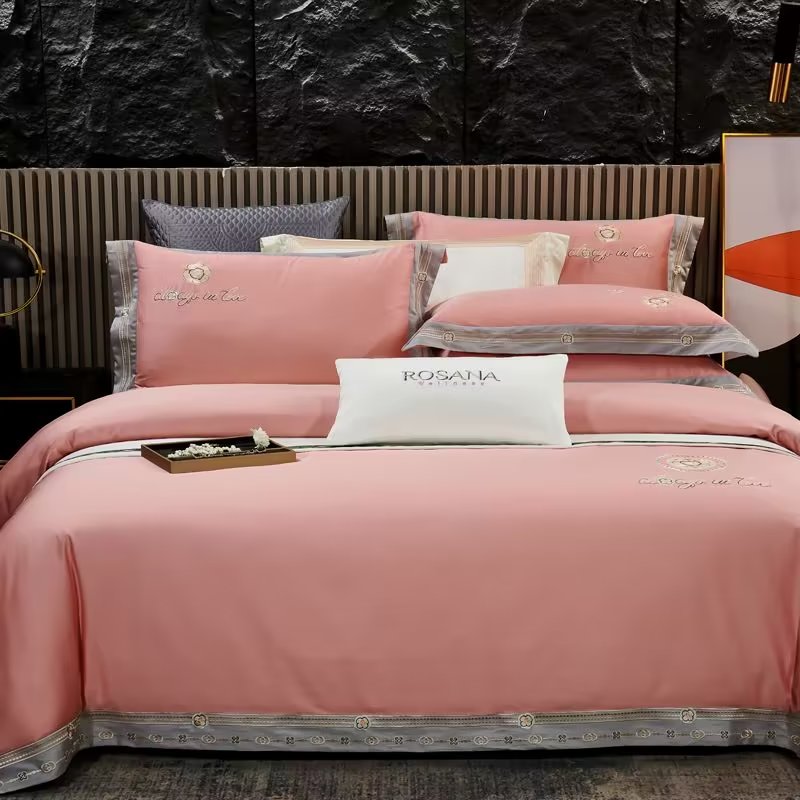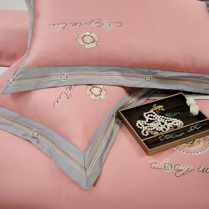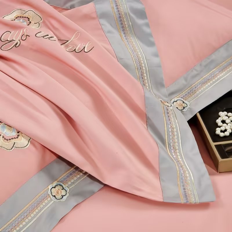U品汇 2023新品120支60S长绒棉宽边刺绣花贡缎纯棉全棉四件套 奢雅-粉豆沙