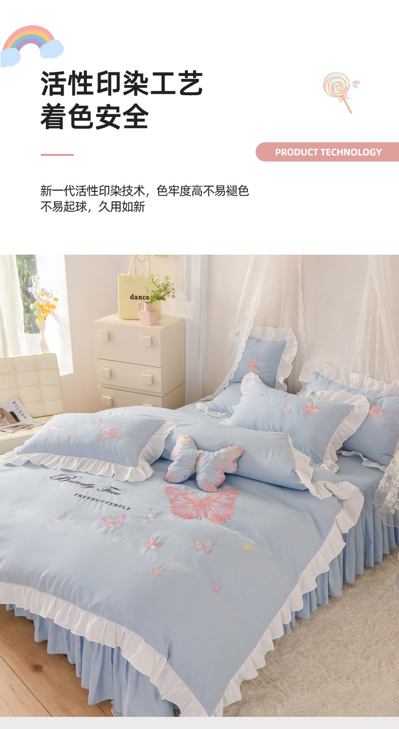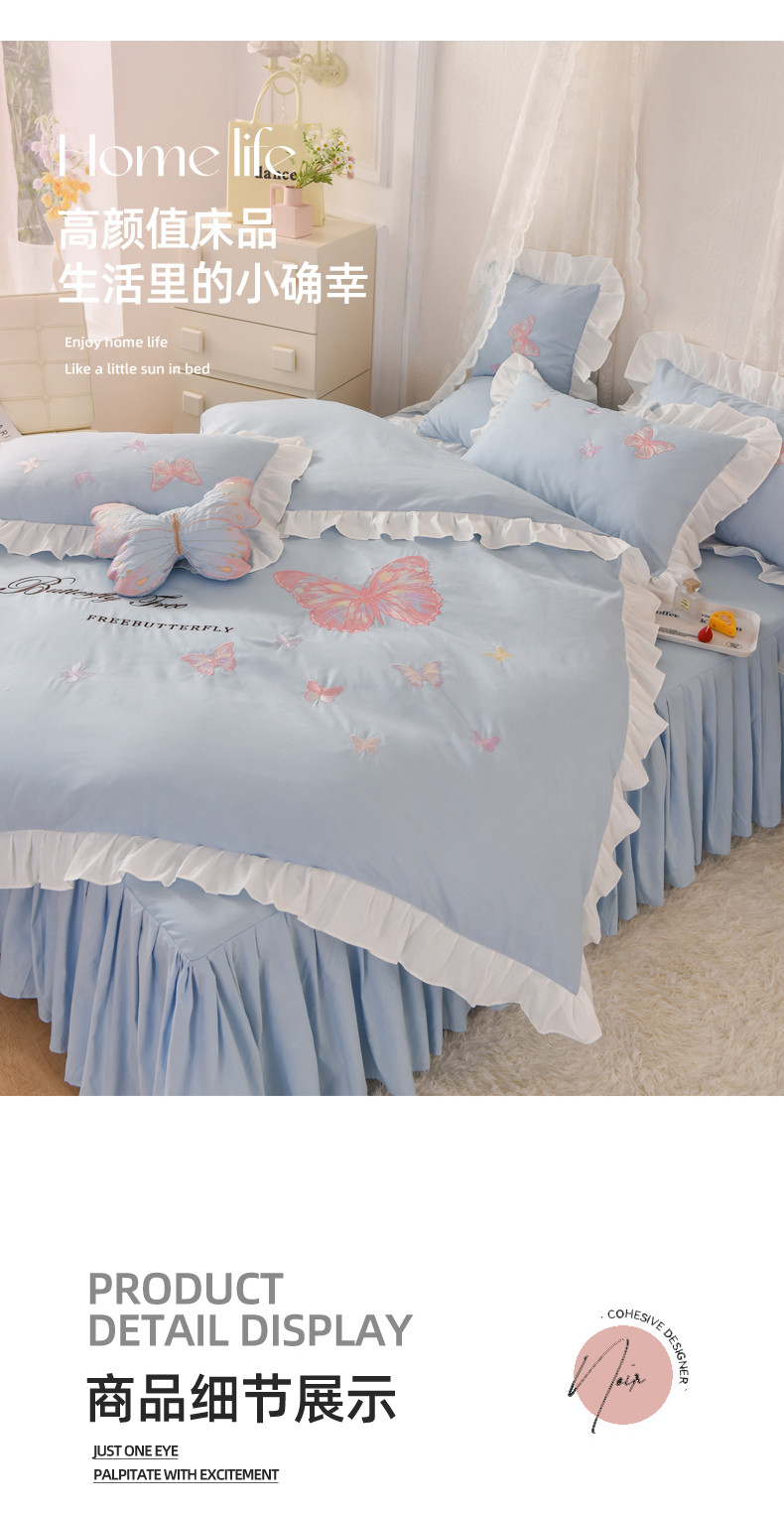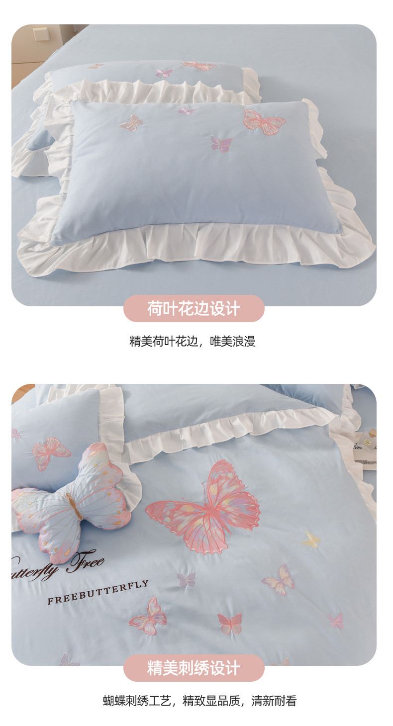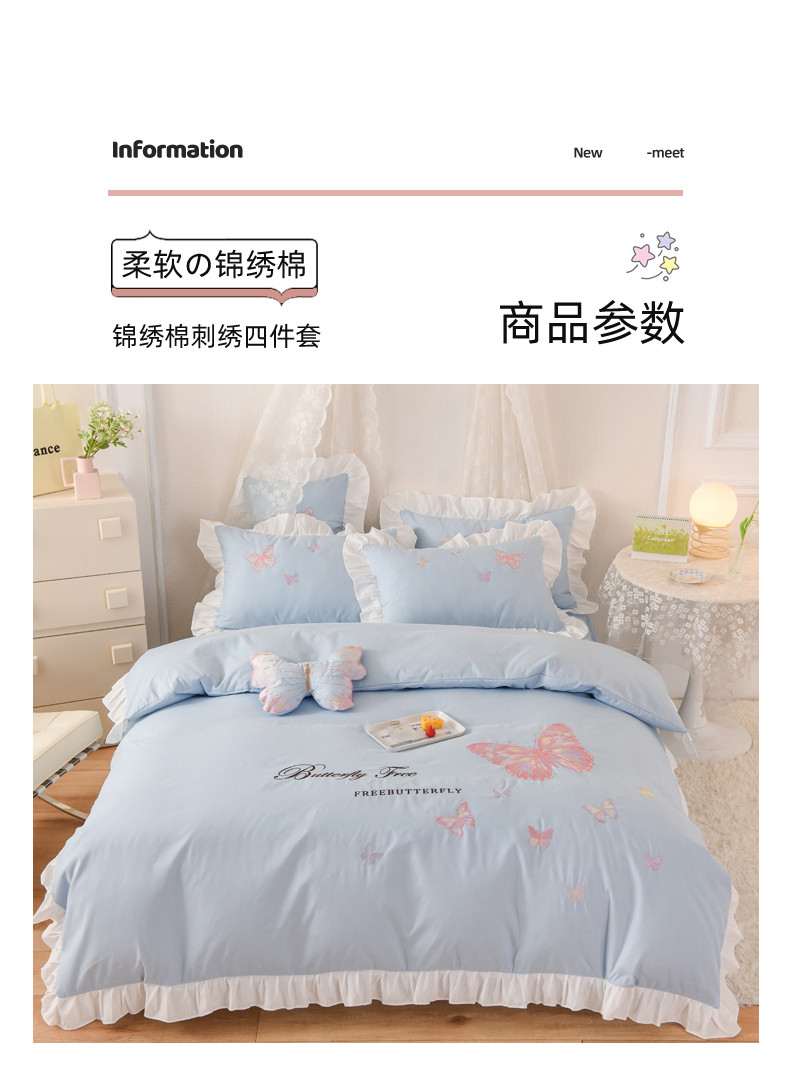 当前位置: 91家纺网 > 商品网购 > 床品套件 > 四件套 > 全棉普通四件套 > 丝印良品 2023新款云锦棉刺绣花边羽蝶系列四件套 羽蝶-慕蓝