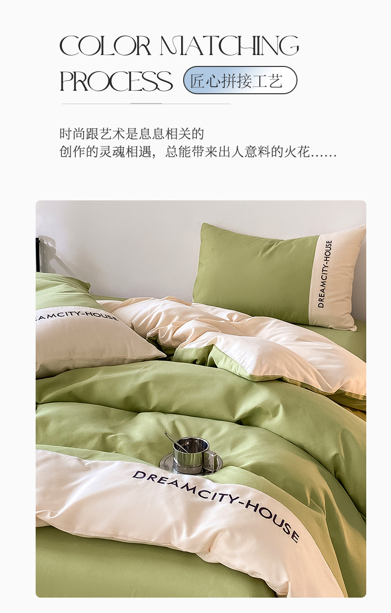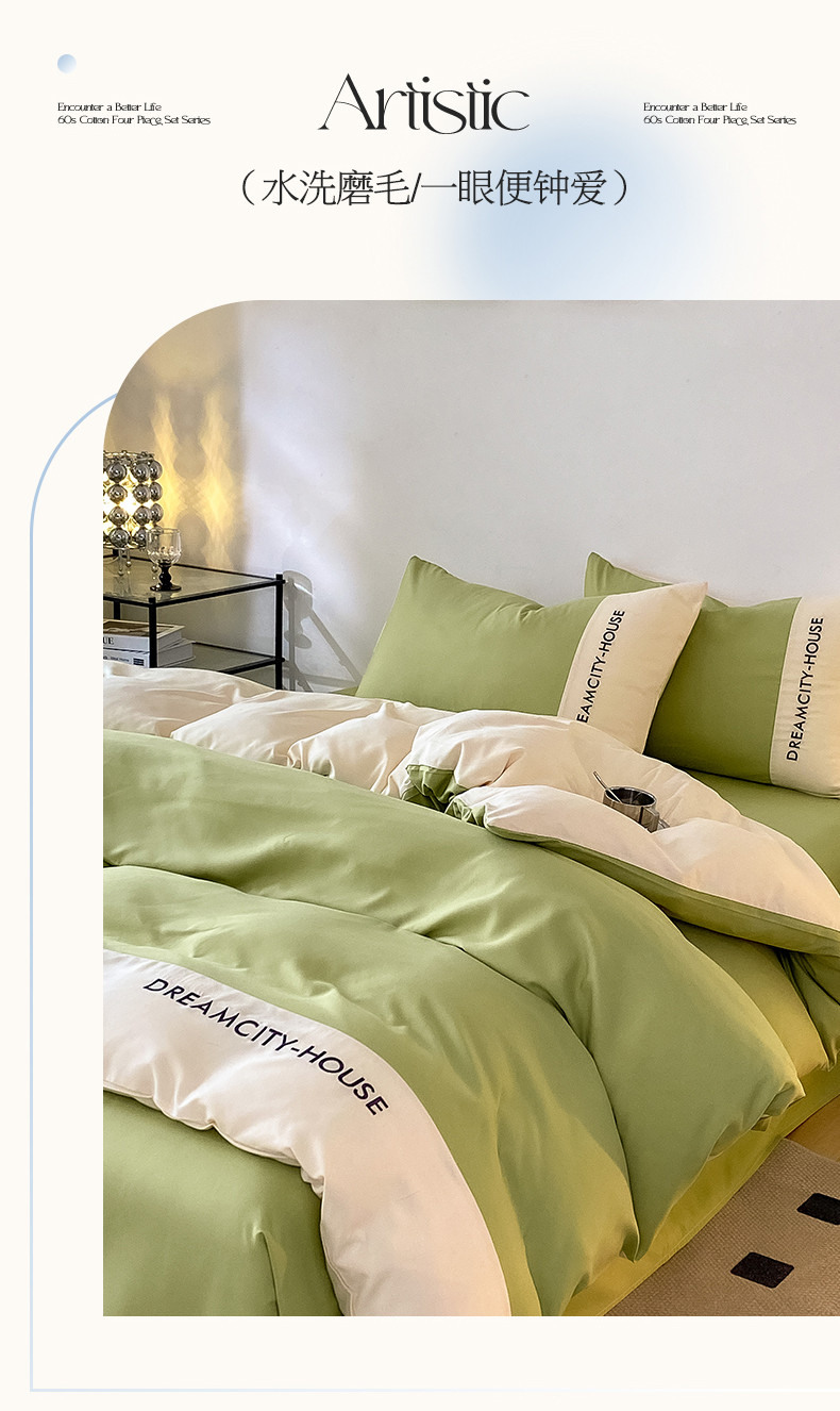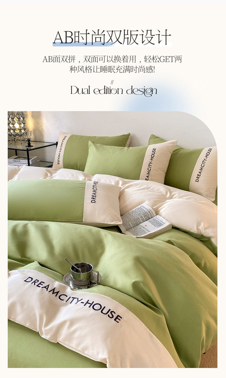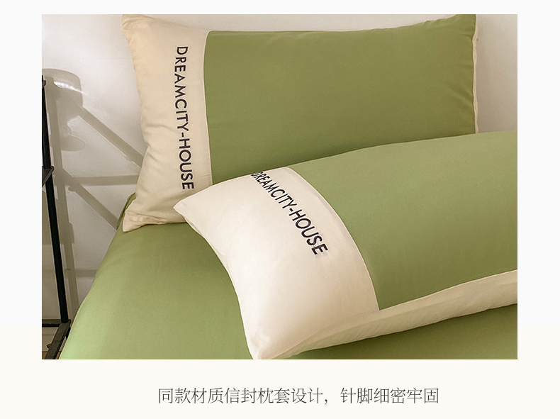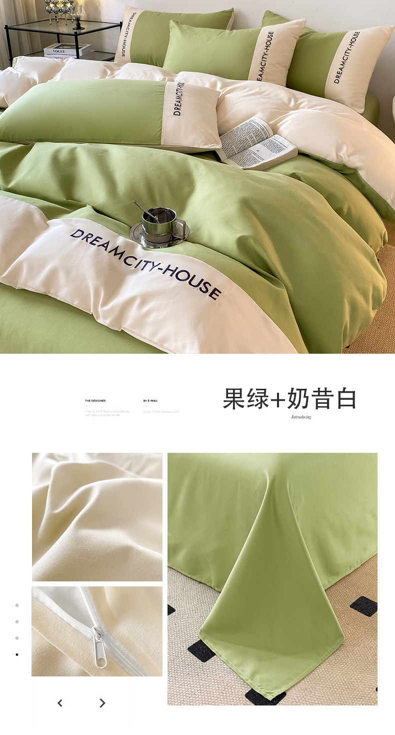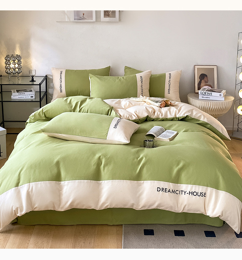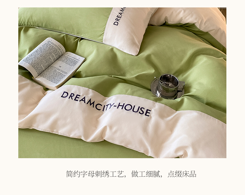 盛秋家纺 2025新款思雅系列水洗磨毛双拼刺绣四件套 思雅-果绿+奶昔白