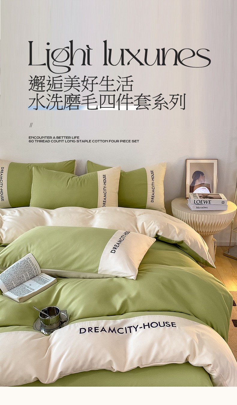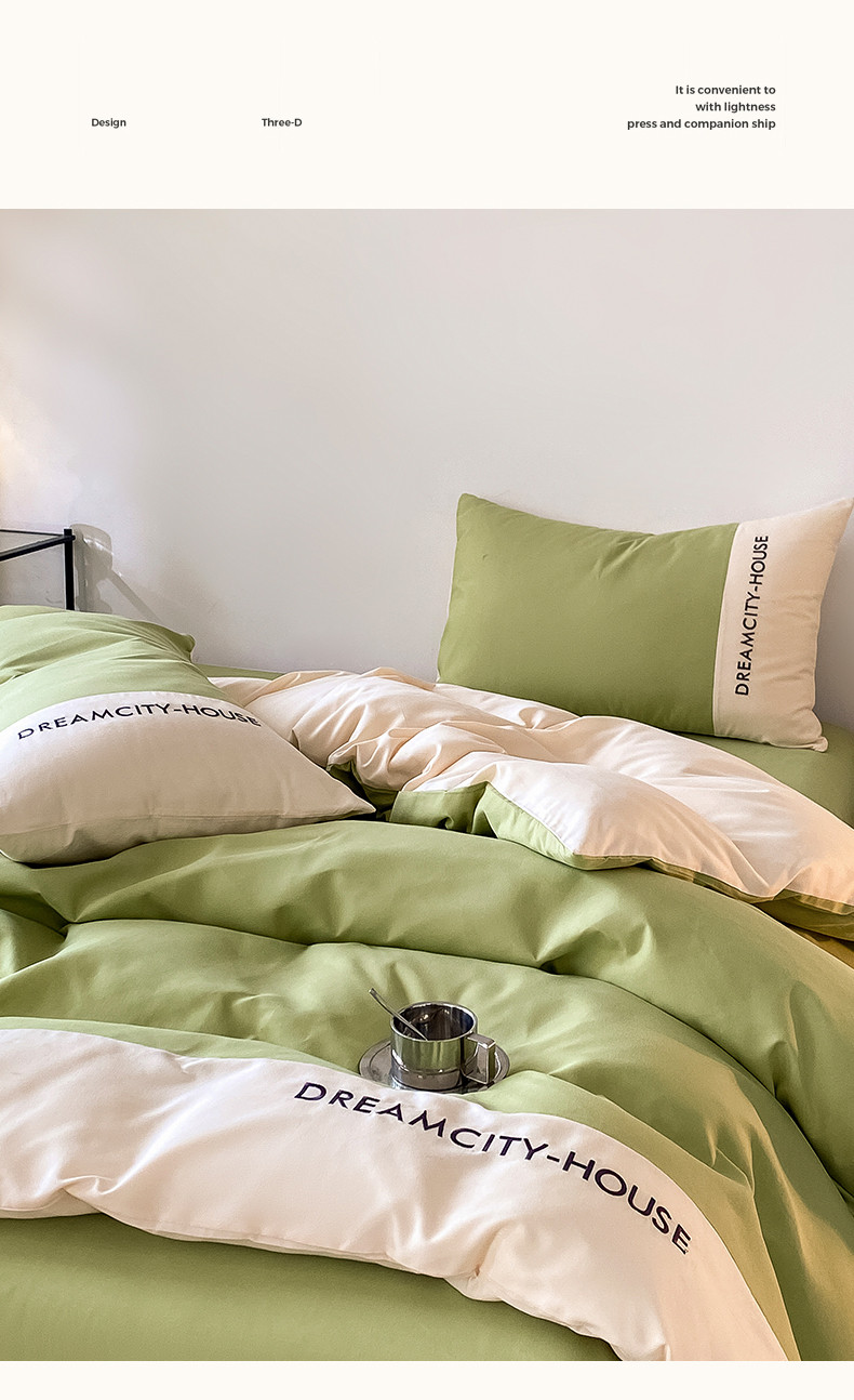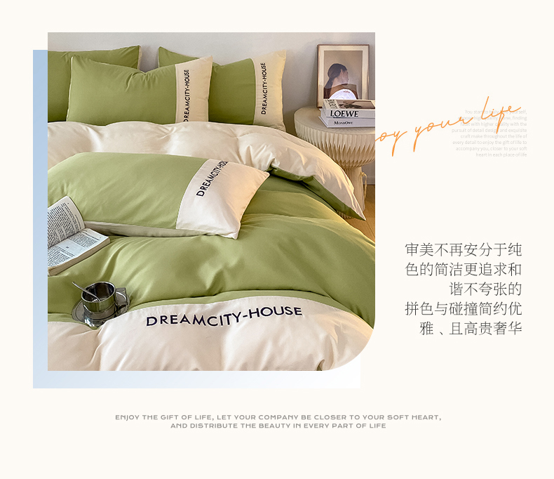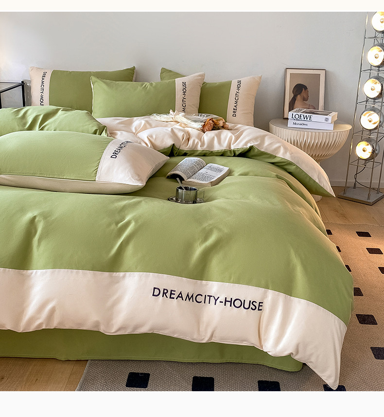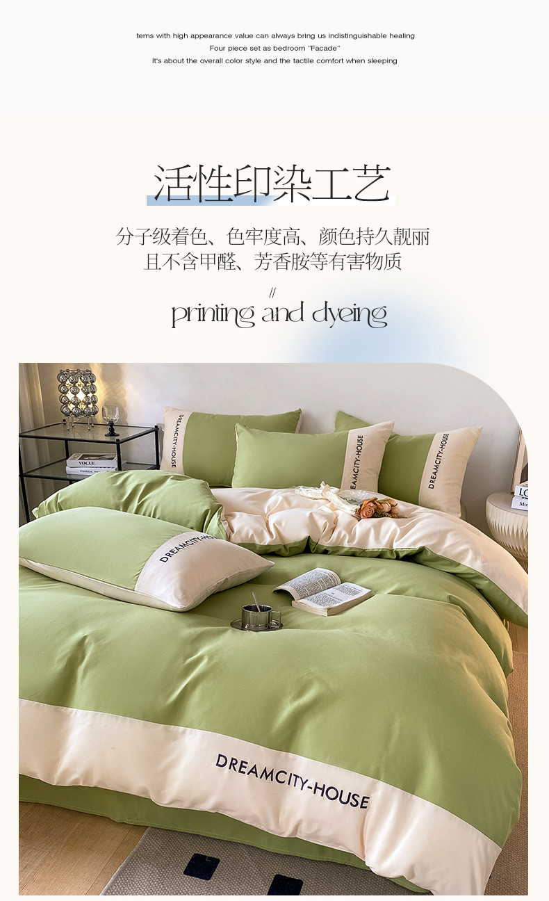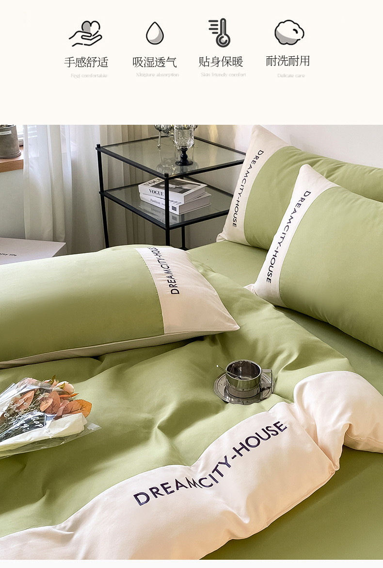 盛秋家纺 2025新款思雅系列水洗磨毛双拼刺绣四件套 思雅-果绿+奶昔白