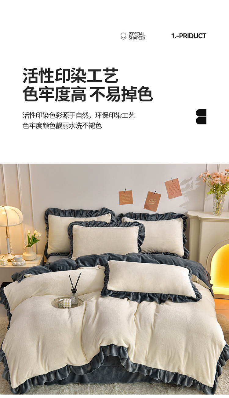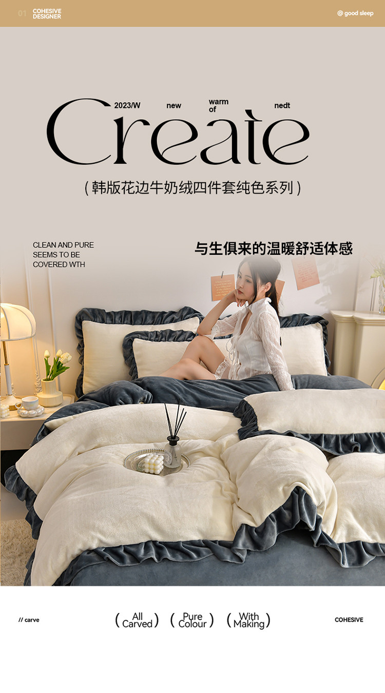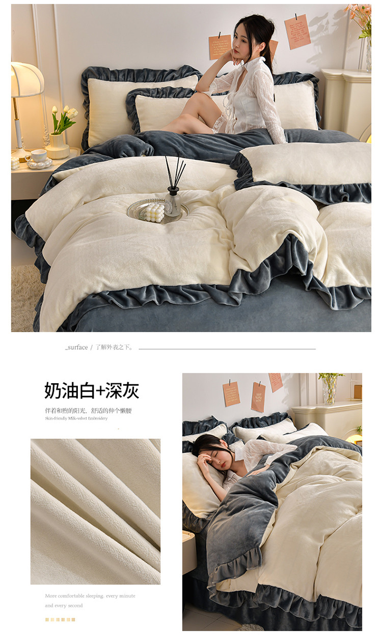 商品名称:妮恒美 2023新款韩版纯色牛奶绒四件套 奶白+深灰