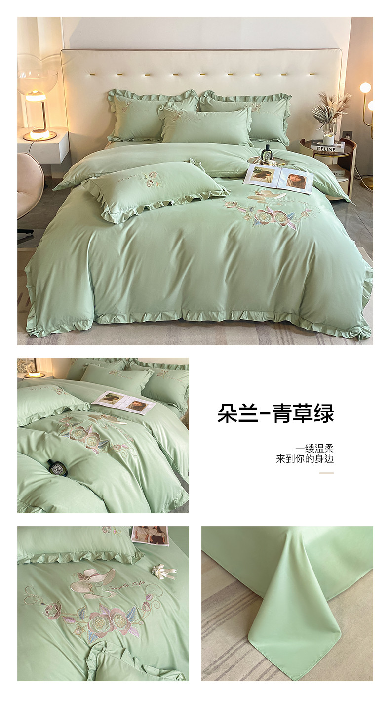 当前位置: 91家纺网 > 商品网购 > 床品套件 > 四件套 > 普通磨毛四件套 > 艺玲 2023新款韩版亲肤磨毛刺绣蕾丝床裙床单如意系列四件套 朵兰-青草绿