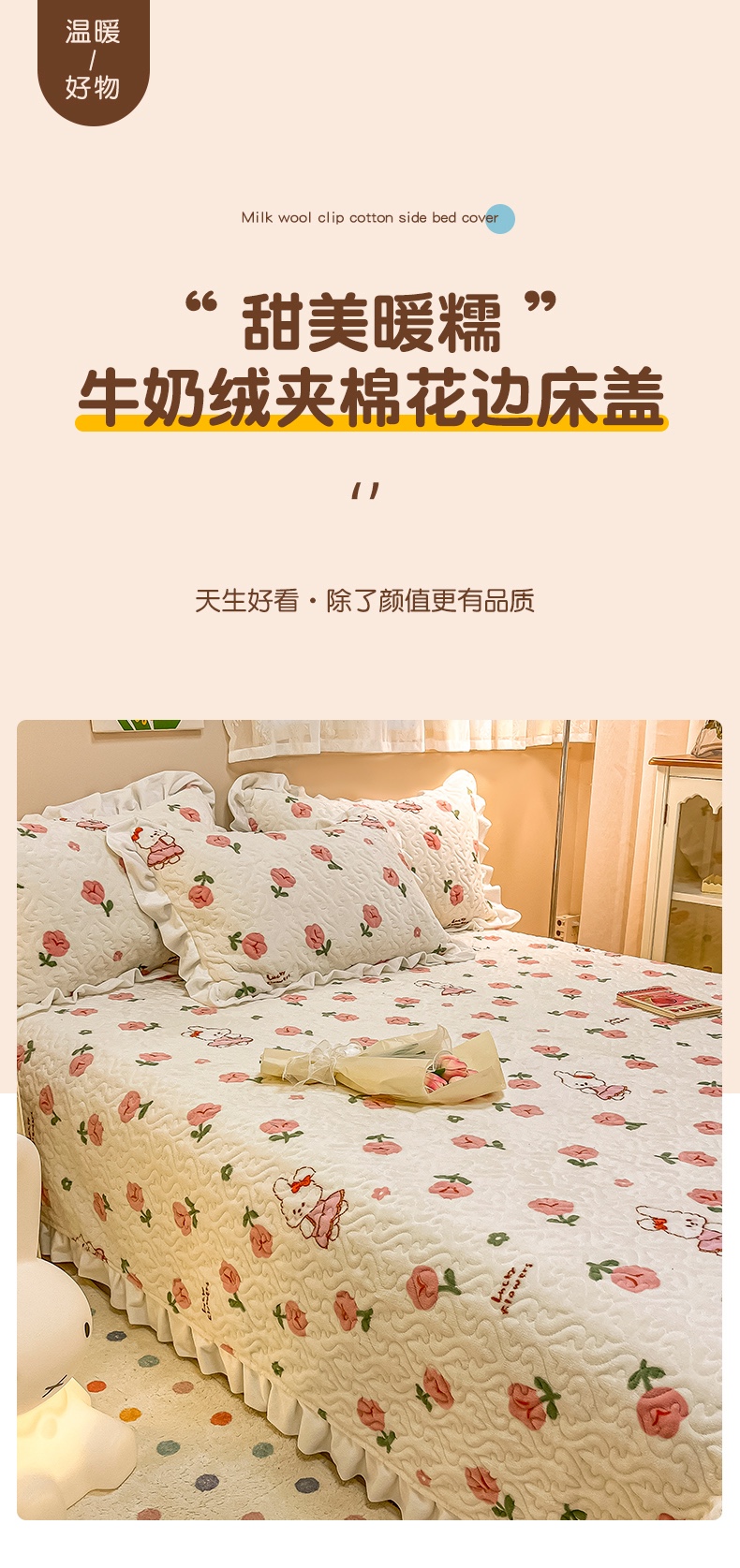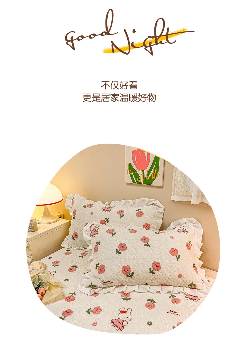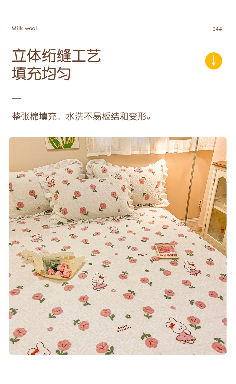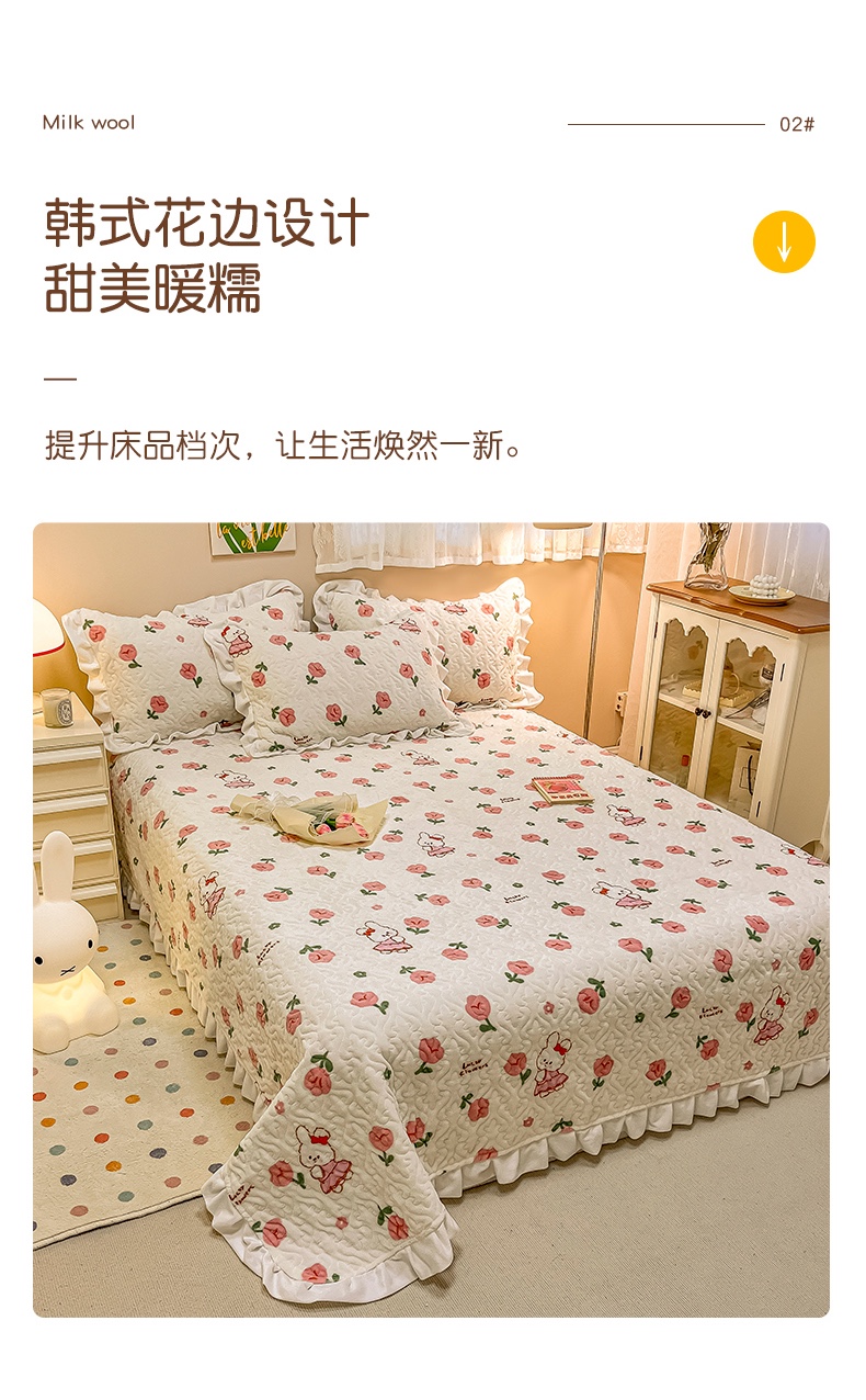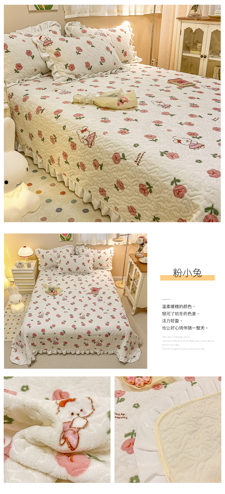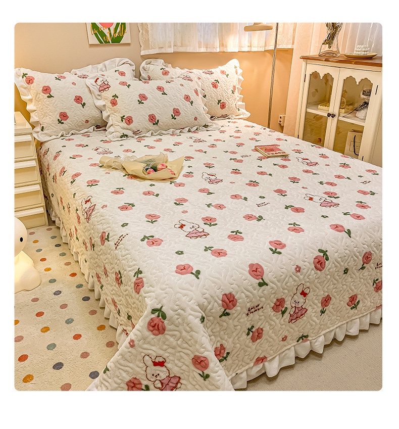 沐辰家居2023新款牛奶绒印花床盖 粉小兔