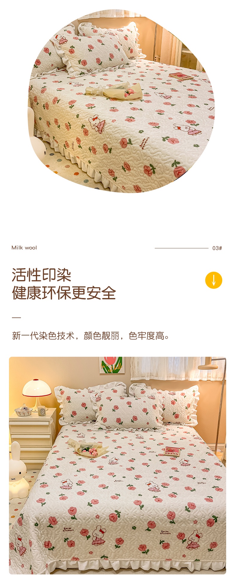 • 91家纺网 家纺一手货源 找家纺 沐辰家居2023新款牛奶绒印花床盖 粉小兔
