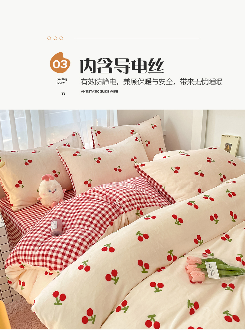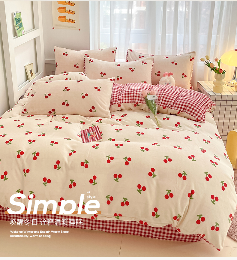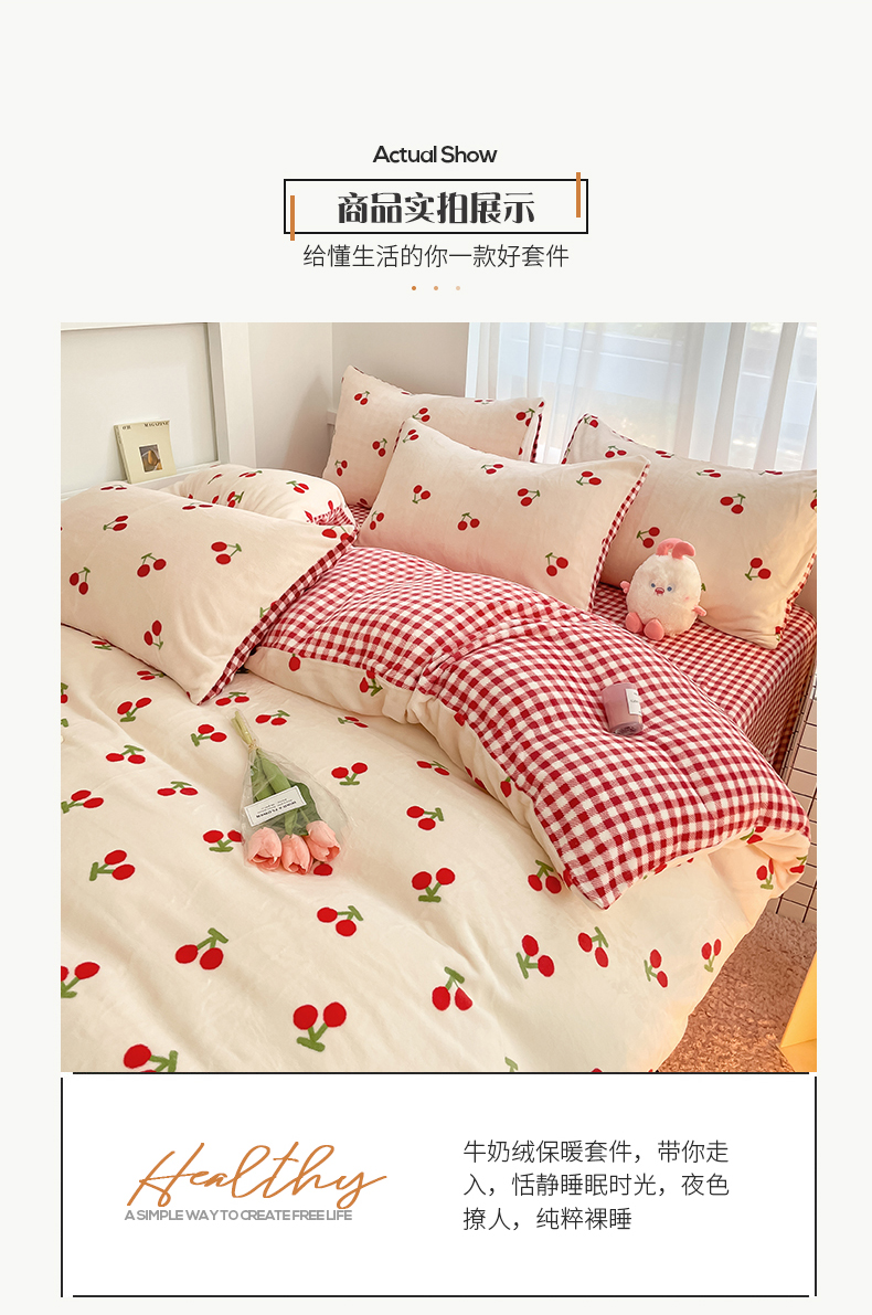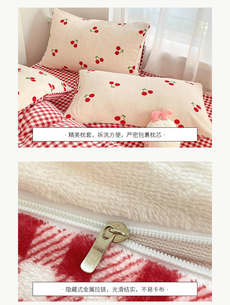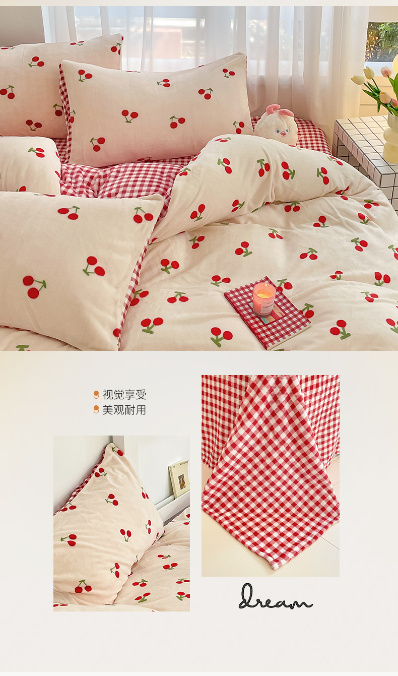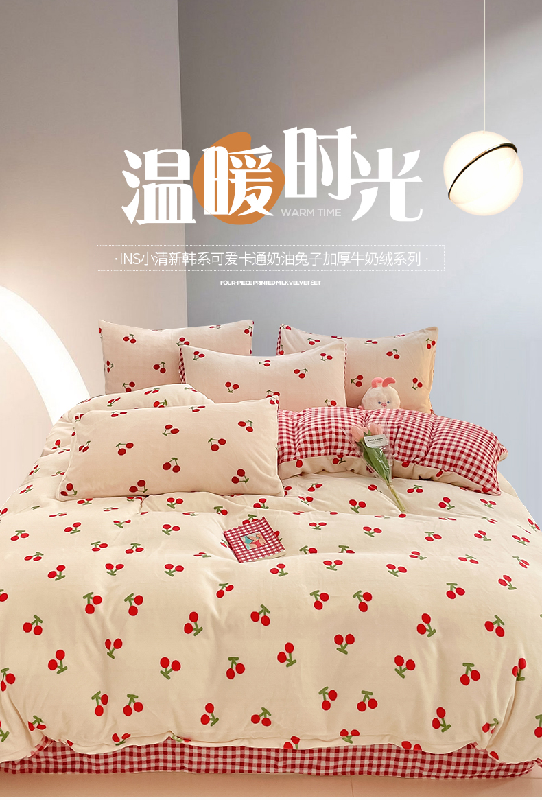 桃子 2023新款ins小清新韩系可爱卡通奶油兔子加厚牛奶绒系列四件套详情第三批 绒-红格樱桃