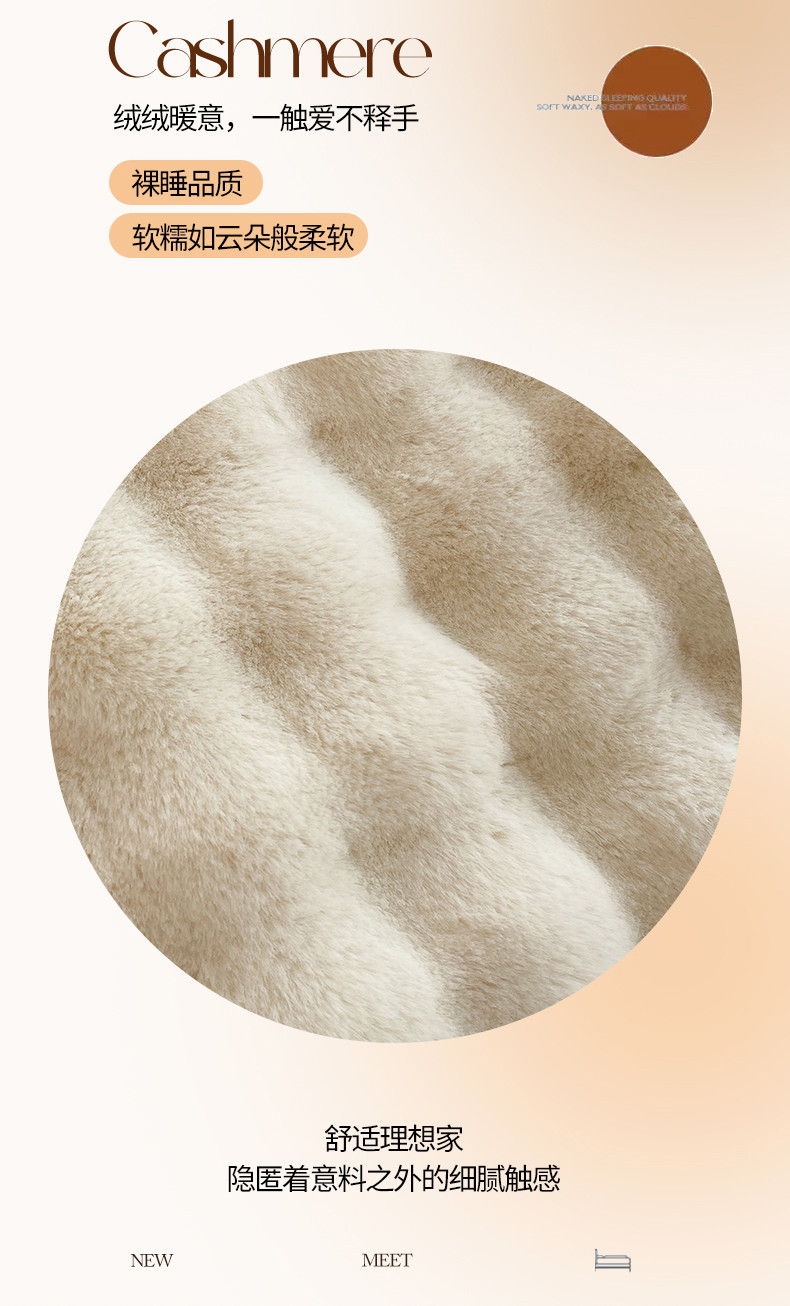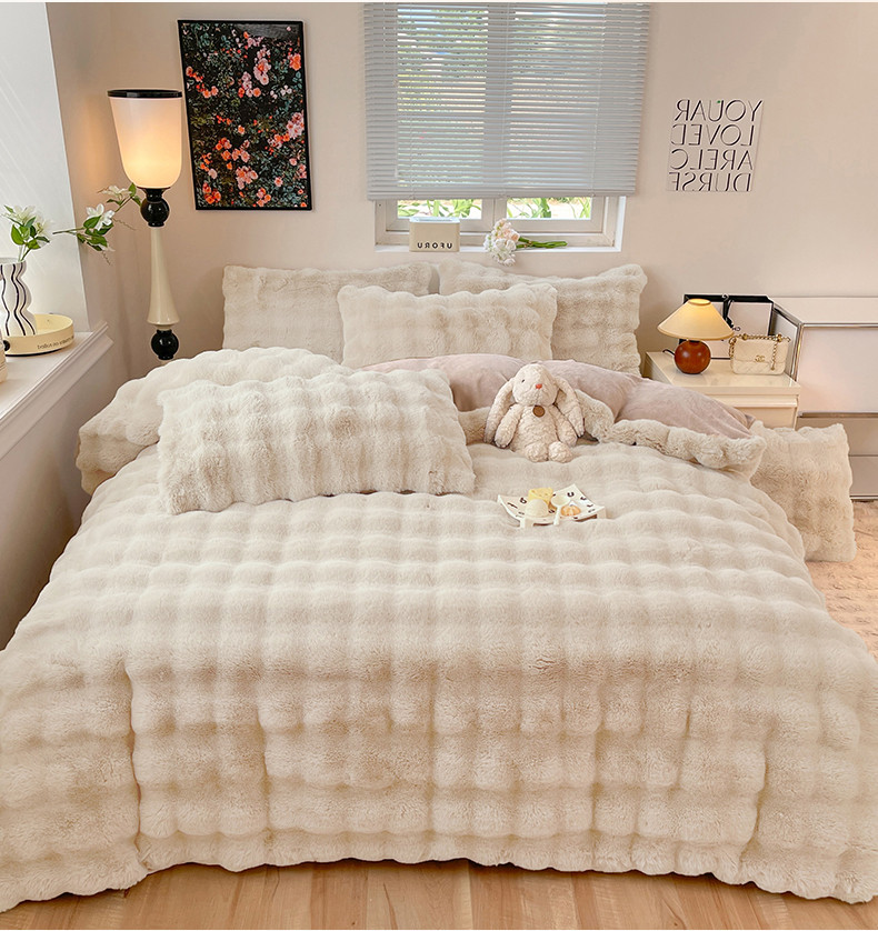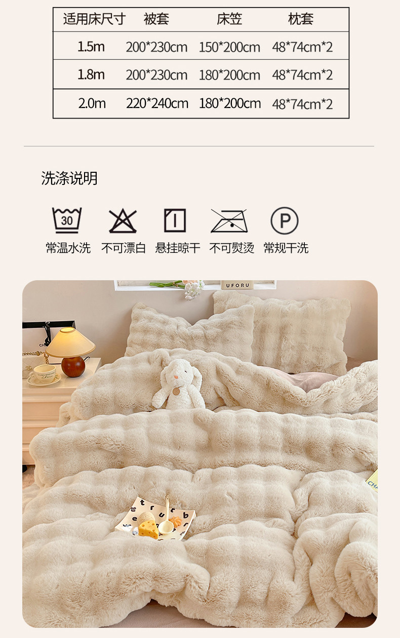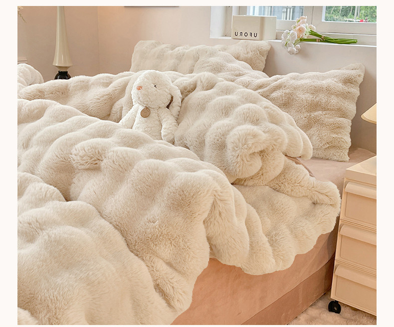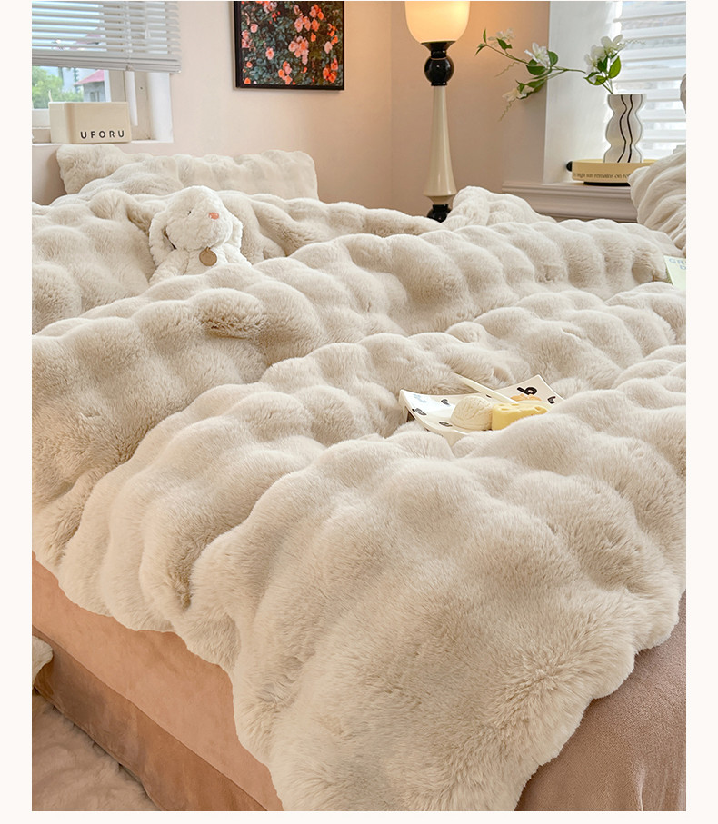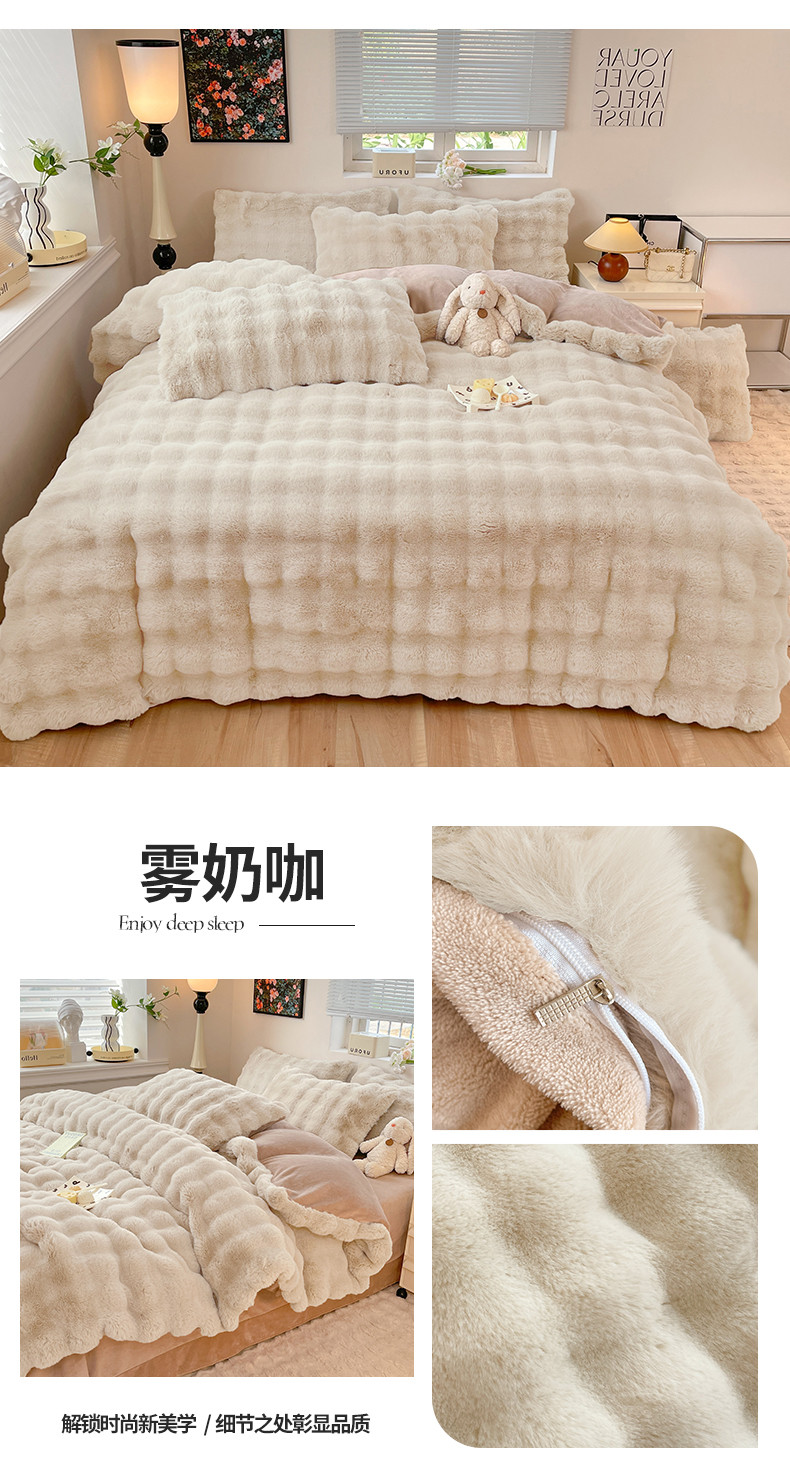 商品名称:2025新款580克托卡斯仿皮草大泡泡兔兔绒牛奶绒四件套 白咖