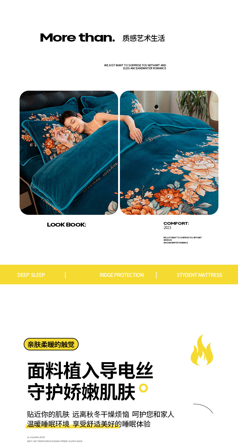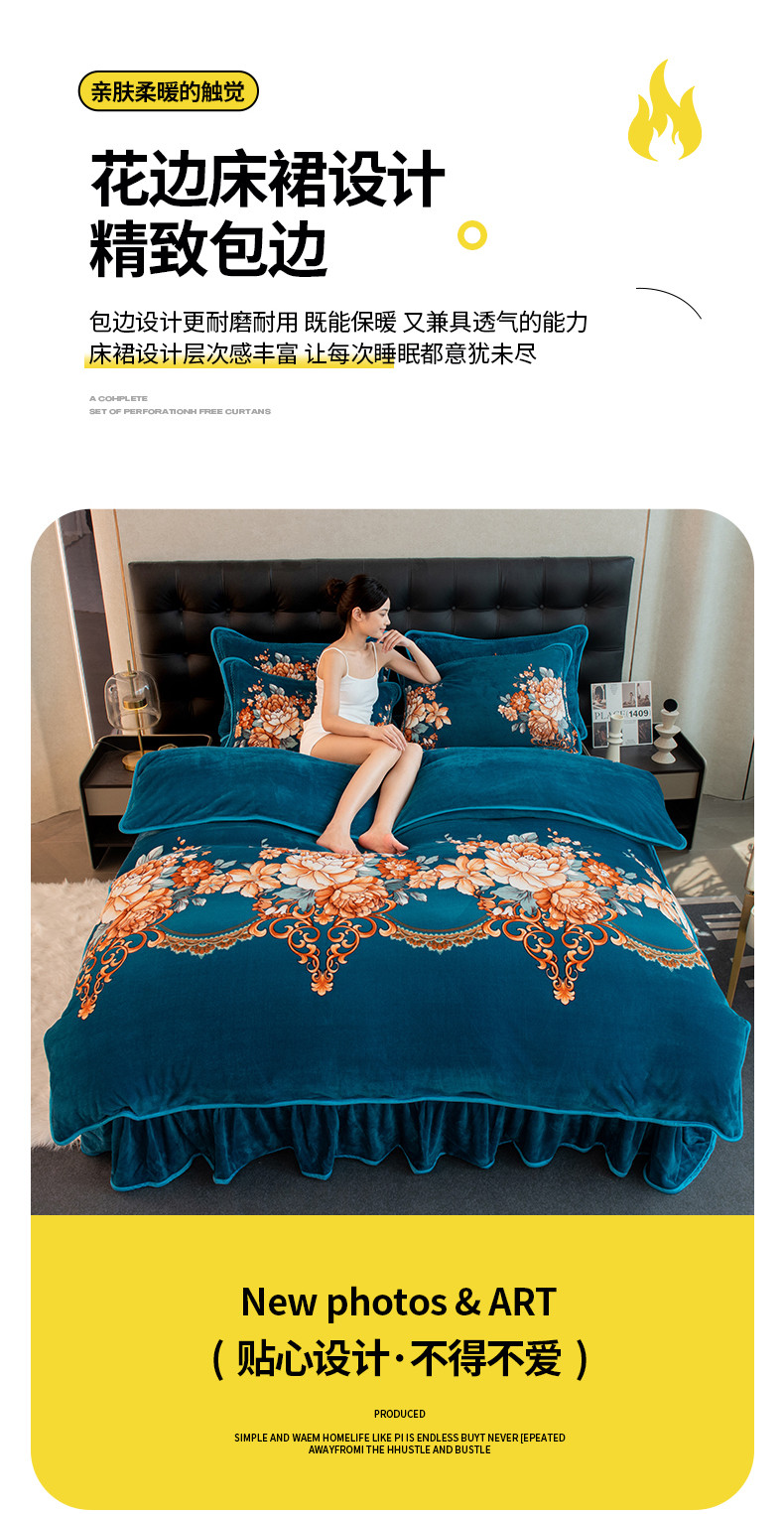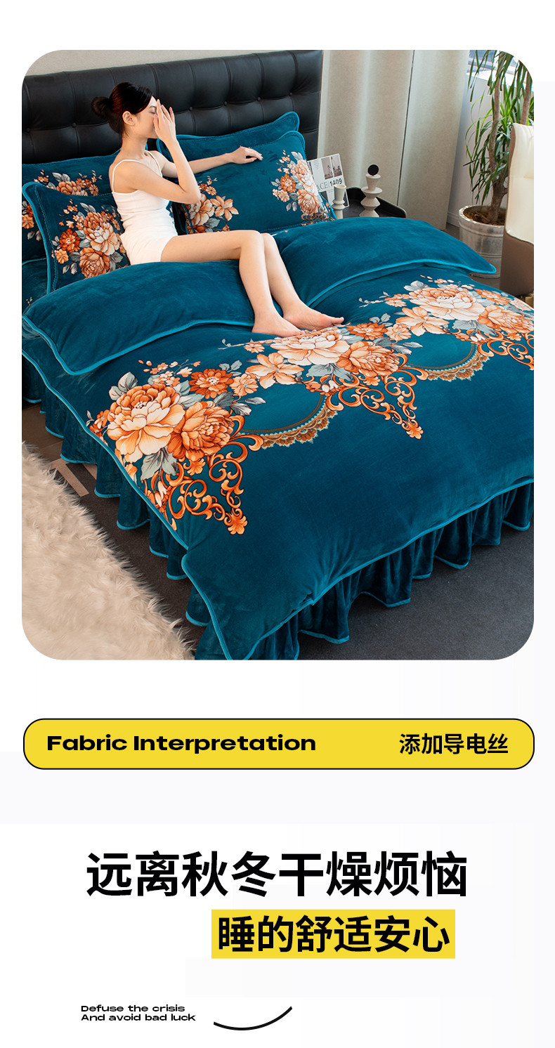 商品名称:2024直播印花8.5斤牛奶绒金貂水晶法莱珊瑚绒四件套床裙款 绿意花海